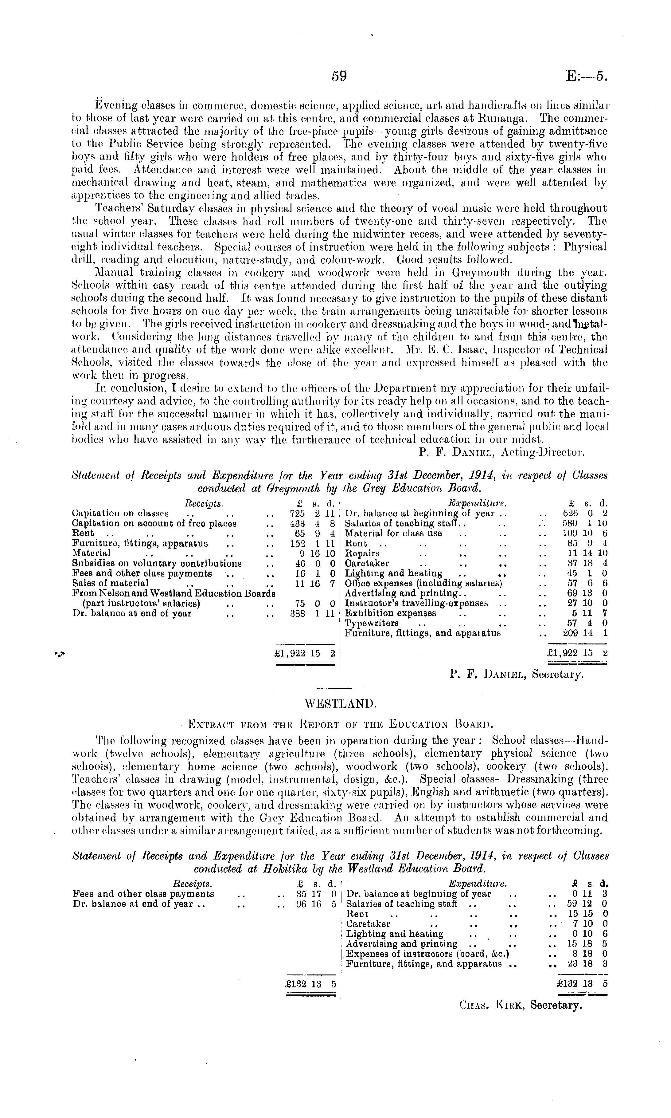 Evening classes in commerce, domestic science, applied science, art and handicrafts on lines similar to those of last year were carried on at this centre, and commercial classes at Runanga. The commercial classes attracted the majority of the free-place pupils young girls desirous of gaining admittance to the Public Service being strongly represented. The evening classes were attended by twenty-five boys and fifty girls who were holders of free places, and by thirty-four boys and sixty-five girls who paid fees. Attendance and interest were well maintained. About the middle of the year classes in mechanical drawing and heat, steam, and mathematics were organized, and were well attended by apprentices to the engineering and allied trades. Teachers' Saturday classes in physical science and the theoiy of vocal music were held throughout the school year. These classes had roll numbers of twenty-one and thirty-seven respectively. The usual winter classes for teachers were held during the midwinter recess, and were attended by seventyeight individual teachers. Special courses of instruction were, held in the following subjects : Physical drill, reading and elocution, nature-study, and colour-work. Good results followed. Manual training classes in cookery and woodwork were held in Greymouth during the year. Schools within easy reach of this centre attended during the first half of the year and the outlying schools during the second half. It was found necessary to give instruction to the pupils of these distant schools for five hours on one day per week, the train arrangements being unsuitable for shorter lessons to be given. The girls received instruction in cookery and dressmaking and the boys in wood- andluetalwork. Considering the long distances travelled by many of (he children to and from this centre, the attendance and quality of the work done were alike excellent. Mr. E. C. Isaac, Inspector of Technical Schools, visited the classes towards the close of the year and expressed himself as pleased with the work then in progress. In conclusion, I desire to extend to the officers of the Department my appreciation for their unfailing courtesy and advice, to the controlling authority for its ready help on all occasions, and to the teaching staff for the successful manner in which it has, collectively and individually, carried out the manifold and in many cases arduous duties required of it, and to those members of the general public and local bodies who have assisted in any r way the furtherance of technical education in our midst. P. F. Daniel, Acting-Director. Statement of Receipts and Expenditure for the. Year ending 31st December, 1914, in respect of Classes conducted at Greymouth by /he Grey Education Board. Receipts. £ s. d. Expenditure. £ s. d. Capitation on classes .. .. .. 725 211 Dr. balance at beginning of year .. .. 626 0 2 Capitation on account of free places .. 433 4 8 Salaries of teaching staff.. .. .'. 580 110 Ront .. .. .. .. .. 65 9 4 Material for class use .. .. .. 109 10 6 Furniture, fittings, apparatus .. .. 152 111 Rent .. .. .. .. .. 85 9 i Material .. .. .. .. 9 16 10 Ropairs .. .. .. .. 11 14 10 Subsidies on voluntary contributions .. 46 0 0 Caretaker .. .. .. .. 37 18 4 Fees and other class payments .. .. 1.6 1 0 Lighting and heating .. .. .. 45 1 0 Sales of material .. .. .. 11 16 7 Office expenses (including salaries) .. 57 6 6 Prom Nelson and Westland Education Boards Advertising and printing.. .. .. 69 13 0 (part instructors' salaries) .. .. 75 0 0 Instructor's travelling-expenses .. .. 27 10 0 Dr. balance at end of year .. .. 388 111 Exhibition oxpenses .. .. .. 511 7 Typewriters .. .. .. .. 57 4 0 Furniture, fittings, and apparatus .. 209 14 1 :* £1,922 15 2 £1,922 15 2 P. F. Daniel, Secretary. WESTLAND. Extract from the Report oe the Education Board. The following recognized classes have been in operation during the year : School classes-- Hanoiwork (twelve schools), elementary agriculture (three schools), elementary physical science (two schools), elementary home science (two schools), woodwork (two schools), cookery (two schools). Teachers' classes in drawing (model, instrumental, design, Sec). Special classes—Dressmaking (three classes for two quarters and one for one quarter, sixty r -six pupils), English and arithmetic (two quarters). The classes in woodwork, cookery, and dressmaking were carried on by instructors whose services were obtained by arrangement with the Grey Education Board. An attempt to establish commercial and other classes under a similar arrangement failed, as a sufficient number of students was not forthcoming. Statement of Receipts and Expenditure for the Year ending 31st December, 1914, in respect of Classes conducted at Hokitika by the Westland Education Board. Receipts. £ s. d. Expenditure. JJ s. d, Foes and other olass payments .. .. 35 17 0 i Dr. balance at beginning of year .. .. 011 3 Dr. balanoe at end of year .. .. .. 96 16 5 Salaries of teaching staff .. .. .. 59 12 0 Rent .. .. .. .. .. 15 15 0 Caretaker .. .. .. 7 10 0 i Lighting and heating .. .. .. 0 10 6 Advertising and printing .. .. .. 15 18 5 Expenses of instructors (board, &c.) .. 818 0 Furniture, fittings, and apparatus .. ~ 23 18 3 £132 13 5 | £132 13 5 Chas. Kirk, Secretary.
