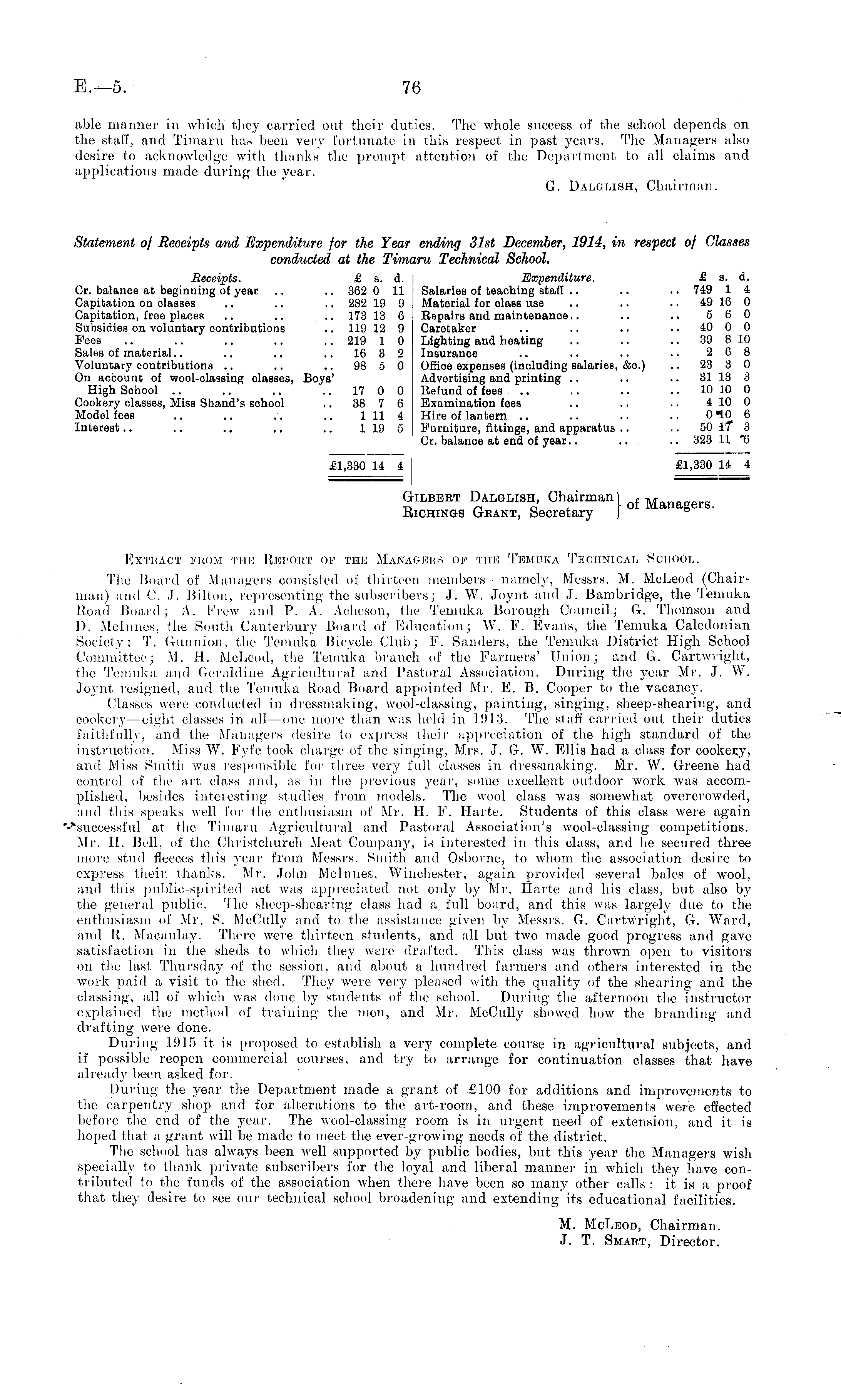 able manner in which they carried out their duties. The whole success of the school depends on the staff, and Timaru has been very fortunate in this respect in past years. The Managers also desire to acknowledge with thanks the prompt attention of the Department to all claims and applications made during the year. G. Dalctjsh, Chairman. Statement of Receipts and Expenditure for the Year ending 31st December, 1914, in respect of Glasses conducted at the Timaru Technical School. Receipts. £ s. d. Expenditure. £ s. d. Cr. balance at beginning of year .. .. 302 0 11 Salaries of teaching staff .. .. .. 749 1 i Capitation on classes .. .. .. 282 19 9 Material for olass use .. .. .. 49 10 0 Capitation, froo places .. .. .. 173 13 0 Repairs and maintenance.. .. .. 5 0 0 Subsidies on voluntary contributions .. 119 12 9 Caretaker .. .. .. 40 0 0 Fees .. .. .. .. .. 219 1 0 Lighting and heating .. .. .. 39 810 Sales of material.. .. .. .. 10 3 2 Insurance .. .. .. .. 2 0 8 Voluntary contributions .. .. .. 98 o 0 Office expenses (including salaries, &c.) .. 23 3 0 On account of wool-classing classos, Boys' Advertising and printing .. .. .. 31 13 3 High Sohool .. .. .. ..1700 Refund of fees .. .. .. 10 10 0 Cookery classes, Miss Shand's school .. 38 7 0 Examination fees .. .. .. 410 0 Model fees .. .. .. .. 1114 Hire of lantern .. .. .. .. 010 0 Interest.. .. .. .. .. 119 5 Furniture, fittings, and apparatus .. .. 50 if 3 Cr. balance at end of year.. .. .. 323 11 *0 £1,330 14 4 £1,330 14 4 Gilbert Dalglish Chairman |f M rs Richings Grant, Secretary ) Extract from: tub Report of the Managers of the Temuka Technical School. The Board of Managers consisted of thirteen members —namely, Messrs. M. McLeod (Chairman) and C. J. Bilton, representing the subscribers; J. W. Joynt and J. Bambridge, the Temuka Road Hoard; A. Frew and P. A. Achesou, the Temuka Borough Council; 0. Thomson and D. Mclnnes, the South Canterbury Board of Education; W. F. Evans, the Temuka Caledonian Society; T. Gunnion, the Temuka Bicycle Club; F. Sanders, the Temuka District High School Committee; M. H. McLeod, the Temuka branch of the Farmers' Union; and (i. Cartwright, the Temuka and Geraldine Agricultural and Pastoral .Association. During the year Mr. J. W. Joynt resigned, and the Temuka Road Board appointed Mr. E. B. Cooper to the vacancy. Classes were conducted in dressmaking, wool-classing, painting, singing, sheep-shearing, and cookery—eight classes in all—one more than was held in 1913. The staff carried out their duties faithfully, and the Managers desire io express their appreciation of the high standard of the instruction. Miss W. Fyfe took charge of the singing, Mrs. J. G. W. Ellis had a class for cookery, and Miss Smith was responsible for three very full classes in dressmaking. Mr. W. Greene had control of the art class and, as in the previous year, some excellent outdoor work was accomplished, besides interesting studies from models, 'lire wool class was somewhat overcrowded, and this speaks well for the enthusiasm of Mr. H. F. Harte, Students of this class were again at the Timaru Agricultural and Pastoral Association's wool-classing competitions. Mr. 11. Bell, of the Christchurch Meat Company, is interested in this class, and he secured three more stud fleeces this year from Messrs. Smith and Osborne, to whom the association desire to express their thanks. Mr. John Mclnnes, Winchester, again provided several bales of wool, and this public-spirited act was appreciated not only by Mr. Harte and his class, but also by the general public. Ihe sheep-shearing class had a full board, and this was largely due to the enthusiasm of Mr. S. McCully and to the assistance given by Messrs. G. Cartwright, G. Ward, and R. Macaulay. There were thirteen students, and all but two made good progress and gave satisfaction in the sheds to which they were drafted. This olass was thrown open to visitors on the last, Thursday of the session, and about a hundred farmers and others interested in the work paid a visit to the shed. They were very pleased with the quality of the shearing and the classing, all of which was done by students of the school. During the afternoon the instructor explained the method of training the men, and Mr. McCully showed how the branding and drafting were done. During 1915 it is proposed to establish a very complete course in agricultural subjects, and if possible reopen commercial courses, and try to arrange for continuation classes that have already been asked for. During the year the Department made a grant of £100 for additions and improvements to the carpentry shop and for alterations to the art-room, and these improvements were effected before the end of the year. The wool-classing room is in urgent need of extension, and it is hoped that a grant will be made to meet the ever-growing needs of the district. The school has always been well supported by public bodies, but this year the Managers wish specially to thank private subscribers for the loyal and liberal manner in which they have contributed to the funds of the association when there have been so many other calls : it is a proof that they desire to see our teohnical school broadening and extending its educational facilities. M. McLeod, Chairman. J. T. Smart, Director.