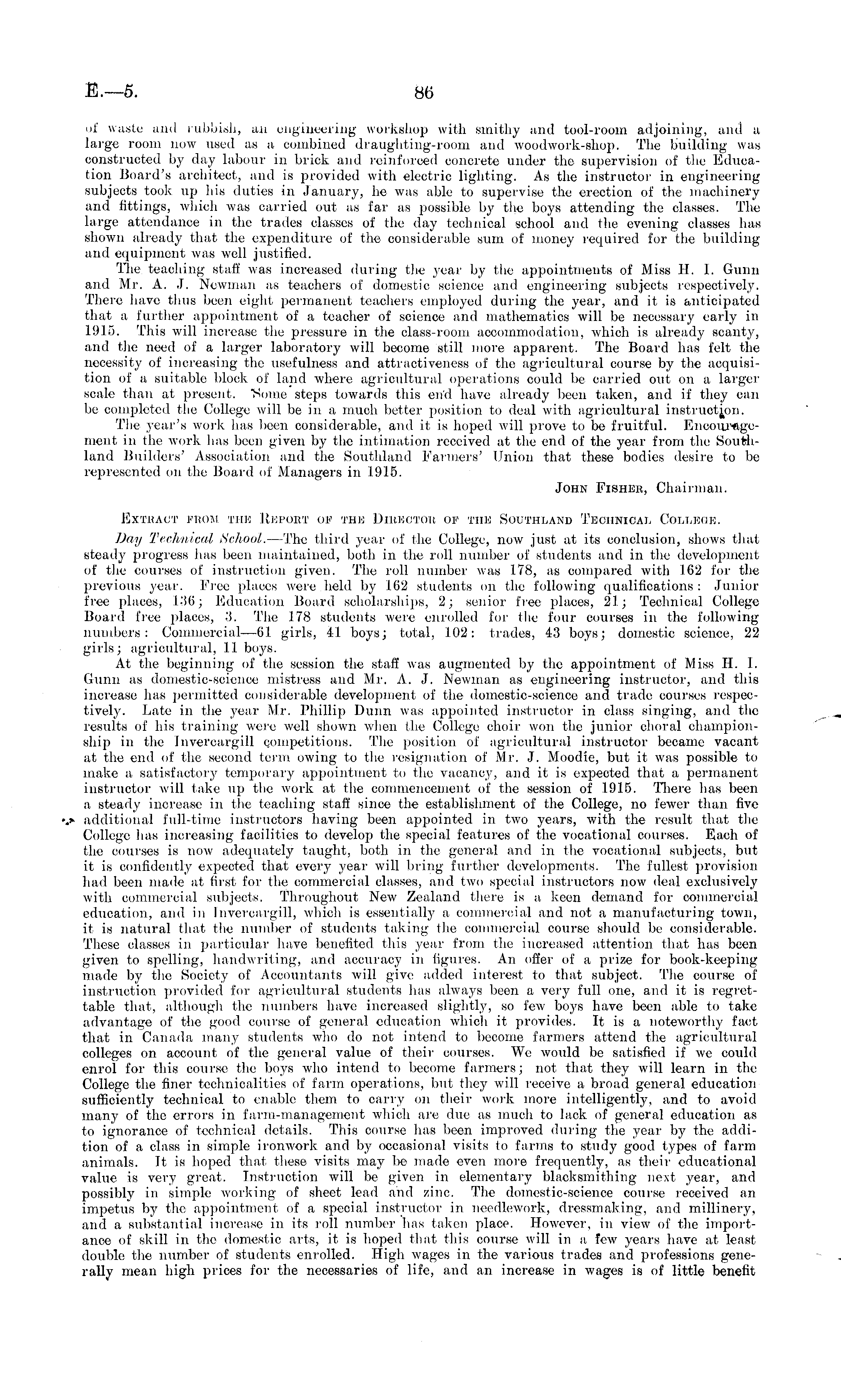 of waste and rubbish, an engineering workshop with smithy and tool-room adjoining, and a large room now used as a combined draughting-room and woodwork-shop. The building was constructed by day labour in brick and reinforced concrete under the supervision of the Education Board's architect, and is provided with electric lighting. As the instructor in engineering subjects took up his duties in January, he was able to supervise the erection of the machinery and fittings, which was carried out as far as possible by the boys attending the classes. The large attendance in the trades classes of the day technical school and the evening classes has shown already that the expenditure of the considerable sum of money required for the building and equipment was well justified. The teaching staff was increased during the year by the appointments of Miss H. 1. Gunn and Mr. A. J. Newman as teachers of domestic science and engineering subjects respectively. There have thus been eight permanent teachers employed during the year, and it is anticipated that a further appointment of a teacher of science and mathematics will be necessary early in 1915. This will increase the pressure in the class-room accommodation, which is already scanty, and the need of a larger laboratory will become still more apparent. The Board has felt the necessity of increasing the usefulness and attractiveness of the agricultural course by the acquisition of a suitable block of land where agricultural operations could be carried out on a larger scale than at present. 'Some steps towards this end have already been taken, and if they can be completed the College will be in a much better position to deal with agricultural instruction. The year's work has been considerable, and it is hoped will prove to bo fruitful. Enooitr«gement in the work has been given by the intimation received at the end of the year from the Southland Builders' Association and the Southland Farmers' Union that these bodies desire to be represented on the Board of Managers in 1915. John Fisher, Chairman. Extract from the Report of the Director of the Southland Technical College. Day Technical School. —The third year of the College, now just at its conclusion, shows that steady progress has been maintained, both in the roll number of students and in the development of the courses of instruction given. The roll number was 178, as compared with 162 for the previous year. Free places were held by 162 students on the following qualifications : Junior free places, 136 j Education Board scholarships, 2; senior free places, 21; Technical College Board free places, 3. The 178 students were enrolled for the four courses in the following numbers: Commercial—6l girls, 41 boys; total, 102: trades, 4-3 boys; domestic science, 22 girls; agricultural, 11 boys. At the beginning of the session the staff was augmented by the appointment of Miss 11. I. Gunn as domestic-science mistress and Mr. A. J. Newman as engineering instructor, and this increase has permitted considerable development of the domestic-science and trade courses respectively. Late in the year Mr. Phillip Dunn was appointed instructor in class singing, and the results of his training were well shown when the College choir won the junior choral championship in the Invercargill competitions. The position of agricultural instructor became vacant at the end of the second term owing to the resignation of Mr. J. Moodie, but it was possible to make a satisfactory temporary appointment to the vacancy, and it is expected that a permanent instructor will take up the work at the commencement of the session of 1915. There litis been a, steady increase in the teaching staff since the establishment of the College, no fewer than five p additional full-time instructors having been appointed in two years, with the result that the College has increasing facilities to develop the special features of the vocational courses. Each of the courses is now adequately taught, both in the general and in the vocational subjects, but it is confidently expected that everjr year will bring further developments. The fullest provision had been made at first for the commercial classes, and two special instructors now deal exclusively with commercial subjects. Throughout New Zealand there is a keen demand for commercial education, and in Invercargill, which is essentially a commercial and not a manufacturing town, it is natural that the number of students taking the commercial course should be considerable. These classes in particular have benefited this year from the increased attention that has been given to spelling, handwriting, and accuracy in figures. An offer of a prize for book-keeping made by the Society of Accountants will give added interest to that subject. The course of instruction provided for agricultural students has always been a very full one, and it is regrettable that, although the numbers have increased slightly, so few boj's have been able to take advantage of the good course of general education which it provides. It is a noteworthy fact that in Canada many students who do not intend to become farmers attend the agricultural colleges on account of the general value of their courses. We would be satisfied if we could enrol for this course the boys who intend to become farmers; not that they will learn in the College the finer technicalities of farm operations, but they will receive a broad general education sufficiently technical to enable them to carry on their work more intelligently, and to avoid many of the errors in farm-management which are due as much to lack of general education as to ignorance of technical details. This course has been improved during the year by the addition of a class in simple ironwork and by occasional visits to farms to study good types of farm animals. It is hoped that these visits may be made even more frequently, as their educational value is very great. Instruction will be given in elemen