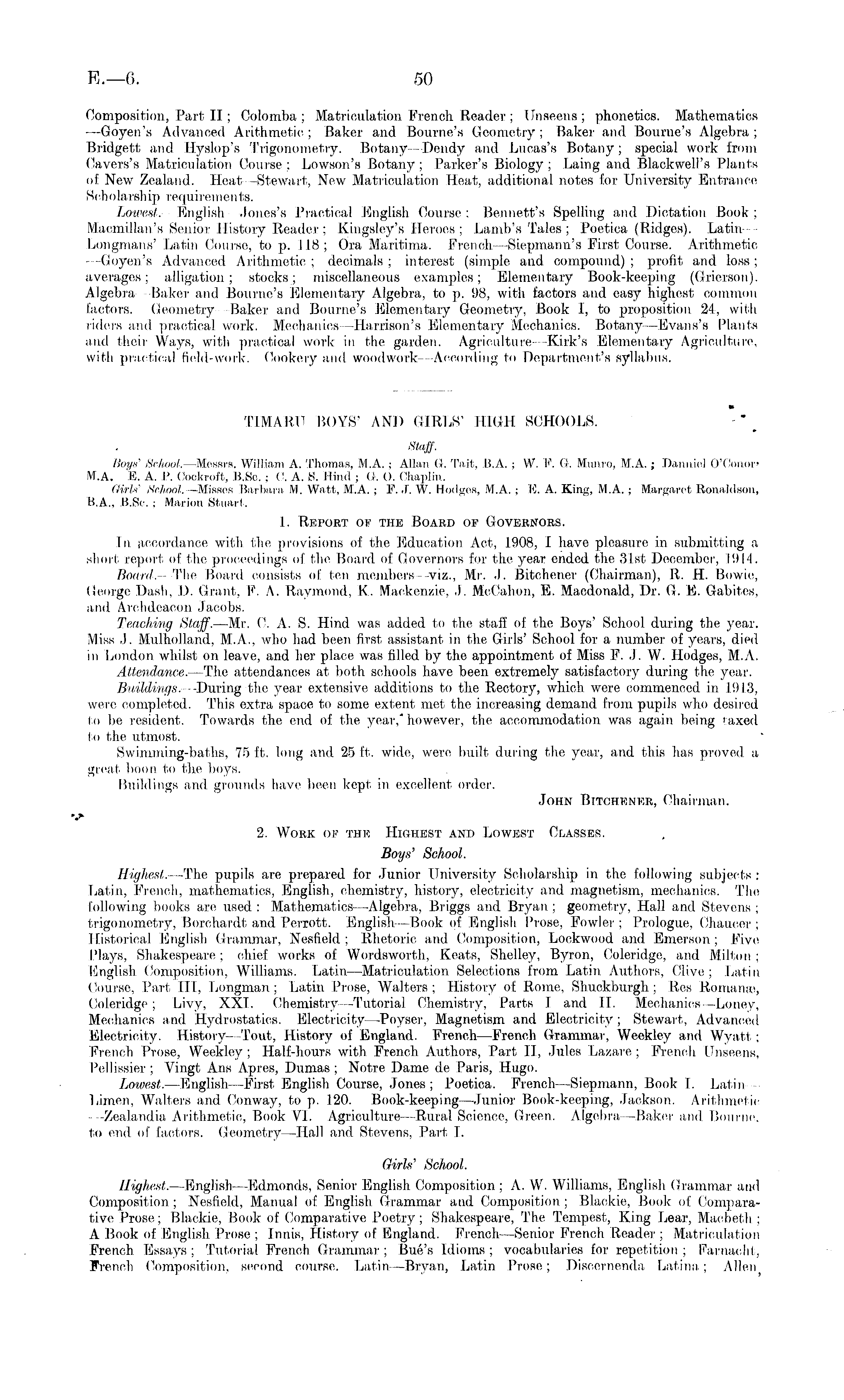Composition, Part II; Colomba ; Matriculation French Reader ; Unseens; phonetics. Mathematics —Goyen's Advanced Arithmetic ; Baker and Bourne's Geometry ; Baker and Bourne's Algebra ; Bridgett and Hyslop's Trigonometry. Botany— Dendy and Lucas's Botany; special work from Cavers's Matriculation Course ; Lowson's Botany ; Parker's Biology ; Laing and Blackwell's Plants of New Zealand. Heat -Stewart, New Matriculation Heat, additional notes for University Entrance Scholarship requirements. Lowest. English Jones's Practical English Course ; Bennett's Spelling and Dictation Book ; Macmillan's Senior History Reader ; Kingsley's Heroes ; Lamb's Tales ; Poetica (Ridges). Latin Longmans' Latin Course, to p. 118; Ora Maritima. French- Siepmann's First Course. Arithmetic --Goyen's Advanced Arithmetic ; decimals ; interest (simple and compound) ; profit and loss ; averages; alligation; stocks; miscellaneous examples; Elementary Book-keeping (Grierson). Algebra -Baker and Bourne's Elementary Algebra, to p. 98, with factors and easy highest common factors. Geometry Baker and Bourne's Elementary Geometry, Book I, to proposition 24, with riders and practical work. Mechanics —Harrison's Elementary Mechanics. Botany —Evans's Plants and their Ways, with practical work in the garden. Agriculture- -Kirk's Elementary Agriculture, with practical field-work. Cookery and woodwork —According to Department's syllabus. TIMARU BOYS' AND GIRLS' HIGH SCHOOLS. Staff. Hoys' School— Messrs, William A. Thomas, M.A. ; Allan (i. Tail, B.A. ;W. \<\ G. Munro, M.A,; Dannie! o'Conor> M.A. E. A. P. Cookroft, B.So. ; ('. A. 8. Hind ; (J. (). Chaplin. Girls' School— Misses Barbara M. Watt, M.A. ; F. J. W. Hodges, M.A. ; E. A. King, M.A. ; Margaret Ronaldson, 8.A.. B.Se.; Marion Stuart, 1. Report of the Board of Governors. In accordance with the provisions of the Education Act, .1908, I have pleasure in submitting a, short report of the proceedings of the Board of Governors I'm- the year ended the 31st December, 1914. Board. —-The Board (-(insists of ten members—viz., Mr. .1. Bitchener (Chairman), R. H. Bowie, George Dash, D. Grant, F. A. Raymond, K. Mackenzie, J. McCahon, E. Macdonald, Dr. G. E. Gabites, and Archdeacon Jacobs. Teaching Staff. —Mr. C. A. S. Hind was added to the staff of the Boys' School during the year. Miss J. Mulholland, M.A., who had been first assistant in the Girls' School for a number of years, died in London whilst on leave, and her place was filled by the appointment of Miss F. J. W. Hodges, M.A. Attendance. —The attendances at both schools have been extremely satisfactory' during the year. Buildings. —During the year extensive additions to the Rectory, which were commenced in 1913, were completed. This extra space to some extent met the increasing demand from pupils who desired to be resident. Towards the end of the year," however, the accommodation was again being 'axed to the utmost. Swimming-baths, 75 ft. long and 25 ft. wide, were built during the year, and this has proved a great boon to the boys. Buildings and grounds have been kept in excellent order. John Bitchener, Chairman. ." 2. Work of the Highest and Lowest Classes. Boys' School. Highest. —The pupils are prepared for Junior University Scholarship in the following subjects : Latin, French, mathematics, English, chemistry, history, electricity and magnetism, mechanics. The following books are used.: Mathematics —Algebra, Briggs and Bryan ; geometry, Hall and Stevens ; trigonometry, Borchardt and Perrott. English -Book of English Prose, Fowler ; Prologue, Chaucer : Historical English Grammar, Nesfield ; Rhetoric and Composition, Lockwood and Emerson ; Five Plays, Shakespeare; chief works of Wordsworth, Keats, Shelley, Byron, Coleridge, and Milton : English Composition, Williams. Latin—Matriculation Selections from Latin Authors, Clive ; Latin Course, Part 111, Longman; Latin Prose, Walters ; History of Rome, Shuokburgh; Res Romance, Coleridge; Livy, XXI. Chemistry—Tutorial Chemistry, Parts I and [I. Mechanics—Loney, Mechanics and Hydrostatics. Electricity—Poyser, Magnetism and Electricity ; Stewart, Advanced Electricity. History—Tout, History of England. French—French Grammar, Weekley and Wyatt; French Prose, Weekley; Half-hours with French Authors, Part 11, Jules Lazare ; French Unseens, Pellissier ; Vingt Ans Apres, Dumas ; Notre Dame de Paris, Hugo. Lowest. —English—First English Course, Jones ; Poetica. Frenoh—Siepmann, Book I. Latin Limen, Walters and Conway, to p. 120. Book-keeping —Junior Book-keeping, Jackson. Arithmetic —Zealandia Arithmetic, Book VI. Agriculture--Rural Science, Green. Algebra Baker and Bourne, to end of factors. Geometry—Hall and. Stevens, Part 1. Girls' School. Highest. —English -Edmonds, Senior English Composition ; A. W. Williams, English Grammar and Composition; Nesfield, Manual of English Grammar and Composition; Blackie, Book of Comparative Prose; Blackie, Book of Comparative Poetry; Shakespeare, The Tempest, King Lear, Macbeth : A Book of English Prose ; Innis, History of England. French —Senior French Reader; Matriculation French Essays: Tutorial French Grammar; Bue's Idioms; vocabularies for repetition; Farnacht, French Composition, second course. Latin—Bryan, Latin Prose ; Discernenda Latina ; Allen