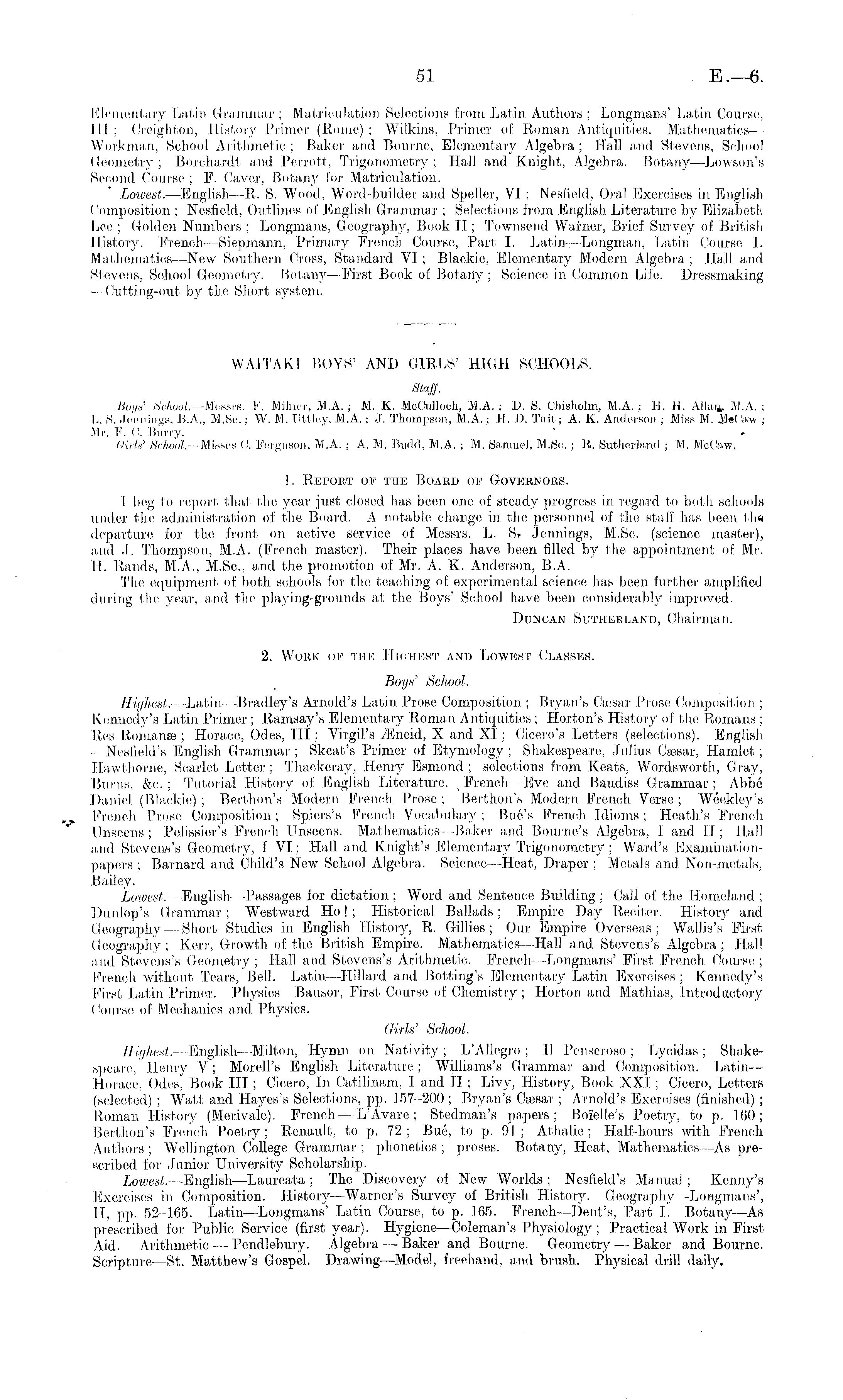 WAITAKI BOYS' AND GIRLS' HIGH SCHOOLS. Staff. Boys' School—Messrs. F. Milncr, M.A.; M. K. McCulloch, M.A,; 1). S. Chisholm, M.A. ; H. 11. Alia* M.A. ; 1.. S. Jennings, 8.A,, M.Sc.; W. M. Uttley, M.A.; J. Thompson, M.A.; H. J). 'Fait; A. K. Anderson ; Miss M. 'Mrt'a.w ; Mr. F. (*. Hurry. Girls' School— Misses C. Ferguson, M.A, ; A. M, Budd, M.A. ; M. Samuel, M.Sc. ; R. Sutherland ; M. MoCaw. I. Retort of the Board of Governors. I beg to report that the year just closed has been one of Steady progress in regard to both schools under the administration of the Board. A notable change in the personnel of the staff has been the departure for the front on active service of Messrs. L. S, Jennings, M.Sc. (science master), and J. Thompson, M.A. (French master). Their places have been filled by the appointment of Mr. H. Rands, M.A., M.Sc, and the promotion of Mr. A. K. Anderson, B.A. The equipment of both schools for the teaching of experimental science has been further amplified (.luring the year, and the playing-grounds at the Boys' School have been considerably improved. Duncan Sutherland, Chairman. 2. Work of the Highest and Lowest Classes. Boys' School. Highest. —Latin —Bradley's Arnold's Latin Prose Composition ; Bryan's Ceesar Prose Composition ; Kennedy's Latin Primer ; Ramsay's Elementary Roman Antiquities ; Horton's History of the Romans ; Res Romanes; Horace, Odes, III; Virgil's iEneid, X and XI; Cicero's Letters (selections). English - Nesfield's English Grammar ; Skeat's Primer of Etymology ; Shakespeare, Julius Coesar, Hamlet ; Hawthorne, Scarlet Letter; Thackeray, Henry Esmond; selections from Keats, Wordsworth, Cray, Burns, &c. ; Tutorial History of English Literature. French-Eve and Baudiss Grammar; Abbe Daniel (Blackie); Berthon's Modern French Prose; Berthon's Modern French Verse; Weekley's ,_ French Prose Composition; Spiers's French Vocabulary; Bue's French Idioms; Heath's French Unseens ; Pelissier's French Unseens. Mathematics—Baker and Bourne's Algebra, I and IT ; Hall and. Stevens's Geometry, I VI; Hall and Knight's Elementary Trigonometry; Ward's Examinationpapers ; Barnard and Child's New Sohool Algebra. Science—Heat, Draper ; Metals and Non-metals, Bailey, Lowest—English- Passages for dictation ; Word and Sentence Building ; Call of the Homeland ; Dunlop's Grammar; Westward Ho!; Historical Ballads; Empire Day Reciter. History and Geography — Short Studies in English History, R. Gillies; Our Empire Overseas; Wallis's First Geography ; Ken-, Growth of the British. Empire. Mathematics—Hall and Stevens's Algebra ; Hall and Stevens's Geometry ; Hall and Stevens's Arithmetic. French Longmans' First French Course; French without Tears, Bell. Latin Hillard and Botting's Elementary Latin Exercises; Kennedy's first Latin Primer. Physics —Bausor, First Course of Chemistry; Horton and Mathias, Introductory Course of Mechanics and Physics. Girls' School. Highest. —English—Milton, Hymn on Nativity; L'Allegro ; II Penseroso ; Lycidas ; Shakespeare, Henry V; Morell's English Literature; Williams's Grammar and Composition. Latin— Eorace, Odes, Book III; Cicero, In Catilinam, I and II; Livy, History, Book XXI ; Cicero, Letters (selected) ; Watt and Hayes's Selections, pp. 157-200 ; Bryan's Csesar ; Arnold's Exercises (finished) ; Roman History (Merivale). French — L'Avare; Stedman's papers; Boi'elle's Poetry, to p. 100; Berthon's French Poetry; Renault, to p. 72; Buc, to p. 91 ; Athalie; Half-hours with French Authors; Wellington College Grammar; phonetics; proses. Botany, Heat, Mathematics—As prescribed for Junior University Scholarship. Lowest. —English—Laureata ; The Discovery of New Worlds ; Nesfield's Manual ; Kenny's Exercises in Composition. History—Warner's Survey of British History. Geography—Longmans', 11, pp. 52-165. Latin—Longmans' Latin Course, to p. 165. French—Dent's, Part T. Botany—As prescribed for Public Service (first year). Hygiene —Coleman's Physiology ; Practical Work in First Aid. Arithmetic — Pendlebury. Algebra — Baker and Bourne. Geometry — Baker and Bourne. Scripture —St. Matthew's Gospel. Drawing—Model, freehand, and brush. Physical drill daily.