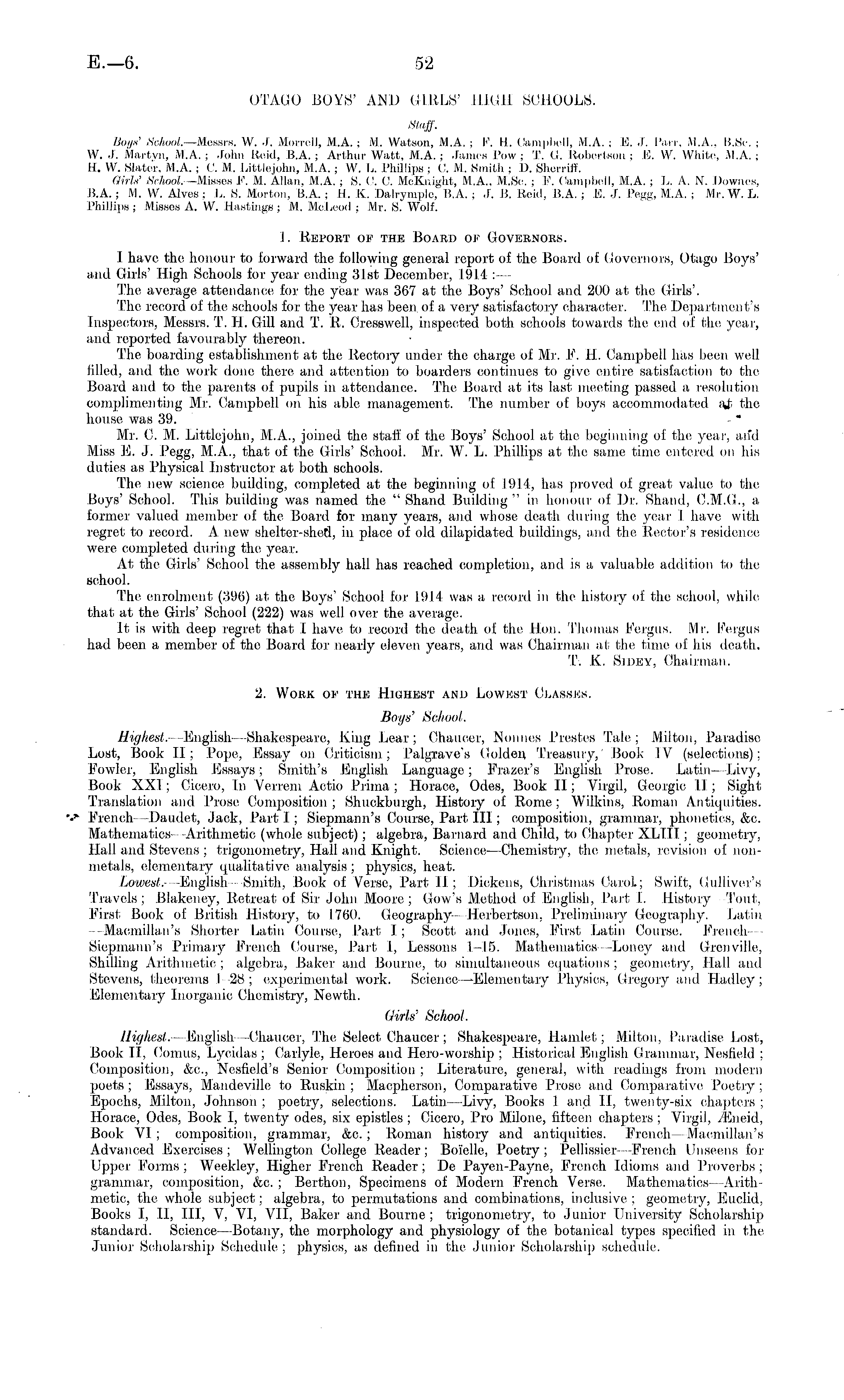 OTAGO BOYS' AND GIRLS' HIGH SCHOOLS. Staff; Boys' School— Messrs. W. J. Worrell, M.A. ; M. Watson, M.A. ; F. H. Campbell, M.A. ; K. J. Parr, M.A., B.Se. ; W. J. Martyn, M.A. ; John Keid, B.A. ; Arthur Watt, M.A. ; James Pew ; T. G, Robertson ; E. W. White, M.A. ; H. W. Slater. M.A. ; C. M. Littlejohn, M.A. ; W. L. Phillips ; C, M. Smith ; D. Sherrifl. Girls' School— Misses F. M. Allan, M.A. ; S. C. C. McKiiiaht, M.A., M.Sc. ; F. Campbell, M.A. ; L. A. N. Downes, 8.A.; M. W. Alves: 1.. S. Morton, B.A. ;H. K. Dalrymple, B.A. ; J. B. Beid, B.A. ;E. J. Pegg, M.A. j Mr.W.L. Phillips; Misses A. W. Hastings; M. McLeod ; Mr. S. Wolf. 1. Retort of the Board or Governors. I have the honour to forward the following general report of the Board of Governors, Otago Boys' and Girls' High Schools for year ending 31st December, 1914 : — The average attendance for the year was 367 at the Boys' School and 200 at the Girls'. The record of the schools for the year has been of a very satisfactory character. The Department's Inspectors, Messrs. T. H. Gill and T. R. Cresswell, inspected both schools towards the end of the year, and reported favourably thereon. The boarding establishment at the Rectory under the charge of Mr. F. H. Campbell has been well filled, and the work done there and attention to boarders continues to give entire satisfaction to the Board and to the parents of pupils in attendance. The Board at its last meeting passed a resolution complimenting Mr. Campbell on. his able management. The number of boys accommodated aj; the house was 39. Mr. 0. M. Littlejohn, M.A., joined the staff of the Boys' School at the beginning of the year, and Miss E. J. Pegg, M.A., that of the Girls' School. Mr. W. L. Phillips at the same time entered on his duties as Physical Instructor at both schools. The new science building, completed at the beginning of 1914, has proved of great value to the Boys' School. This building was named the " Shand Building" in honour of Dr. Shand, C.M.G., a former valued member of the Board for many years, and whose death during the year I have with regret to record. A new shelter-shed, in place of old dilapidated buildings, and the Rector's residence were completed during the year. At the Girls' School the assembly hall has reached completion, and is a valuable addition to the school. The enrolment (396) at the Boys' School for 1914 was a record in the history of the school, while. that at the Girls' School (222) was well over the average. It is with deep regret that I have to record the death of the Hon. Thomas Fergus. Mr. Fergus had been a member of the Board for nearly eleven years, and was Chairman at the time of his death. T. K. Sidey, Chairman. 2. Work of the Hiohest and Lowest Classics. Boys' School. Highest. —English—Shakespeare, King Lear; Chaucer, Nonnes Prestos Tale; Milton, Paradise Lost, Book II; Pope, Essay on Criticism; Palgrave's Golden Treasury, Book IV (selections); Fowler, English Essays; Smith's English Language; Frazer's English Prose. Latin- Livy, Book XXI; Cicero, In Verrem Actio Prima; Horace, Odes, Book II; Virgil, Georgio I.J ; Sight Translation and Prose Composition; Shuokburgh, History of Rome; Wilkins, Roman Antiquities. ■* F'rench—Daudet, Jack, Parti; Siepmann's Course, Part III; composition, grammar, phonetics, &c. Mathematics- Arithmetic (whole subject); algebra, Barnard and Child, to Chapter XLITI; geometry, Hall and Stevens ; trigonometry, Hall and Knight. Science—Chemistry, the metals, revision of nonmetals, elementary qualitative analysis ; physics, heat. Lowest. —English Smith, Book of Verse, Part II; Dickens, Christmas Carol; Swift, Gulliver's Travels ; Blakeney, Retreat of Sir John Moore ; Gow's Method of English, Part I. History Tout, First Book of British History, to 1760. Geography- Herbertson, Preliminary Geography. Latin —Macmillan's Shorter Latin Course, Part I; Scott and Jones, First Latin Course. French Siepmann's Primary French Course, Part 1, Lessons 1-15. Mathematics -Loney and Grcnville, Shilling Arithmetic; algebra, Baker and Bourne, to simultaneous equations; geometry, Hall and Stevens, theorems 1-28 ; experimental work. Science —-Elementary Physics, Gregory and Hadley; Elementary Inorganic Chemistry, Newth. Girls' School. Highest. —English—Chaucer, The Select Chaucer ; Shakespeare, Hamlet; Milton, Paradise Lost, Book 11, Comus, Lycidas ; Carlyle, Heroes and Hero-worship ; Historical English Grammar, Nesfield ; Composition, &c, Nesfield's Senior Composition ; Literature, general, with readings from modern poets; Essays, Mandeville to Ruskin ; Macpherson, Comparative Prose and Comparative Poetry; Epochs, Milton, Johnson ; poetry, selections. Latin- -Livy, Books 1 and 1.1, twenty-six chapters ; Horace, Odes, Book I, twenty odes, six epistles ; Cicero, Pro Milone, fifteen chapters ; Virgil, /Eneid, Book VI; composition, grammar, &c. ; Roman history and antiquities. French—-Macmillan's Advanced Exercises; Wellington College Reader; Boielle, Poetry; Pellissier--French Unseens for Upper Forms ; Weekley, Higher French Reader ; De Payen-Payne, French Idioms and Proverbs ; grammar, composition, &c. ; Berthon, Specimens of Modern French Verse. Mathematics—Arithmetic, the whole subject; algebra, to permutations and combinations, inclusive ; geometry, Euclid, Books I, 11, 111, V, VI, VII, Baker and Bourne; trigonometry, to Junior University Scholarship standard. Science—Botany, the morphology and physiology of the botanical types specified in the Junior Scholarship Schedule ; physics, as defined in the Junior Scholarship schedule.