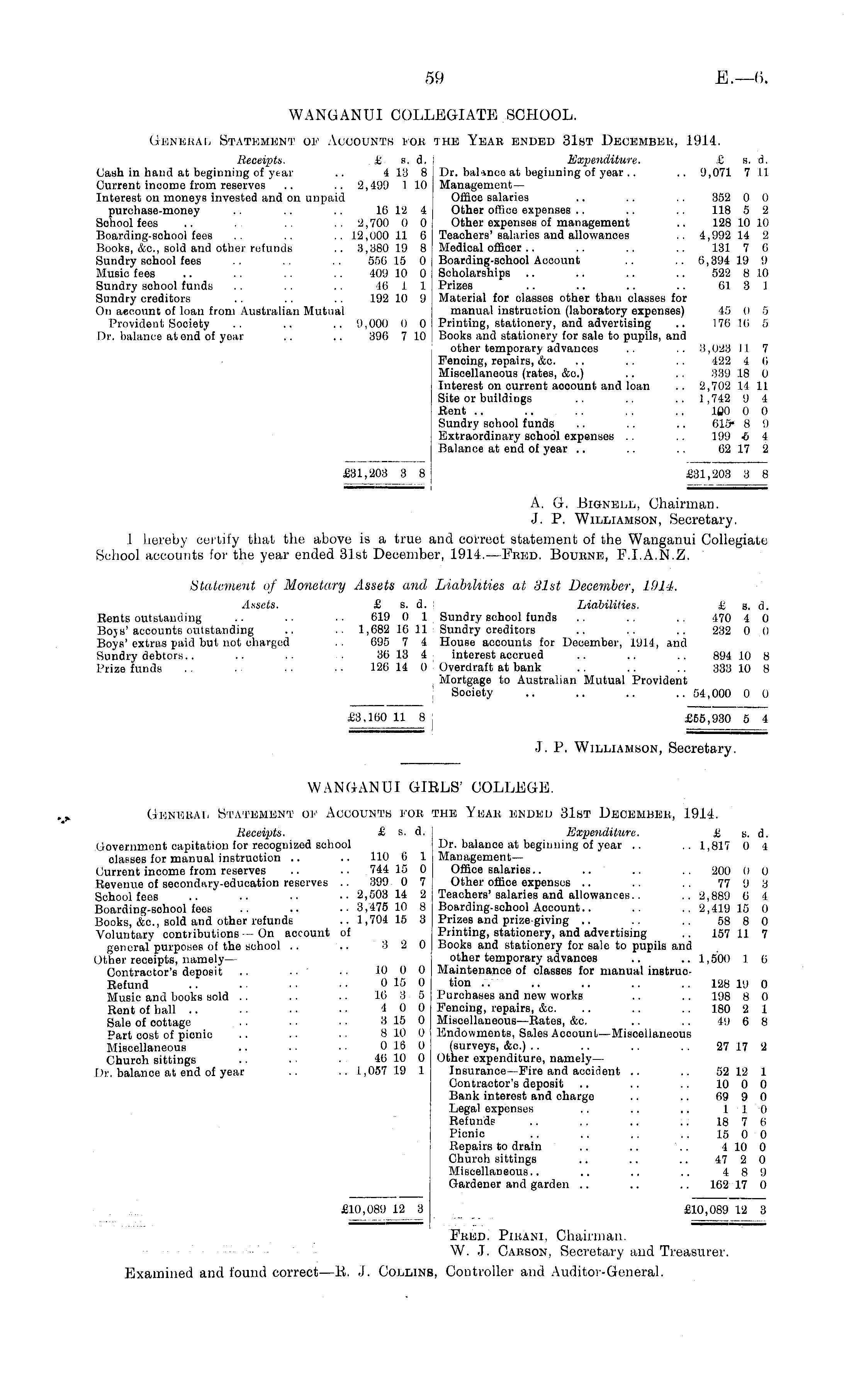 WANGANUI COLLEGIATE SCHOOL. Genekal Statement op Accounts pob the Yeae ended 31st Decembeb, 1914. Receipts. £ s. d. Expenditure. £ s. d, Cash in hand at beginning of year .. 4 13 8 Dr. baHnco at beginning of year .. .. 9,071 7 II Current income from reserves .. .. 2,499 1 10 ManagementInterest on moneys invested and on unpaid Offioe salaries .. .. .. 352 0 0 purchase-money .. .. .. 16 12 4 Other office expenses .. .. .. 118 5 2 Sohool fees .. .. .. 2,700 0 0 Other expenses of management .. 128 10 10 Boarding-sohool fees .. .. .. 12,000 11 6 Teachers'salaries and allowances .. 4,992 14 2 Books, &c, sold and other refunds .. 3,380 19 8 Medical officer .. .. .. .. 131 7 0 Sundry school fees .. .. .. 556 15 0 Boarding-school Account .. .. 6,394 19 9 Music fees .. .. .. .. 409 10 0 Scholarships .. .. .. .. 522 8 10 Sundry sohool funds .. .. 46 1 1 Prizes .. .. .. .. 61 3 1 Sundry creditors .. .. .. 192 10 9 Material for classes other than classes for On account of loan from Australian Mutual manual instruction (laboratory expenses) 45 0 5 Provident Society .. .. .. 9,000 0 0 Printing, stationery, and advertising .. 176 16 5 Dr. balance at end of year .. .. 396 710 Books and stationery for sale to pupils, and other temporary advances .. .. 3,023 11 7 Fencing, repairs, &c. .. .. .. 422 4 6 Miscellaneous (rates, &o.) .. .. 339 18 0 Interest on current aooount and loan .. 2,702 14 11 Site or buildings .. .. .. 1,742 9 4 Rent .. .. .. .. ... 100 0 0 Sundry school funds .. .. .. 613* 8 9 Extraordinary school expenses .. .. 199 f> 4 Balance at end of year .. .. .. 62 17 2 £31,203 3 8 £31,203 3 8 A. G. Bignell, Chairman. J. P. Williamson, Secretary. I hereby certify that the above is a true and correct statement of the Wanganui Collegiate School accounts for the year ended 31st December, 1914.—Eeed. Bouene, F.I.A.N.Z. Statement of Monetary Assets and Liabilities at 31st December, 1914. Assets. £ s. d. Liabilities. £ s. d. Rents outstanding .. .. . • 619 0 1 Sundry school funds .. .. .. 470 1 0 Boys'accounts outstanding .. .. 1,682 16 11 Sundry creditors .. .. .. 232 0 0 Boys' extras paid but not charged . . 695 7 4 House accounts for December, 1914, and Sundry debtors.. .. .. .. 36 13 4 interest accrued .. .. .. 894 10 8 Prize funds .. • ■ • ■ ■ • 126 14 0 Overdraft at hank .. .. .. 333 10 8 j Mortgage to Australian Mutual Provident Society .. .. .. .. 54,000 0 0 £3,160 11 8 j £65,930 5 4 J. P. Williamson, Secretary.
