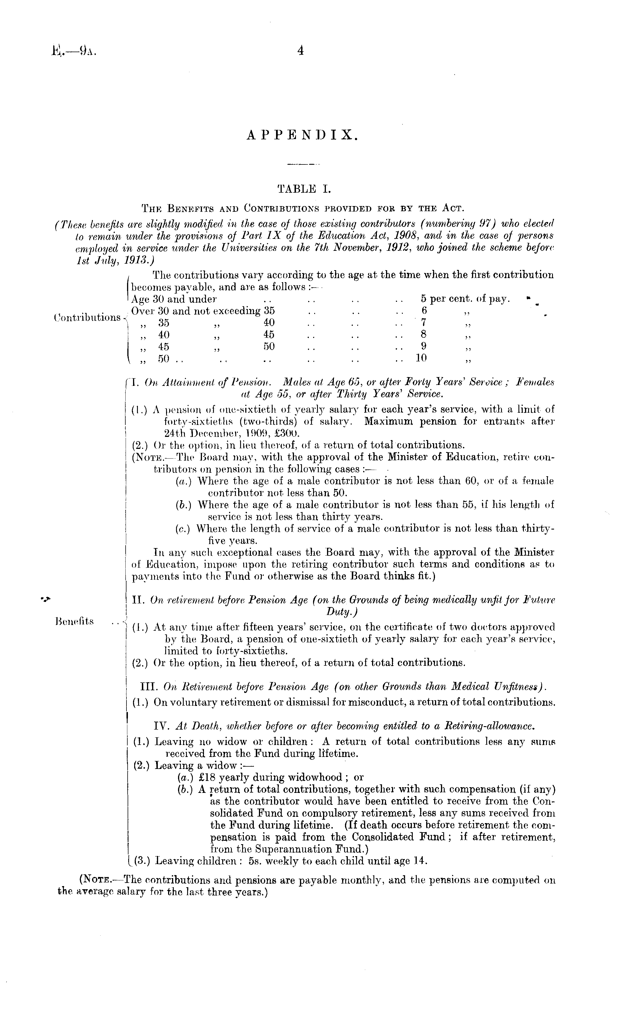 APPENDIX. TABLE I. The Benefits and Contributions provided fok by the Act. (These benefits are slightly modified in the case of those existing contributors (numberiny 97) who elected In remain under the provisions of Part IX of the Education Act, 1908, and in the case of persons employed in service under the Universities on the 7th November, 1912, who joined the scheme before Ist July, 1913.) The contributions vary according to the age at the time when the first contribution becomes payable, and are as follows :— Age 30 and under .. . . . . .. 5 per cent, of pay. ■ _ ~ j. Over 30 and not exceeding 35 . . . . . . 6 „ Contributions < ~m °- n 7 ~oo ~ *v . ■ • ■ .. i ~ ~40 „ 45 .. .. ..8 „ 45 „ 50 .. .. ..9 I „ 50 10 ("I. On Attainment of Pension. Males at Age 65, or after Forty Years , Service ; Females at Age 55, or after Thirty Years' Service. (I.) A pension of one-sixtieth of yearly salary for each year's service, with a limit of forty-sixtieths (two-thirds) of salary. Maximum pension for entrants after 24th December, 1909, £30u. (2.) Or the option, in lieu thereof, of a return of total contributions. (Note. —The Board may, with the approval of the Minister of Education, retire contributors on pension in the following cases : — (a.) Where the age of a male contributor is not less than 60, or of a female contributor not less than 50. (b.) Where the age of a male contributor is not less than 55, if his length of service is not less than thirty years. (o.) Where the length of service of a male contributor is not less than thirtyfive years. Tti any such exceptional cases the Board may, with the approval of the Minister of Education, impose upon the retiring contributor such terms and conditions as to payments into the Fund or otherwise as the Board thinks fit.) '*■ 11. On retirement before Pension Age (on the Grounds of being medically unfit for Future Duty.) (1.) At any time after fifteen years' service, on the certificate of two doctors approved by the Board, a pension of one-sixtieth of yearly salary for each year's service, limited to forty-sixtieths. (2.) Or the option, in lieu thereof, of a return of total contributions. 111. On Retirement before Pension Age (on other Grounds than Medical Unfitness) . (1.) On voluntary retirement or dismissal for misconduct, a return of total contributions. IV. At Death, whether before or after becoming entitled to a Retiring-allowance. i (1.) Leaving no widow or children : A return of total contributions less any sums received from the Fund during lifetime. (2.) Leaving a widow :— (a.) £18 yearly during widowhood ; or (b.) A return of total contributions, together with such compensation (if any) as the contributor would have been entitled to receive from the Consolidated Fund on compulsory retirement, less any sums received from the Fund during lifetime. (If death occurs before retirement the compensation is paid from the Consolidated Fund ; if after retirement, from the Superannuation Fund.) (3.) Leaving children : ss. weekly to each child until age 14. (Note. —The contributions and pensions are payable monthly, and the pensions are computed on the average salary for the last three years.)