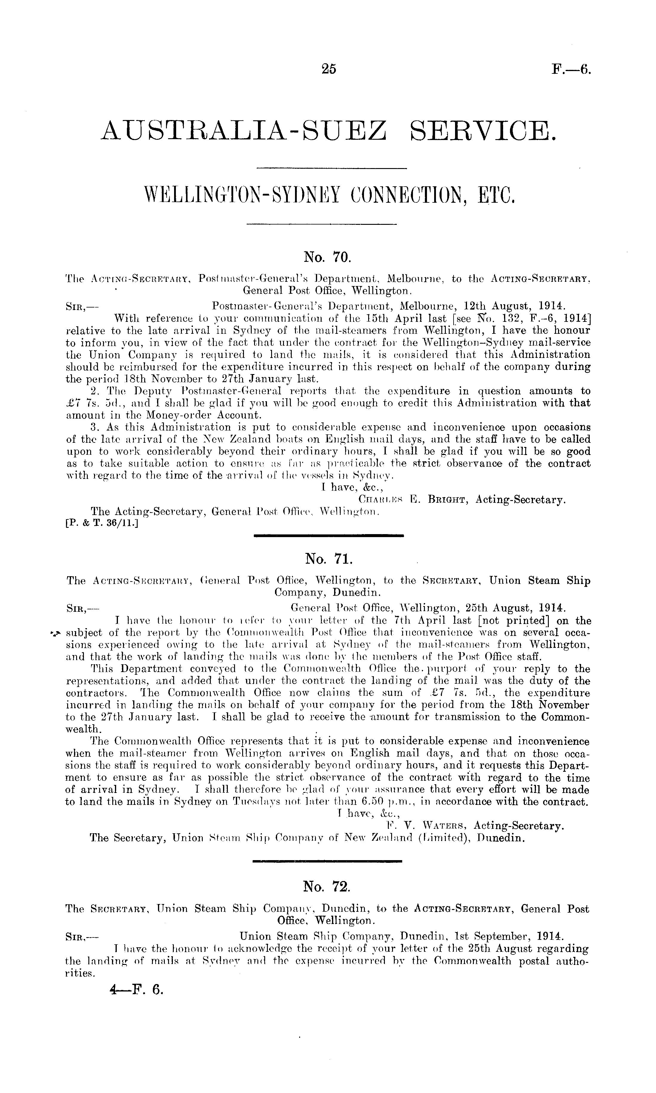No. 72. The Secretary, Union Steam Ship Company, Dunedin, to the Acting-Secretary, General Post Office, Wellington. Sir, — Union Steam Ship Company, Dunedin, Ist September, 1914. T have the honour io acknowledge the receipt of your letter of the 25th August regarding the landing of mails at Sydney and the expense incurred by the Commonwealth postal authorities.