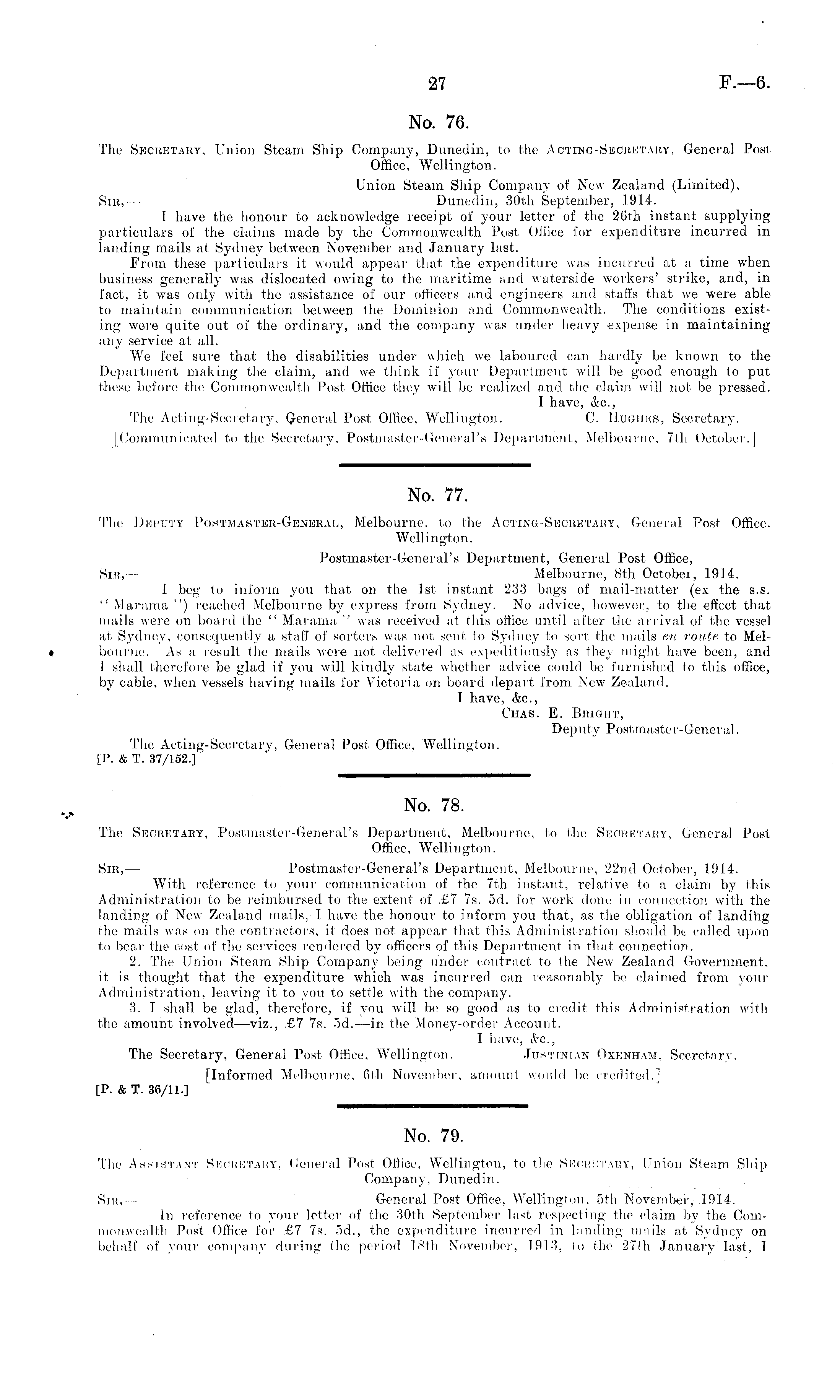 No. 79. The Assis.tant Secretary, General Post Office, Wellington, to the Secretary, Union Steam Ship Company, Dunedin. Sir, — General Post Office, Wellington, sth November, 1914. In reference to your letter of the 30th September last respecting the claim by the Commonwealth Post Office for £7 7s. 5d,, the expenditure incurred in landing mails at Sydney on behalf of your company during the period 18th November, 1913, to the 27th January last, I