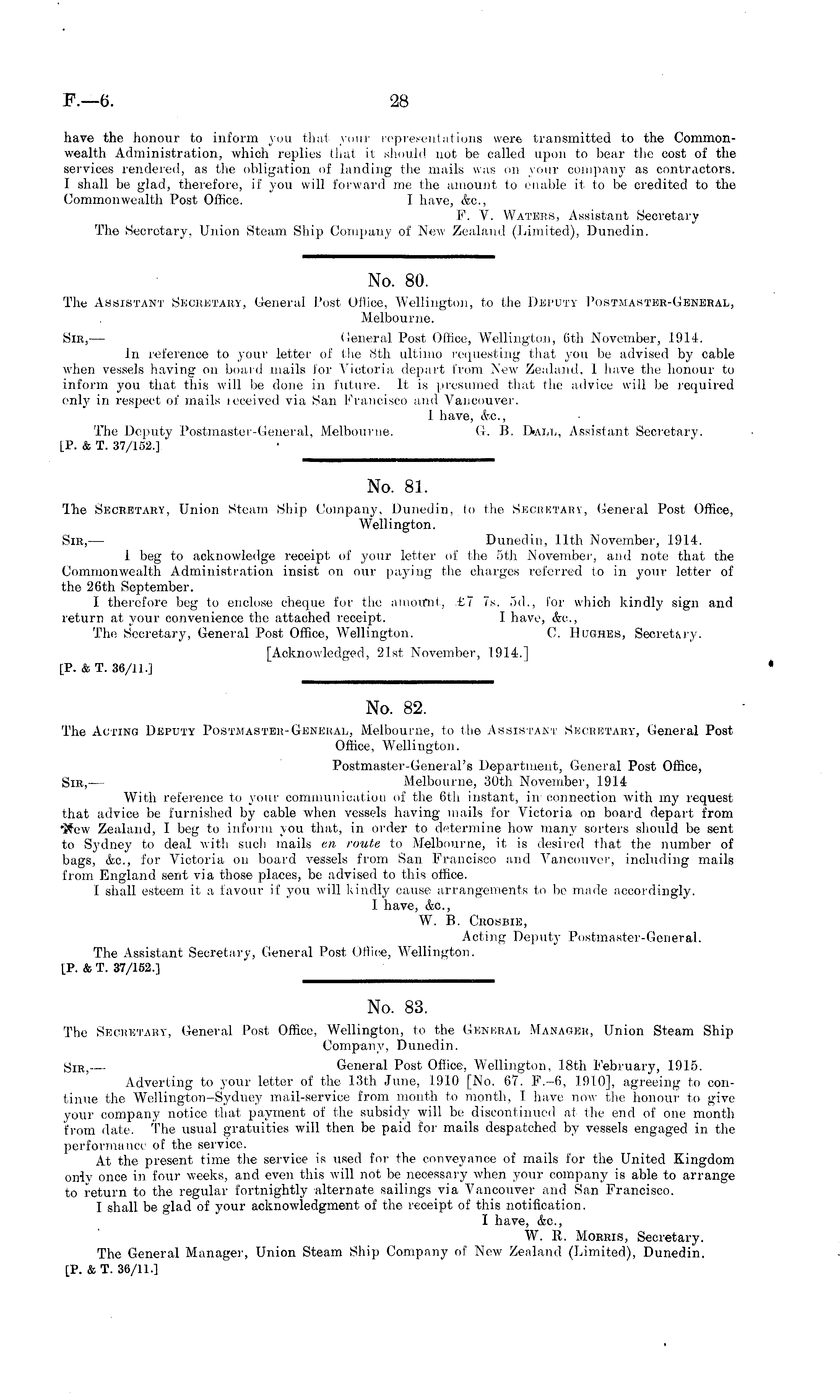 No. 82. The Acting Deputy Postmaster-General, Melbourne, to the Assistant Secretary, General Post Office, Wellington. Postmaster-General's Department, General Post Office, Sir, — Melbourne, 30th November, 1914 With reference to your communication of the 6th instant, in connection with my request that advice be furnished by cable when vessels having mails for Victoria on board depart from Zealand, I beg to inform you that, in order to determine how many sorters should be sent to Sydney to deal with such mails en route to Melbourne, it is desired that the number of bags, &c, for Victoria on board vessels from San Francisco and Vancouver-, including mails from England sent via those places, be advised to this office. I shall esteem it a favour if you will kindly cause arrangements to be made accordingly. I have, &c, W. B. Crosbie, Acting Deputy Postmaster-General. The Assistant Secretary, General Post Office, Wellington. [P. & T. 37/162.]