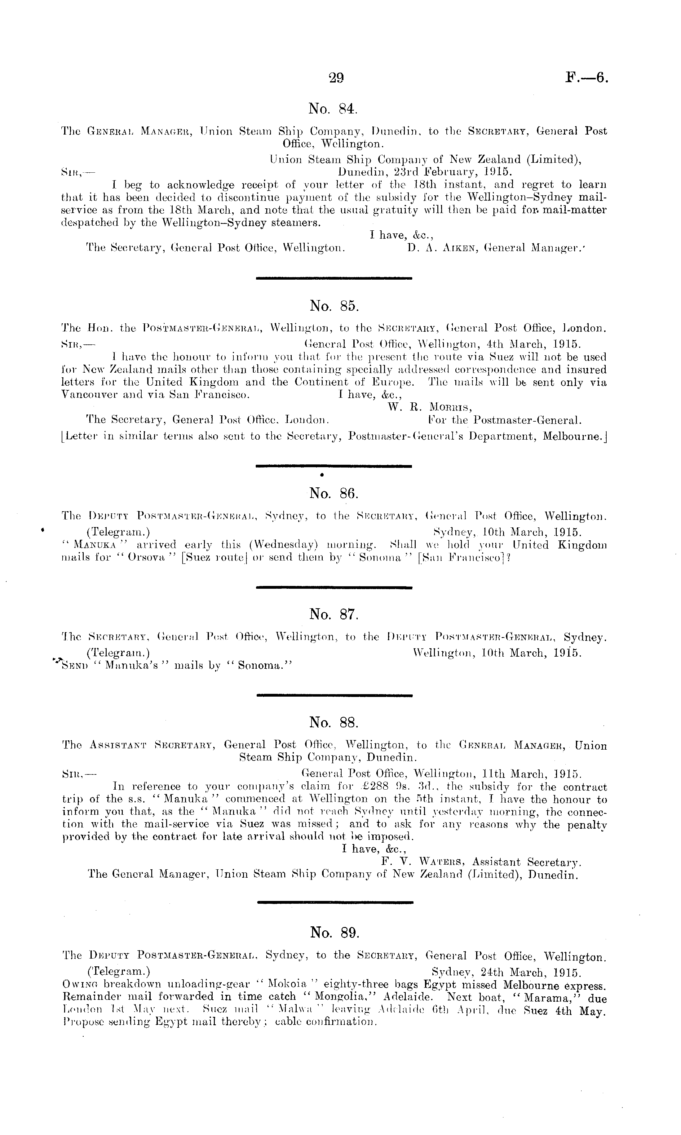 No. 84. The General Manager, Union Steam Ship Company, Dunedin, to the Secretary, General Post Office, Wellington. Union Steam Ship Company of New Zealand (Limited), Sir, — Dunedin, 23rd February, 1915. I beg to acknowledge receipt, of your letter of the 18th instant, and regret to learn that it has been decided to discontinue payment of the subsidy for the Wellington-Sydney mailservice as from the 18th March, and note that the usual gratuity will then be paid for. mail-matter despatched by the Wellington-Sydney steamers. I have, &c, The Secretary, General Post Office, Wellington. D. A. Aiken, General Manager.'