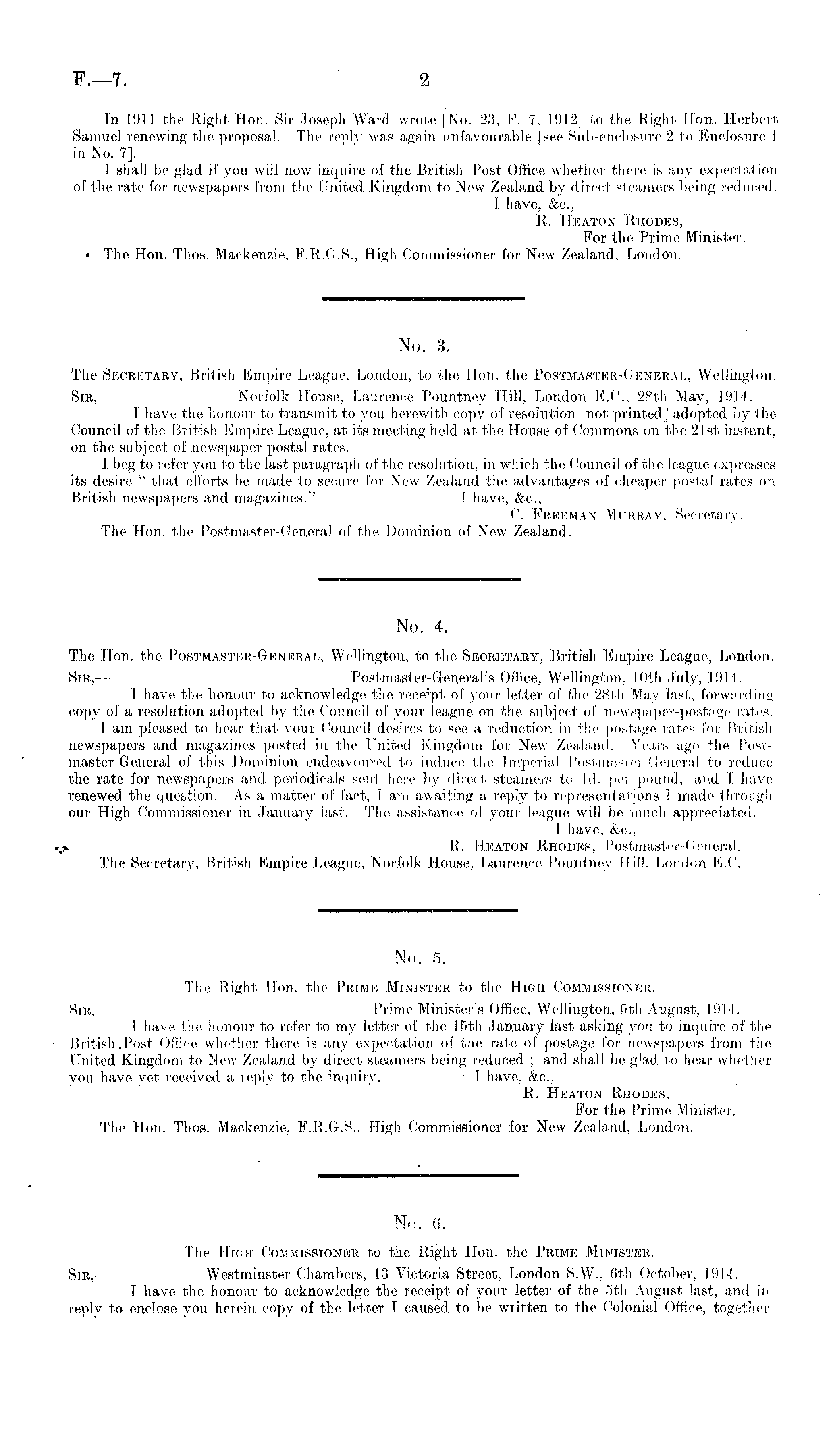 In 191 1 the Eight Hon. Sir Joseph Ward wrote [No. 23, P. 7, 1912] to the Eight Hon. Herbert, Samuel renewing the proposal. The reply was again unfavourable [see Sub-enclosure 2to Enclosure 1 in No. 7]. I shall be glad if you will now inquire of the British Post Office whether there is any expectation of the rate for newspapers from the United Kingdom to New Zealand by direct steamers being reduced. I have, &c, K. Heaton Rhodes, For the Prime Minister. « The Hon. Thos. Mackenzie, F.8.G.5., High Commissioner for New Zealand, London.