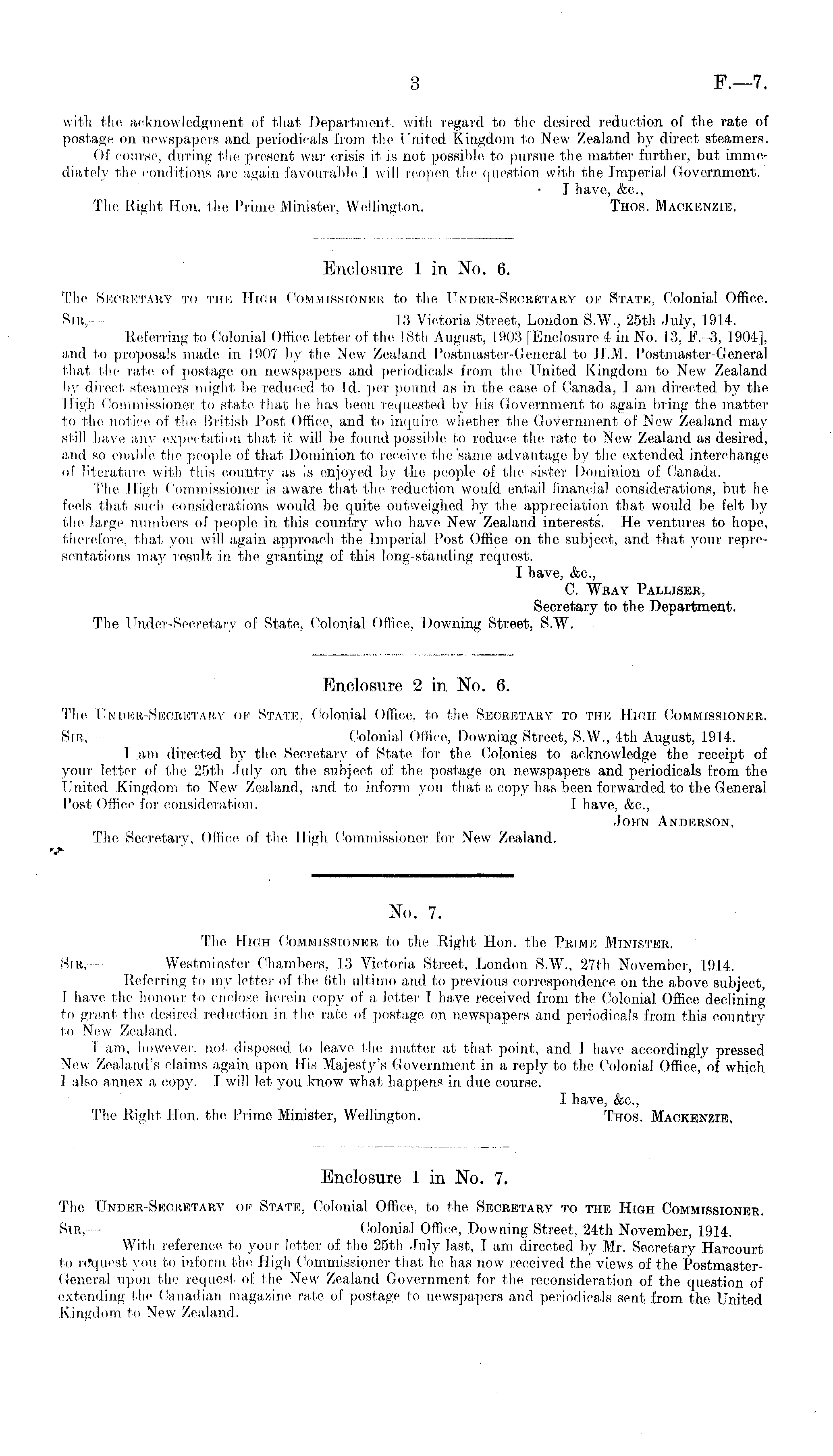 No. 7. The High Commissioner to the Right Hon. the Prime Minister. Sir,-- Westminster Chambers, 13 Victoria SI reel, London S.W., 27th November, 1914. Referring to my letter of the 6th ultimo and to previous correspondence on the above subject, f have the honour to enclose herein copy of a, letter I have received from the Colonial Office declining to grant the desired reduction in the rate of postage on newspapers and periodicals from this country to New Zealand. I am, however, not disposed to leave the matter at (hat point, and 1 have accordingly pressed New Zealand's claims again upon His Majesty's Government in a reply to the Colonial Office, of which 1 also annex a copy. I will let you know what happens in due course. I have, &c, The Eight Hon. the Prime Minister, Wellington. Thos. Mackenzie,