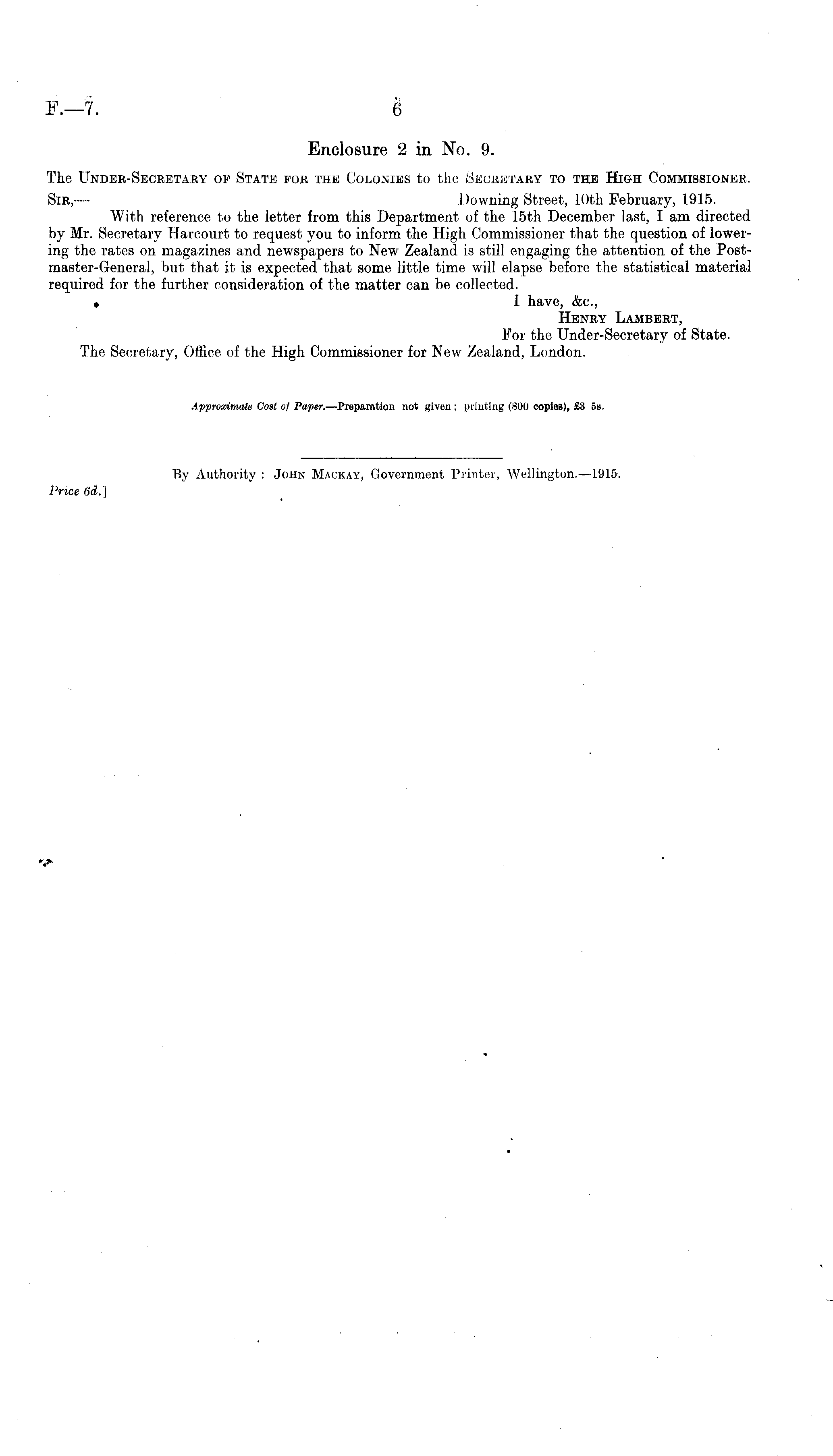 Enclosure 2 in No. 9. The Under-Secretary op State for the Colonies to the Secretary to the High Commissioner. Sir, — Dowuing Street, 10th February, 1915. With reference to the letter from this Department of the 15th December last, I am directed by Mr. Secretary Harcourt to request you to inform the High Commissioner that the question of lowering the rates on magazines and newspapers to New Zealand is still engaging the attention of the Post-master-General, but that it is expected that some little time will elapse before the statistical material required for the further consideration of the matter can be collected. , I have, &c, Henry Lambert, For the Under-Secretary of State. The Secretary, Office of the High Commissioner for New Zealand, London.