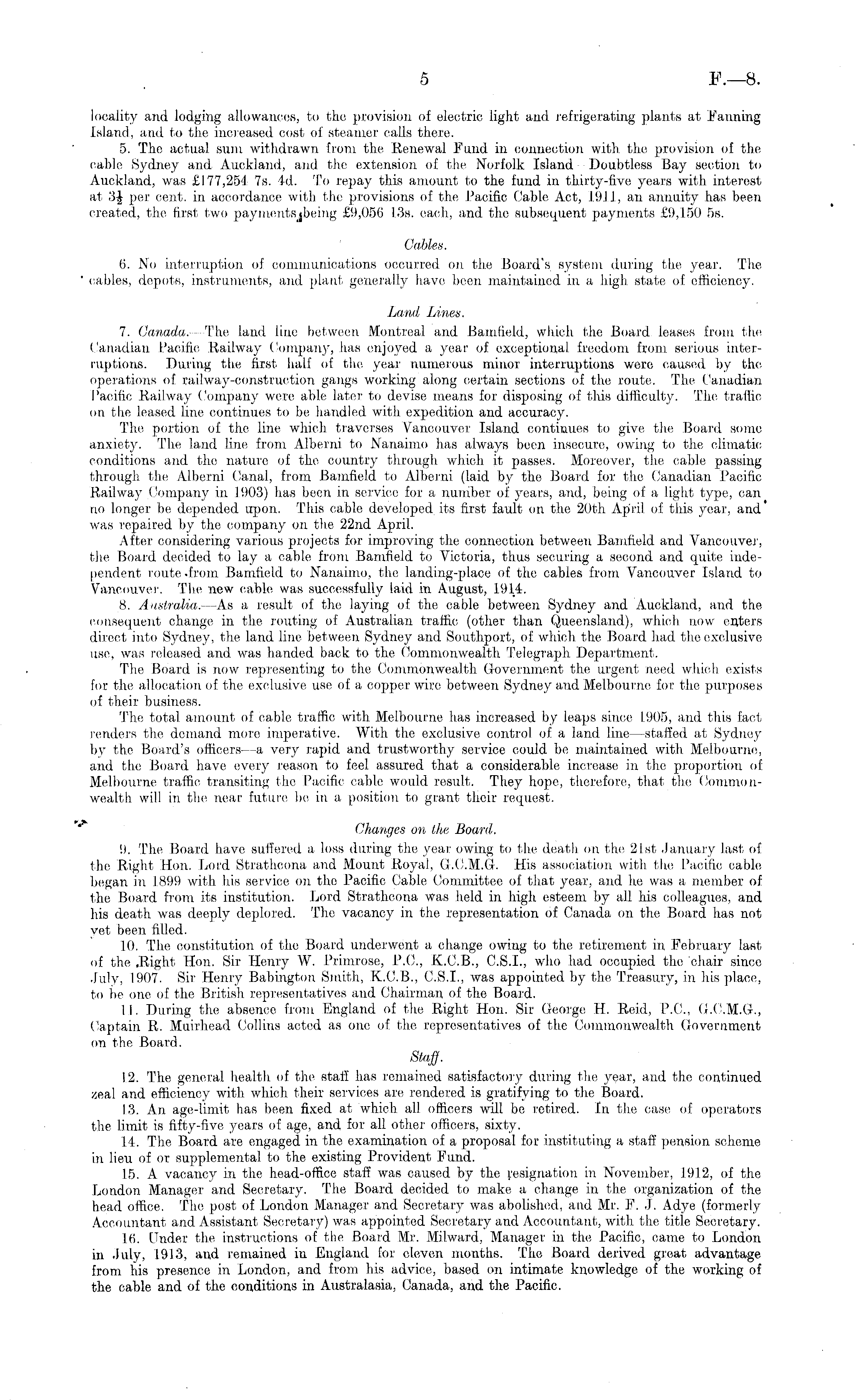 locality and lodging allowances, to the provision of electric light and refrigerating plants at Panning Island, and to the increased cost of steamer calls there. 5. The actual sum withdrawn from the Renewal Fund in connection with the provision of the cable Sydney and Auckland, and the extension of the Norfolk Island Doubtless Bay section to Auckland, was £177,251 7s. 4d. To repay this amount to the fund in thirty-five years with interest at 3iJ per cent, in accordance with the provisions of the Pacific Cable Act, 1.9.1 J, an annuity has been created, the first two paymentsjbeing £9,056 13s. each, and the subsequent payments £9,150 ss. Cables. 6. No interruption of communications occurred on the Board's system during the year. The " cables, depots, instruments, and plant generally have been maintained in a high state of efficiency. Land Lines. I. Canada. The land line between Montreal and Bamfield, which the Board leases from the Canadian Pacific Railway Company, has enjoyed a year of exceptional freedom from serious interruptions. During the first half of the year numerous minor interruptions were caused by the operations of railway-construction gangs working along certain sections of the route. The Canadian Pacific Railway Company were able later to devise means for disposing of this difficulty. The traffic on the leased line continues to be handled with expedition and accuracy. The portion of the line which traverses Vancouver Island continues to give the Board some anxiety. The land line from Alberni to Nanaimo has always been insecure, owing to the, climatic conditions and the nature of the country through which, it passes. Moreover, the cable passing through the Alberni Canal, from Bamfield to Alberni (laid by the Board for the Canadian Pacific Railway Company in 1903) has been in service for a number of years, and, being of a light type, can no longer be depended upon. This cable developed its first fault on the 20th April of this year, and was repaired by the company on the 22nd April. After considering various projects for improving the connection between Bamfield and Vancouver, the Board decided to lay a cable from Bamfield to Victoria, thus securing a second and quite independent route .from Bamfield to Nanaimo, the landing-place of the cables from Vancouver Island to Vancouver. The new cable was successfully laid in August, 1914. 8. Australia. —As a result of the laying of the cable between Sydney and Auckland, and the consequent change in the routing of Australian traffic (other than Queensland), which now enters direct into Sydney, the land line between Sydney and Southport, of which the Board had the exclusive use, wits released and was handed back to the Commonwealth Telegraph Department. The Board is now representing to tho Commonwealth Government the urgent need which exists for the allocation of the exclusive use of a copper wire between Sydney and Melbourne for the purposes of their business. The total amount of cable traffic with Melbourne has increased by leaps since 1905, and this fact tenders the demand more imperative. With the exclusive control of a land line —stalled at, Sydney by the Board's officers—-a very rapid and trustworthy service could be maintained with Melbourne, and the Board have every reason to feel assured that a considerable increase in the proportion of Melbourne traffic transiting the Pacific cable would result. They hope, therefore, that the Commonwealth will in the near future be in a position to grant their request. Changes on the Board. 9. The Board have suffered a, loss during the year owing to flit! death on the 2lst January hist of the Right Hon. Lord Strathcona and Mount Royal, G.C.M.G. His association with the Pacific cable began in 1899 with his service on the Pacific Cable Committee of that year, and he was a member of the Board from its institution. Lord Strathcona was held in high esteem by all his colleagues, and his death was deeply deplored. The vacancy in tho representation of Canada on the Board has not vet, been filled. 10. The constitution of the Board underwent a change owing to the retirement in .February last of the .Right Hon. Sir Henry W. Primrose, P.0., K.C.8., C.5.1., who had occupied the chair since July, 1907. Sir Henry Babington Smith. K.C.8., C.5.1., was appointed by the Treasury, in his place, to be one of the British representatives and Chairman of the Board. 11. During the absence from England of the Right Hon. Sir George H. Reid, P.C., G.C.M.G., Captain R. Muirhead Collins acted as one of the representatives of the Commonwealth Government on the Board. Staff. 12. The general health of the staff has remained satisfactory during the year, and the continued zeal and efficiency with which their services are rendered is gratifying to the Board. 13. An age-limit has been fixed at which all officers will be retired. In the case of operators the limit is fifty-five years of age, and for all other officers, sixty. 14. The Board are engaged in the examination of a proposal for instituting a staff pension scheme in lieu of or supplemental to the existing Provident Fund. 15. A vacancy in the head-office staff was caused by the resignation in November, 1912, of the London Manager and Secretary. The Board decided to make a change in the organization of the head office. The post of London Manager and Secretary was abolished, and Mr. F. J. Adye (formerly Accountant and Assistant Secretary) was appointed Secretary and Accountant, with the title Secretary. Hi. Under the instructions of the Board Mr. Milward, Manager in the Pacific, came to London in July, 1913, and remained in England for eleven months. The Board derived great advantage from his presence in London, and from his advice, based on intimate knowledge of the working of the cable and of the conditions in Australasia, Canada, and the Pacific.
