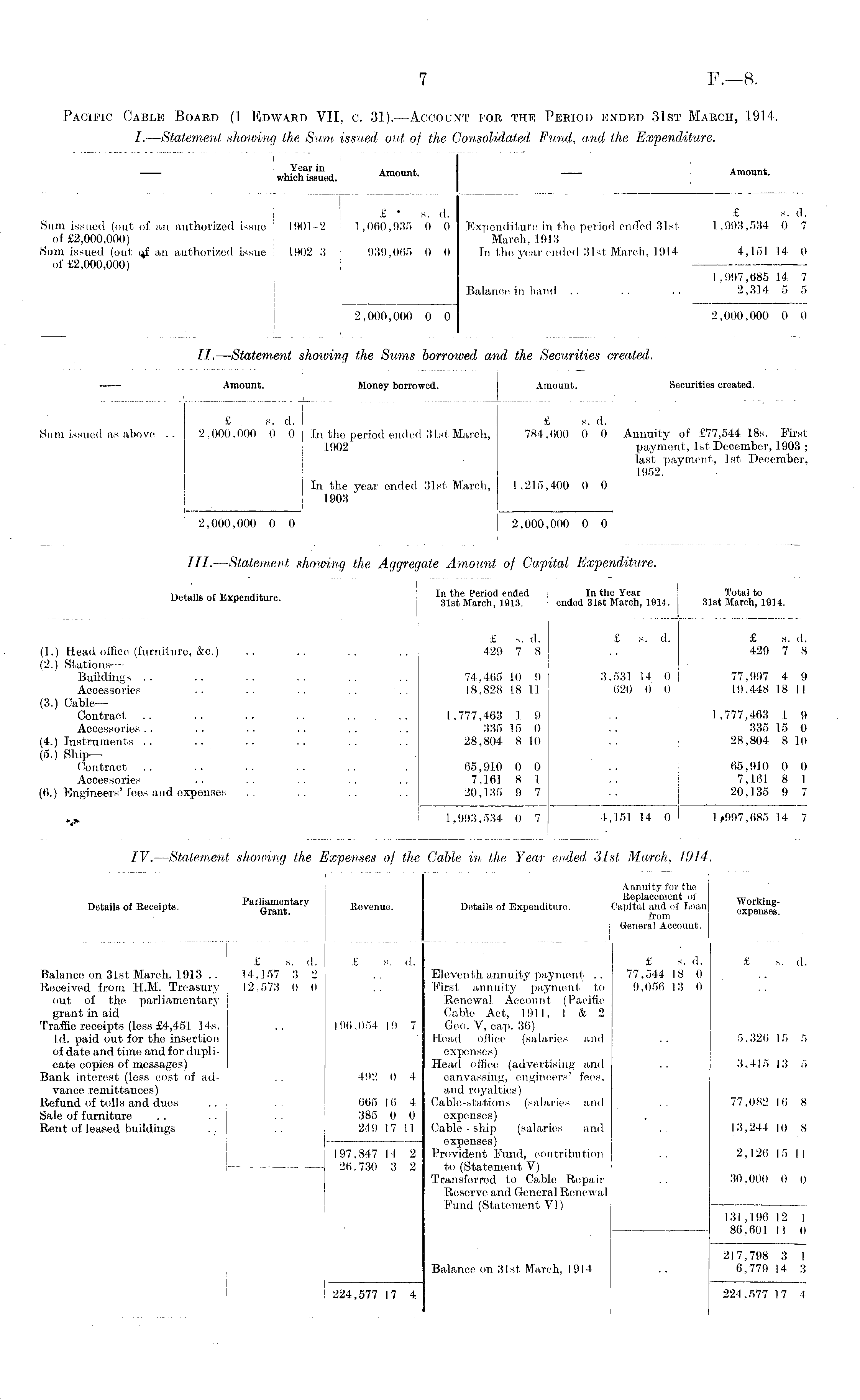Pacific Cable Board (1 Edward VII, c. 31).-Account for the Period ended 31st March, 1914. I.-Statement showing the Sum issued out of the Consolidated Fund, and the Expenditure.