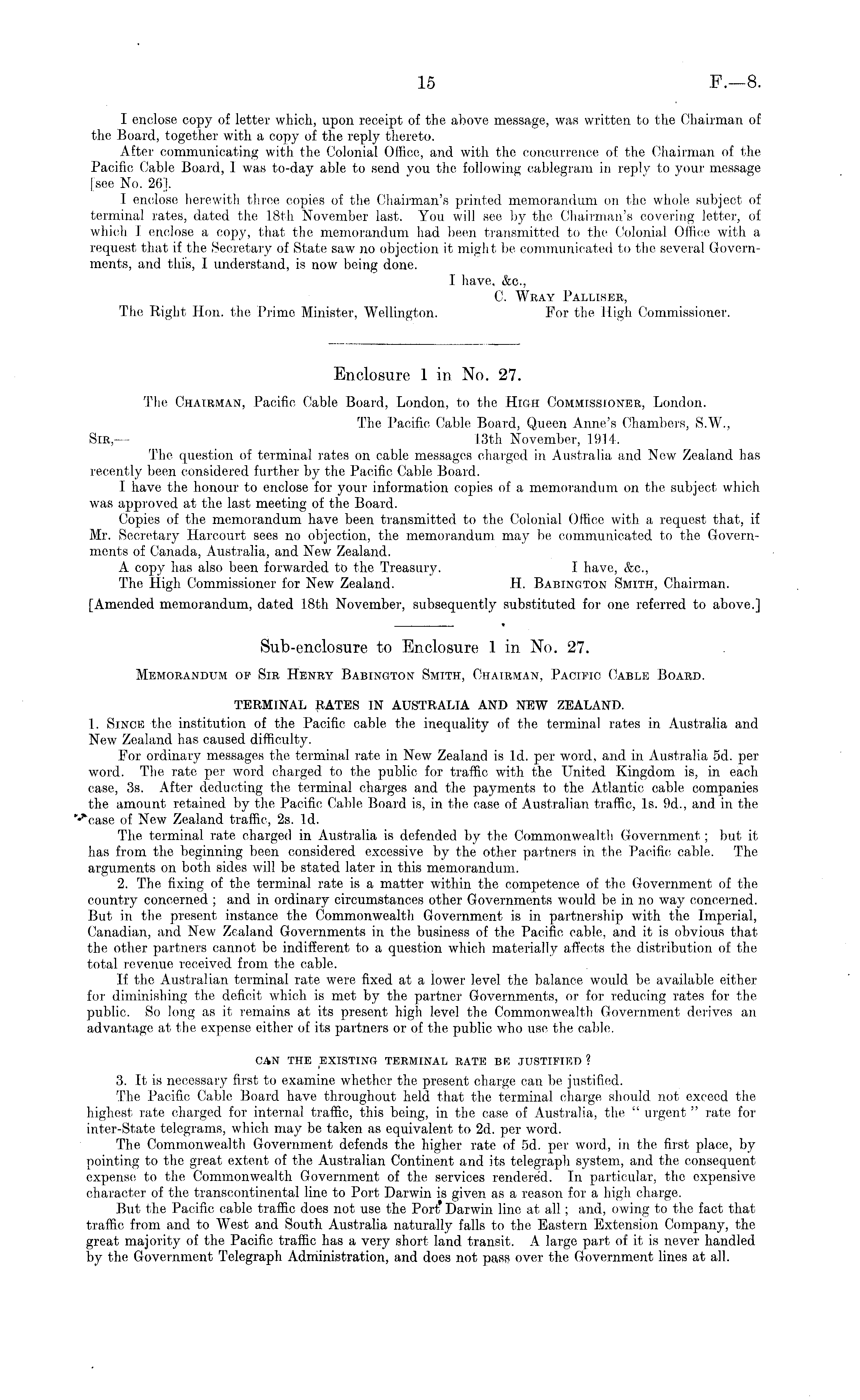 Sub-enclosure to Enclosure 1 in. No. 27. Memorandum of Sir Henry Babington Smith, Chairman, Pacific Cable Board. TERMINAL RATES IN AUSTRALIA AND NEW ZEALAND. 1. Since the institution of the Pacific cable the inequality of the terminal rates in Australia and New Zealand has caused difficulty. For ordinary messages the terminal rate in New Zealand is Id. per word, and in Australia sd. per word. The rate per word charged to the public for traffic with the United Kingdom, is, in each case, 3s. After deducting the terminal charges and the payments to the Atlantic; cable companies the amount retained by the Pacific Cable Board is, in the case of Australian traffic, Is. 9d., and in the '-''case of New Zealand traffic, 2s. Id. The terminal rate charged in Australia is defended by the Commonwealth Government; but it has from the beginning been considered excessive by the other partners in the Pacific cable. The arguments on both sides will be stated later in this memorandum. 2. The fixing of the terminal rate is a matter within the competence of the Government of the country concerned ; and in ordinary circumstances other Governments would be in no way concerned. But in the present instance the Commonwealth Government is in partnership with the Imperial, Canadian, and New Zealand Governments in the business of the Pacific cable, and it is obvious that the other partners cannot be indifferent to a question which materially affects the distribution of the total revenue received from the cable. If the Australian terminal rate were fixed at a lower level the balance would be available either for diminishing the deficit which is met by the partner Governments, or for reducing rates for the public. So long as it remains at its present high level the Commonwealth Government derives an advantage at the expense either of its partners or of the public, who use the cable. CAN THE EXISTING TERMINAL RATE BE JUSTIFIED ? 3. It is necessary first to examine whether the present charge can be justified. The Pacific Cable Board have throughout held that the terminal charge should not exceed the highest rate charged for internal traffic, this being, in the case of Australia, the " urgent " rate for inter-State telegrams, which may be taken as equivalent to 2d. per word. The Commonwealth Government defends the higher rate of sd. per word, in the first place, by pointing to the great extent of the Australian Continent and its telegraph system, and the consequent expense to the Commonwealth Government of the services rendered. In particular, the expensive character of the transcontinental line to Port Darwin is given as a reason for a high charge. But the Pacific cable traffic does not use the Port Darwin line at all; and, owing to the fact that traffic from and to West and South Australia naturally falls to the Eastern Extension Company, the great majority of the Pacific traffic has a very short land transit. A large part of it is never handled by the Government Telegraph Administration, and does not pass over the Government lines at all.