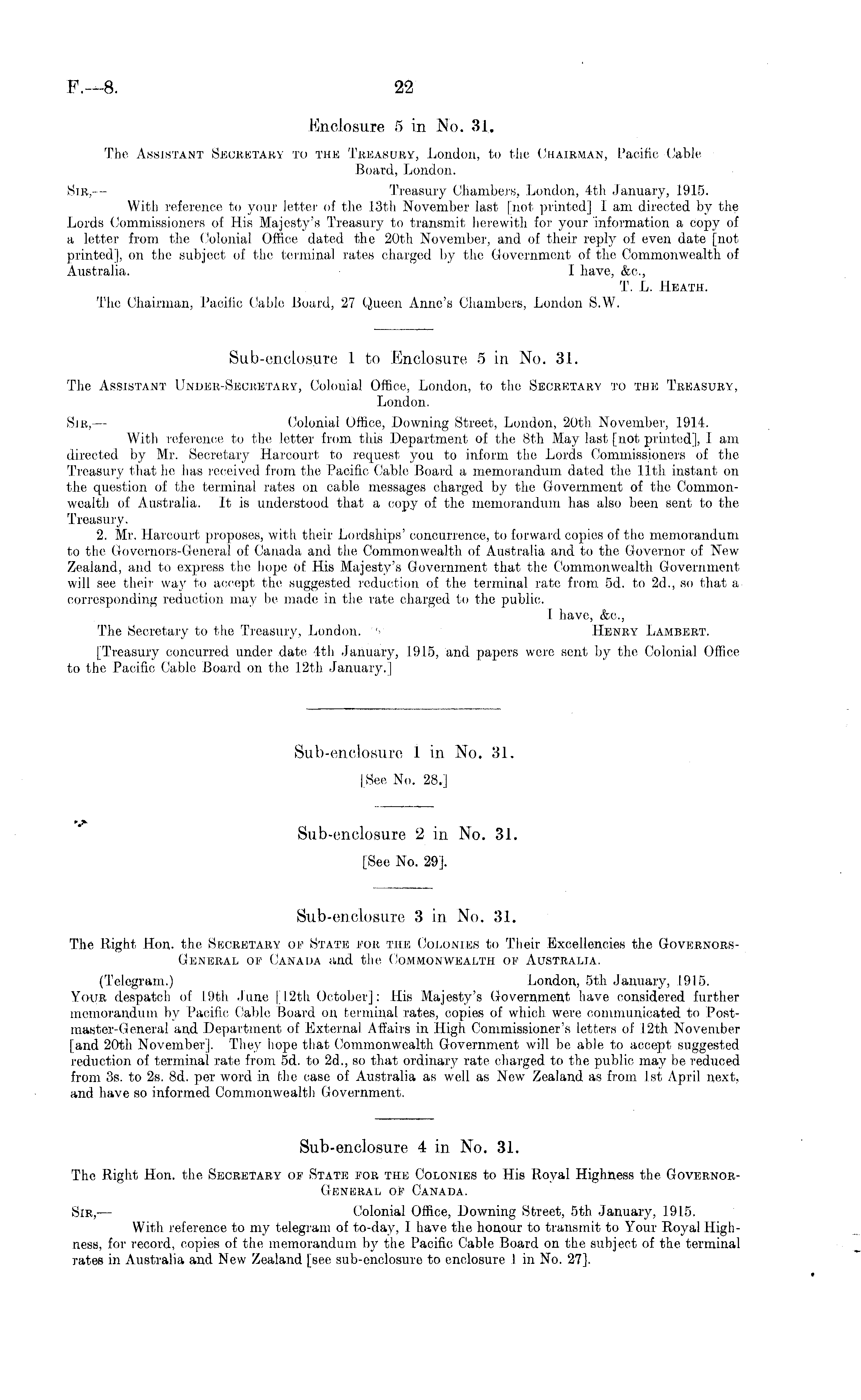 Sub-enclosure 4 in No. 31. The Right Hon. the Secretary of State for the Colonies to His Royal Highness the GovernorGenkral of Canada. Sir, — Colonial Office, Downing Street, sth January, 1915. With reference to my telegram of to-day, I have the honour to transmit to Your Royal Highness, for record, copies of the memorandum by the Pacific Cable Board on the subject of the terminal rates in Australia and New Zealand [sec sub-enclosure to enclosure I in No. 27].