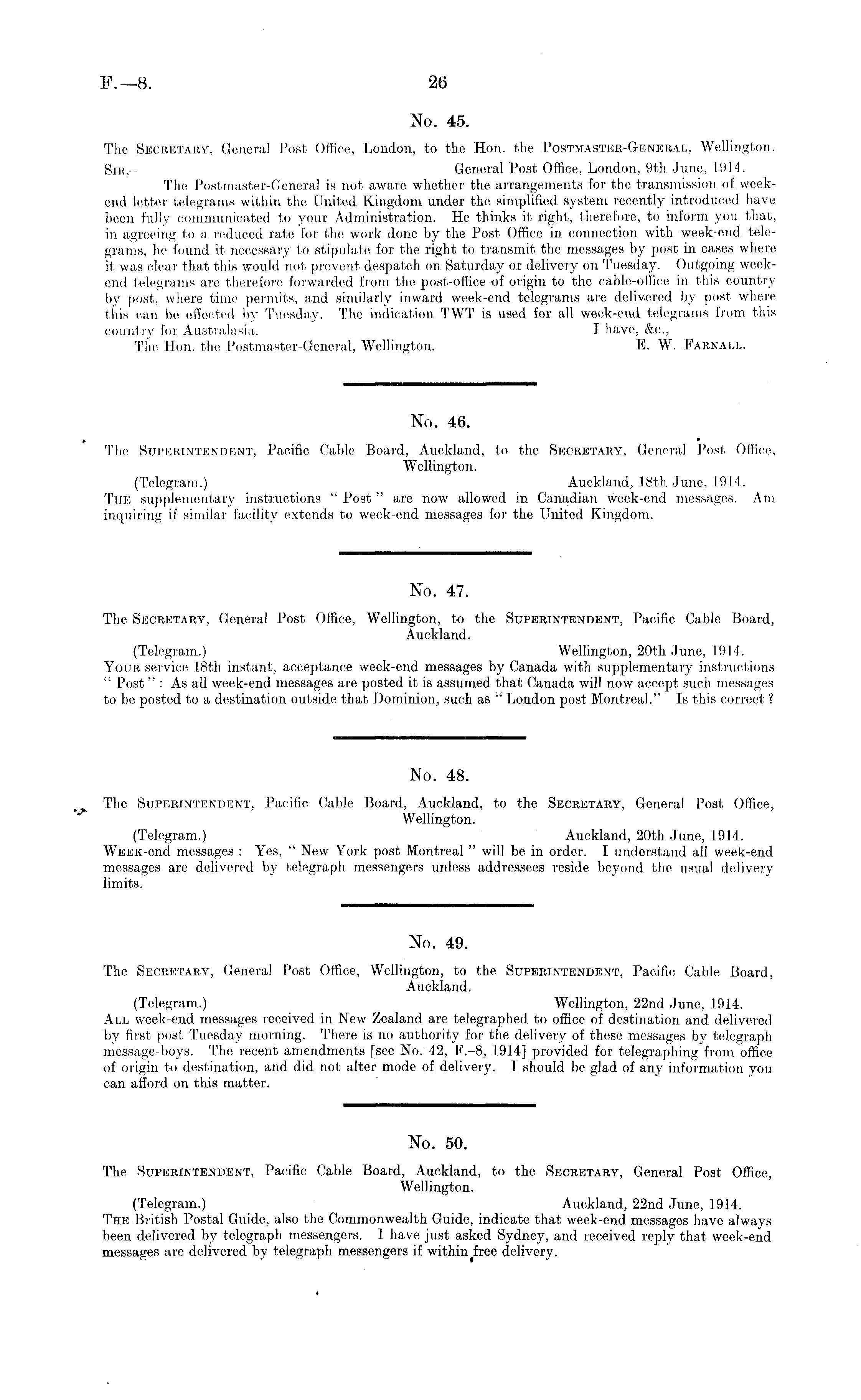 No. 45. The Secretary, General Post Office, London, to the Hon. the Postmaster-General, Wellington. Sir,— General Post Office, London, 9th June, L914. The Postmaster-General is not aware whether the arrangements for the transmission of weekend letter telegrams within the United Kingdom under the simplified system recently introduced have been fully communicated to your Administration. He thinks it right, therefore, to inform you that, in agreeing to a reduced rate for the work done by the Post Office in connection with week-end telegrams, he found it necessary to stipulate for the right to transmit the messages by post in cases where it was clear that this would not prevent despatch on Saturday or delivery on Tuesday. Outgoing weekend telegrams are therefore forwarded from the post-office of origin to the cable-office in this country by post, where time permits, and similarly inward week-end telegrams are delivered by post where this can be effected by Tuesday. The indication TWT is used for all week-end telegrams from this country for Australasia. I have, &c, The Hon. the Postmaster-General, Wellington. E. W. Farnall.