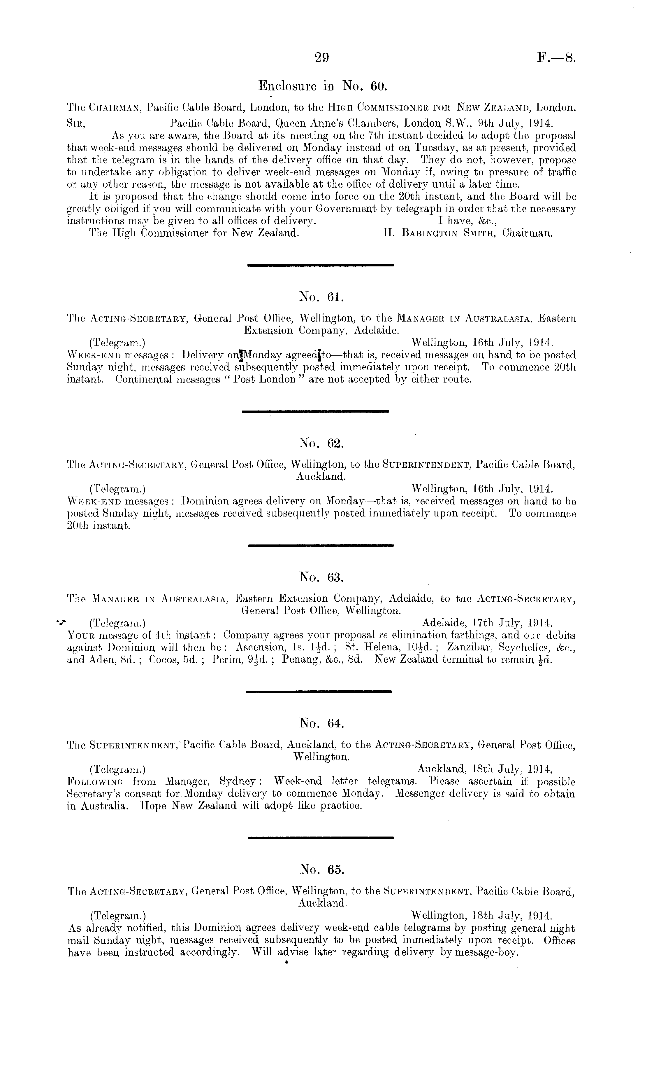 Enclosure in No. 60. The Chairman, Pacific Cable Board, London, to the High Commissioner for New Zealand, London. Sir, — Pacific Cable Board, Queen Anne's Chambers, London S.W., 9th July, 1914. As you are aware, the Board at its meeting on the 7th instant decided to adopt the proposal that week-end messages should be delivered on Monday instead of on Tuesday, as at present, provided that the telegram is in the hands of the delivery office on that day. They do not, however, propose to undertake any obligation to deliver week-end messages on Monday if, owing to pressure of traffic or any other reason, the message is not available at the office of delivery until a later time. It is proposed that the change should come into force on the 20th instant, and the Board will be greatly obliged if you will communicate with your Government by telegraph in order that the necessary instructions may be given to all offices of delivery. I have, &c, The High Commissioner for New Zealand. H. Babington Smith, Chairman.