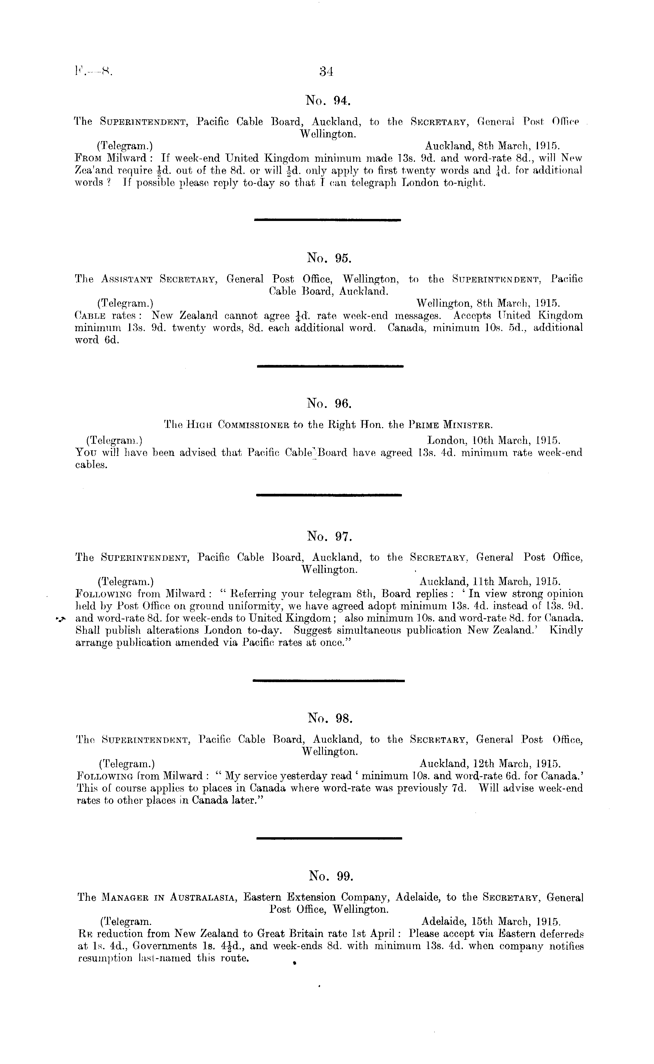 No. 99. The Manager in Australasia, Eastern Extension Company, Adelaide, to the Secretary, General Post Office, Wellington. (Telegram. Adelaide, 15th March, 1915. Re reduction from New Zealand to Great Britain rate Ist April: Please accept via Eastern deferreds at Is. 4d., Governments Is. 4|d., and week-ends Bd. with minimum 13s. 4d. when company notifies resumption last-named this route. %