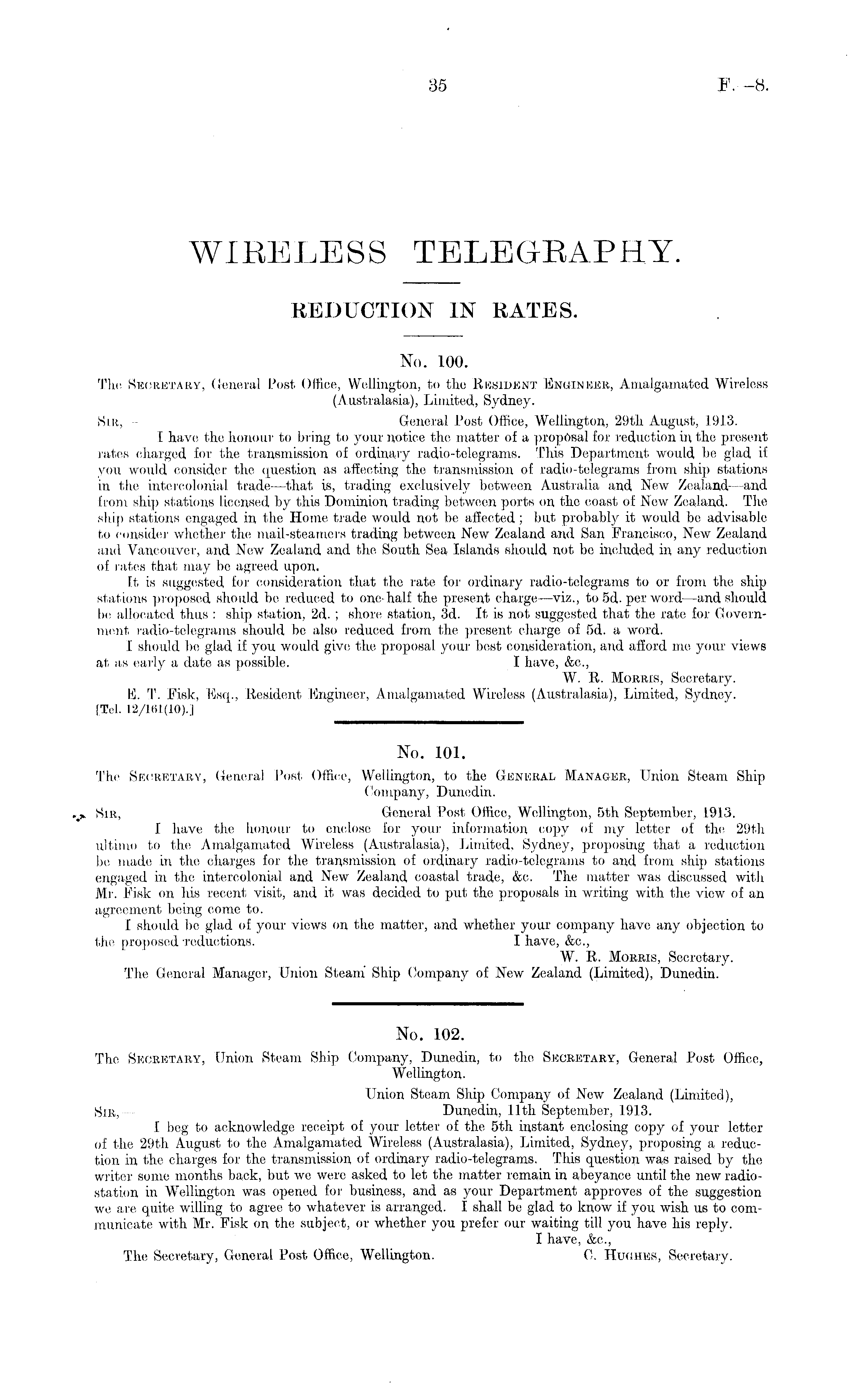WIRELESS TELEGRAPHY. REDUCTION IN RATES. No. 100. The Secretary, General Post Office, Wellington, to the Resident Engineer, Amalgamated Wireless (Australasia), Limited, Sydney. Sir, - General Post Office, Wellington, 29th August, 1913. I have the honour to bring to your notice the matter of a proposal for reduction in the present rates charged for the transmission of ordinary radio-telegrams. This Department would be glad if you would consider the question as affecting the transmission of radio-telegrams from ship stations in the intercolonial trade —that is, trading exclusively between Australia and New Zealand-- and from ship stations licensed by this Dominion trading between ports on the coast of New Zealand. The ship stations engaged in the Home trade would not be affected ; but probably it would be advisable to consider whether the mail-steamers trading between New Zealand and San Francisco, New Zealand and Vancouver, and New Zealand and the South Sea Islands should not be included in any reduction of rates that may be agreed upon. It is suggested for consideration that the rate for ordinary radio-telegrams to or from the ship stations proposed should be reduced to one-half the present charge—viz., to sd. per word—and should lie allocated thus : ship station, 2d. ; shore station, 3d. It is not suggested that the rate for Government radio-telegrams should be also reduced from the present charge of sd. a word. I should be glad if you would give the proposal your best consideration, and afford me your views at as early a date as possible. I have, &c, W. R. Morris, Secretary. E. T. Fisk, Esq., Resident Engineer, Amalgamated Wireless (Australasia), Limited, Sydney. [Tel. 12/161(10).]
