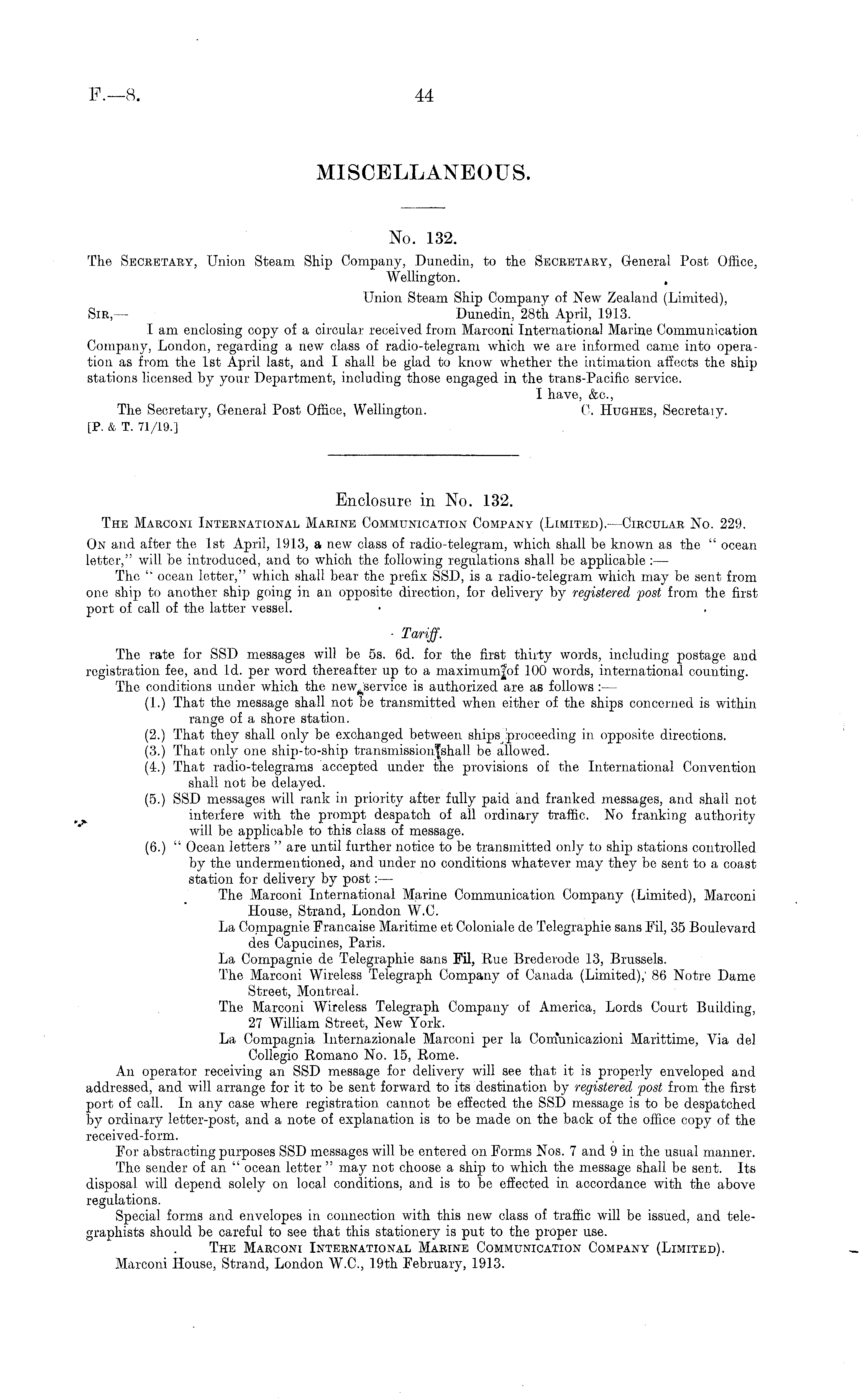 MISCELLANEOUS. No. 132. The Secretary, Union Steam Ship Company, Dunedin, to the Secretary, General Post Office, Wellington. , Union Steam Ship Company of New Zealand (Limited), Sir,— Dunedin, 28th April, 1913. I am enclosing copy of a circular received from Marconi International Marine Communication Company, London, regarding a new class of radio-telegram which we are informed came into operation as from the Ist April last, and I shall be glad to know whether the intimation affects the ship stations licensed by your Department, including those engaged in the trans-Pacific service. I have, &c, The Secretary, General Post Office, Wellington. C. Hughes, Secretaiy. [P. & T. 7.1/19.]