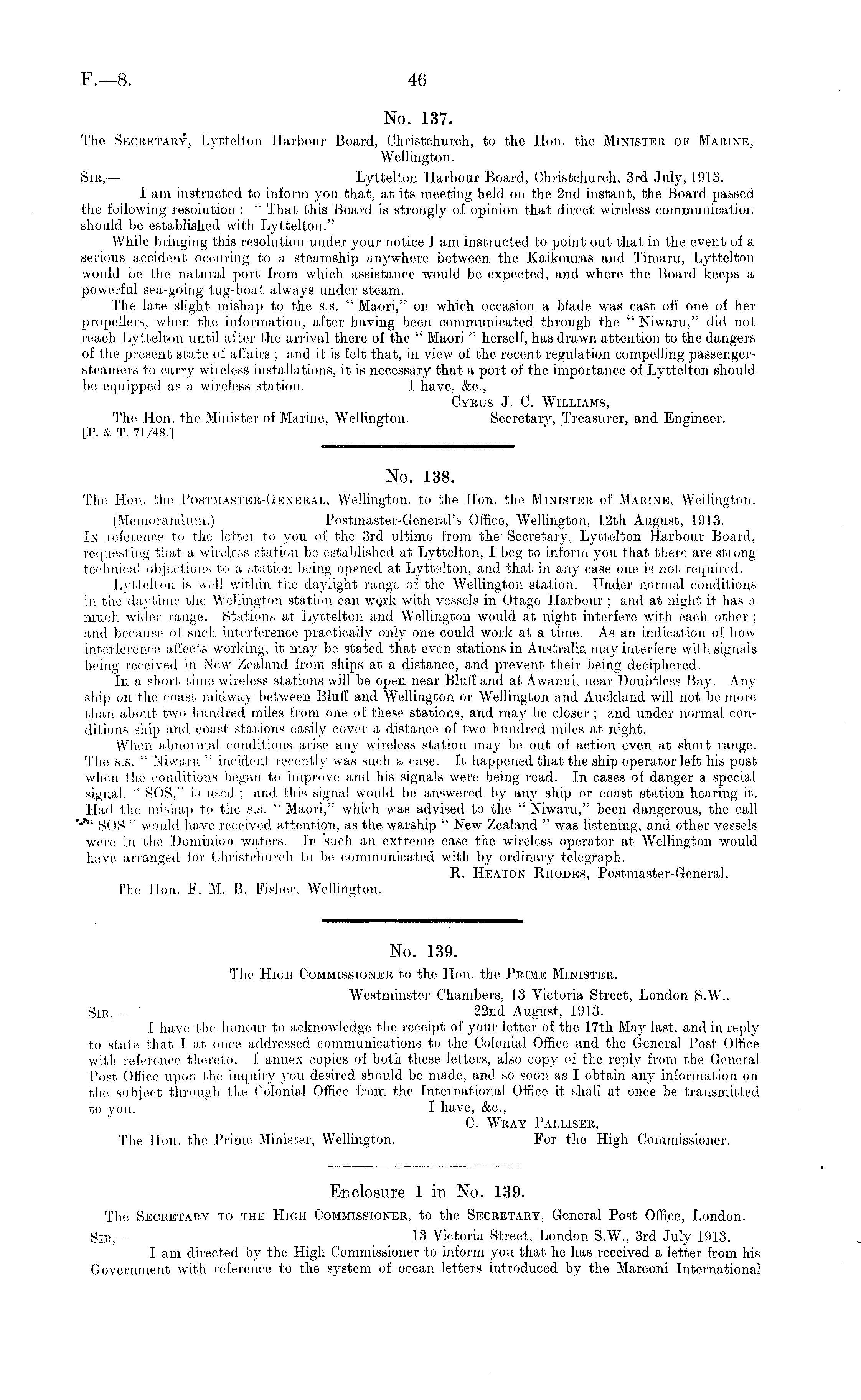 No. 139. The High Commissioner to the Hon. the Prime Minister. Westminster Chambers, 13 Victoria Street, London S.W.. Sir,— 22nd August, 1913. I have the honour to acknowledge the receipt of your letter of the 17th May last, and in reply to state that I at once addressed communications to the Colonial Office and the General Post Office with reference thereto. I annex copies of both these letters, also copy of the reply from the General Post Office upon the inquiry you desired should be made, and so soon as I obtain any information on the, subject through the Colonial Office from the International Office it shall at once be transmitted to you. I have, &c, C. Wray Palliser, The Hon. the Prime Minister, Wellington. For the High Commissioner.