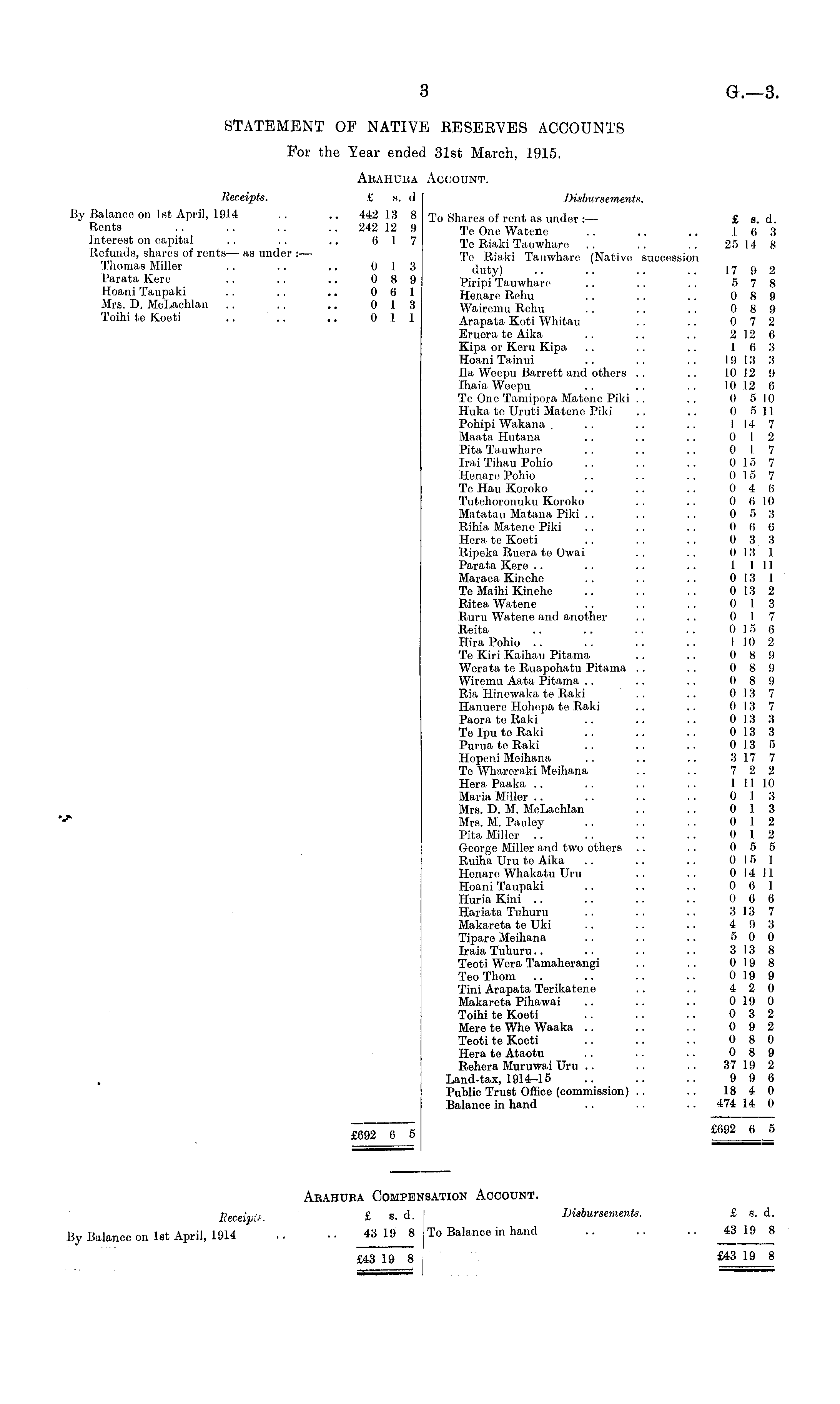 STATEMENT OF NATIVE EESEEVES ACCOUNTS For the Year ended 31st March, 1915. Arahura Account. Receipts. £ s. d Disbursements. By Balance on Ist April, 1914 .. .. 442 13 8 To Shares of rent as under:— £ s. d. Rents • • • • • • .. 242 12 9 Te One Watene .. .. .. 16 3 interest on capital .. .. 6 17 Te Riaki Tauwhare 25 14 8 Refunds, shares of rents—asunder:— To Riaki Tauwhare (Native succession Thomas Miller .. .. .. 0 13 duty) 17 9 2 ParataKero 0 8 9 Piripi Tauwhare '.'. '.'. '.'. 5 7 8 Hoard Taupaki 0 6 1 Henare Rehu .. .. .. 0 8 9 Mrs D. McLachlan 0 13 Wairemu Rehu 0 8 9 loihite Koeti .. .. .. 0 11 Arapata Koti Whitau .. .. 0 7 2 Eruera te Aika .. .. .. 2 12 6 Kipa or Keru Kipa .. .. .. 16 3 Hoani Tainui .. .. .. 19 13 3 Ua Woepu Barrett and others .. .. 10 12 9 Ihaia Woepu .. . . .. 10 12 6 To One Tamipora Matcne Piki .. .. 0 510 Huka to Uruti Matene Piki .. .. 0 511 Pohipi Wakana . .. .. .. 114 7 Maata Hutana .. .. .. 0 12 Pita Tauwhare . . .. .. 0 17 Irai Tihau Pohio .. .. .. 0 15 7 Henare Pohio .. .. .. 0 15 7 Te Hau Koroko .. .. .. 0 4 6 Tutchoronuku Koroko .. .. 0 6 10 Matatau Matana Piki .. .. .. 0 5 3 Rihia Matene Piki .. .. .. 0 6 6 Hera te Koeti .. .. .. 0 3 3 Ripeka Ruera to Owai .. .. 0 13 1 Parata Kere .. .. .. .. 1111 Maraoa Kinehe . . .. .. 0 13 1 Te Maihi Kineho .. .. .. 0 13 2 Ritea Watene .. .. .. 0 13 Ruru Watene and another .. .. 0 17 Reita .. .. .. .. 0 15 6 Hira Pohio .. .. .. .. 110 2 Te Kiri Kaihau Pitama .. .. 0 8 9 Werata te Ruapohatu Pitama .. .. 0 8 9 Wiremu Aata Pitama .. .. .. 0 8 9 Ria Hinewaka te Raid .. .. 0 13 7 Hanuere Hohopa te Raki .. .. 0 13 7 Paora toßaki .. .. .. 0 13 3 Te Ipu tcßaki .. .. .. 0 13 3 Purua te Raki .. .. .. 0 13 5 Hoponi Meihana .. .. .. 317 7 Te Whareraki Meihana .. .. 7 2 2 Hera Paaka .. .. .. .. 11110 Maria Miller .. .. .. .. 0 13 Mrs. D. M. McLachlan . . .. 0 13 '•" Mrs. M. Pauley .. .. .. 0 12 Pita Miller .. .. .. .. 0 12 George Miller and two others .. .. 0 5 5 Ruiha Uru te Aika .. .. .. 015 I Henare Whakatu Uru .. .. 0 14 11 Hoani Taupaki .. .. .. 0 6 1 Huria Kini .. .. .. .. 0 6 6 Hariata Tuhuru .. . . .. 313 7 Makareta tc Uki .. .. .. 4 9 3 Tipare Meihana .. .. .. 5 0 0 Iraia Tuhuru.. .. .. •• 3138 Teoti Wera Tamaherangi .. .. 0 19 8 Teo Thorn .. .. .. .. 0199 Tini Arapata Terikatene .. .. 4 2 0 Makareta Pihawai .. .. .. 019 0 Toihi to Koeti .. . . .. 0 3 2 Mere te Who Waaka .. .. .. 0 9 2 Teoti te Koeti .. .. .. 0 8 0 Hera te Ataotu .. .. .. 0 8 9 Rehera Muruwai Uru .. .. .. 37 19 2 Land-tax, 1914-15 .. .. .. 9 9 6 Public Trust Office (commission) .. .. 18 4 0 Balance in hand . . .. .. 474 14 0 £692 6 5 £692 6 5 Abahura Compensation Account. Iteceipis. £ a. A. Disbursements. £ a. A. By Balance on Ist April, 1914 .. •• 43 19 BTo Balance in hand 43 19 8 £43 19 8 __L-__ 8