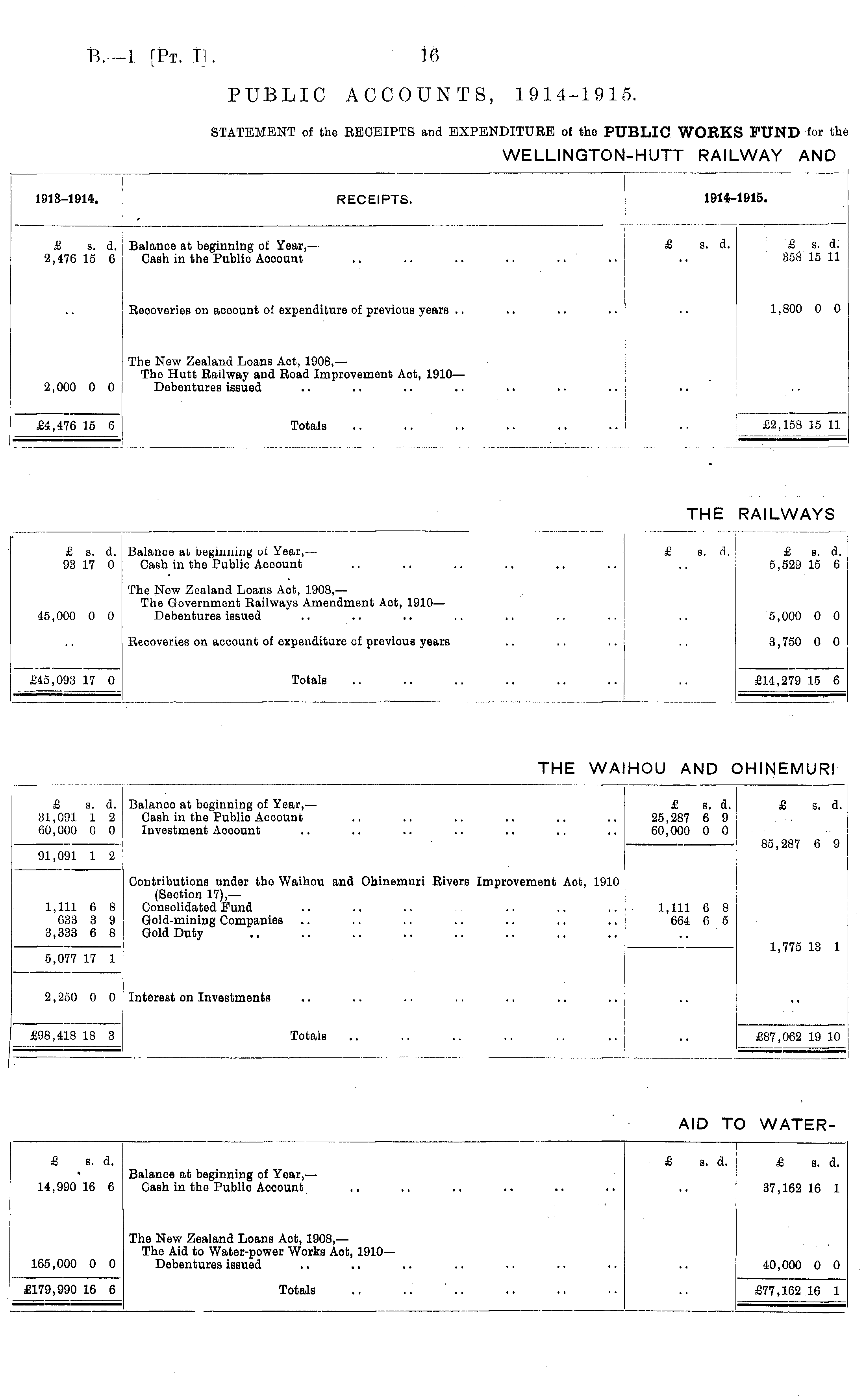 WELLINGTO -HUTT RAILWAY AND 1913-1914. I RECEIPTS. 1914-1915. £ s. d. 2,476 15 6 Balance at beginning of Year, — Cash in the Publio Aooount £ s. d. £ s. d. £ s. d. 358 15 11 358 15 11 Recoveries on account of expenditure of previous years .. 1,800 0 0 1,800 0 0 2,000 0 0 The New Zealand Loans Act, 1908,— The Hutt Railway and Road Improvement Aot, 1910— Debentures issued £4,476 15 6 Totals £2,158 15 11 £2,158 15 11 THE RAILWAYS £ s. d. 93 17 0 Balance at beginning oi Year, — Cash in the Public Account £ 8. a. £ s. d. 5,529 15 6 45,000 0 0 The New Zealand Loans Aot, 1908,— The Government Railways Amendment Act, 1910— Debentures issued 5,000 0 0 Recoveries on account of expenditure of previous years 3,750 0 0 £45,093 17 0 Totals £14,279 15 6 £14,279 15 6 THE WA HOU AND HINEMURI £ s. d. 31,091 1 2 60,000 0 0 Balanoe at beginning of Year, — Cash in the Publio Aeoount Investment Aooount £ s. d. 25,287 6 9 60,000 0 0 £ s. d. 91,091 1 2 Contributions under the Waihou and Ohinemuri Bivers Improvement Aot, 1910 (Section 17),— Consolidated Fund Gold-mining Companies Gold Duty 85,287 6 9 1,111 6 8 633 3 9 3,333 6 8 1,111 6 8 664 6 5 1,775 13 1 5,077 17 1 Interest on Investments 2,250 0 0 £98,418 18 3 Totals £87,062 19 10 AID T WATER- £ s. d. £ s. d. £ s. d. 14,990 16 6 Balance at beginning of Year, — Cash in the Publio Aeoount 37,162 16 1 165,000 0 0 The New Zealand Loans Aot, 1908,— The Aid to Water-power Works Aot, 1910— Debentures issued 40,000 0 0 £179,990 16 6 Totals £77,162 16 1