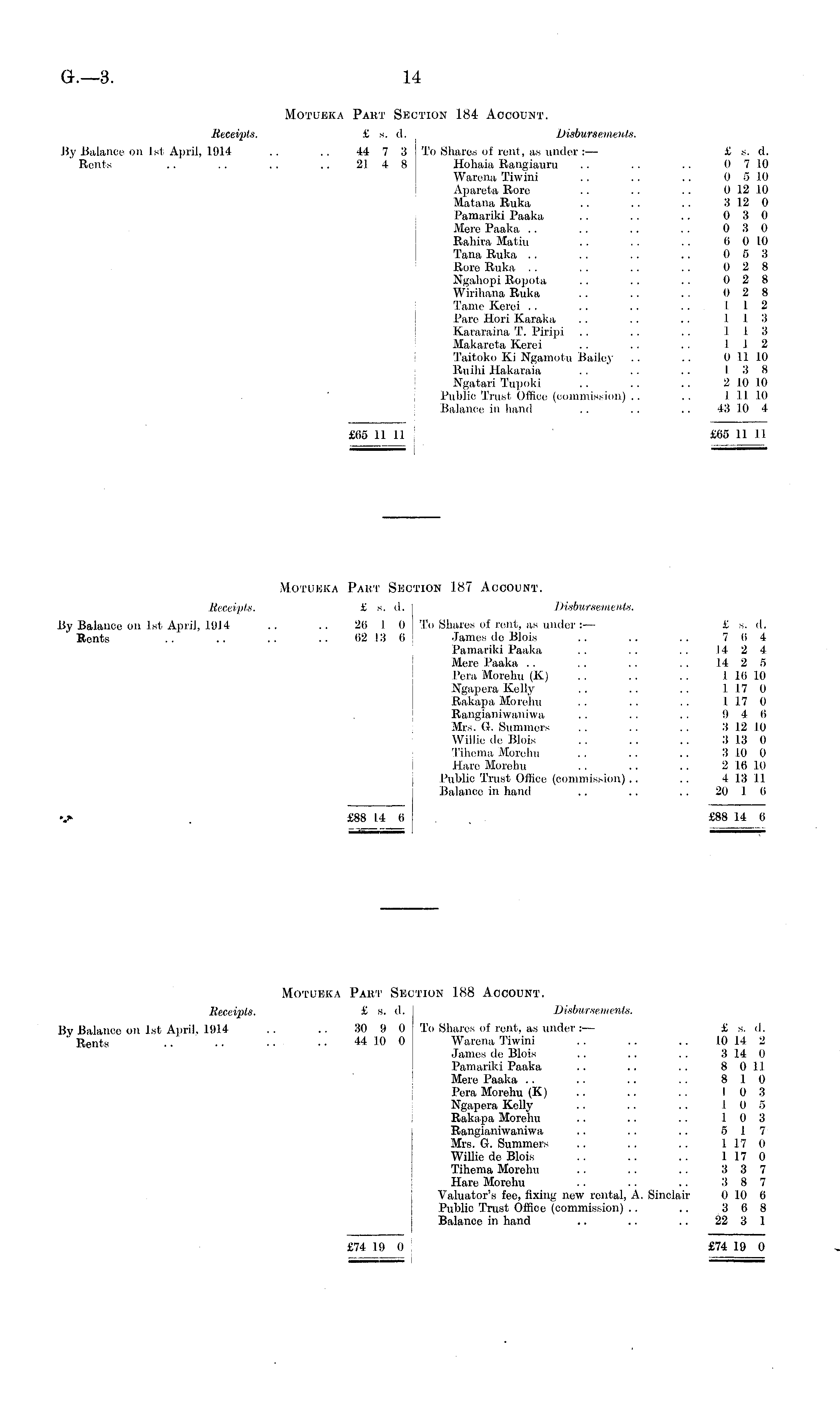 Motueka Part Section 188 Account. Receipts. £ a. A. Disbursements. By Balance on Ist April. 1914 .. .. 30 9 0 To Shares of rent, as under: — £ s. d. 'Rents .. .. .. .. 44 10 0 Warena Tiwini .. .. .. 10 14 2 James de Blois . . . . . . 3 14 0 Pamariki Paaka .. .. .. 8 011 Mere Paaka .. .. .. .. 8 10 Pera Morehu (X) .. .. .. 10 3 Ngapera Kelly .. .. .. 10 5 Rakapa Morehu .. .. .. 10 3 Rangianrwaniwa .. .. .. 5 17 Mrs. G. Summers .. . . .. 117 0 Willie de Blois . . .. .. 117 0 Tihema Morehu .. .. .. 3 3 7 Hare Morehu .. .. .. 3 8 7 Valuator's fee, fixing new rental, A. Sinclair 0 10 6 Public Trust Office (commission) .. .. 3 6 8 Balance in hand .. .. .. 22 3 1 £74 19 0 £74 19 0