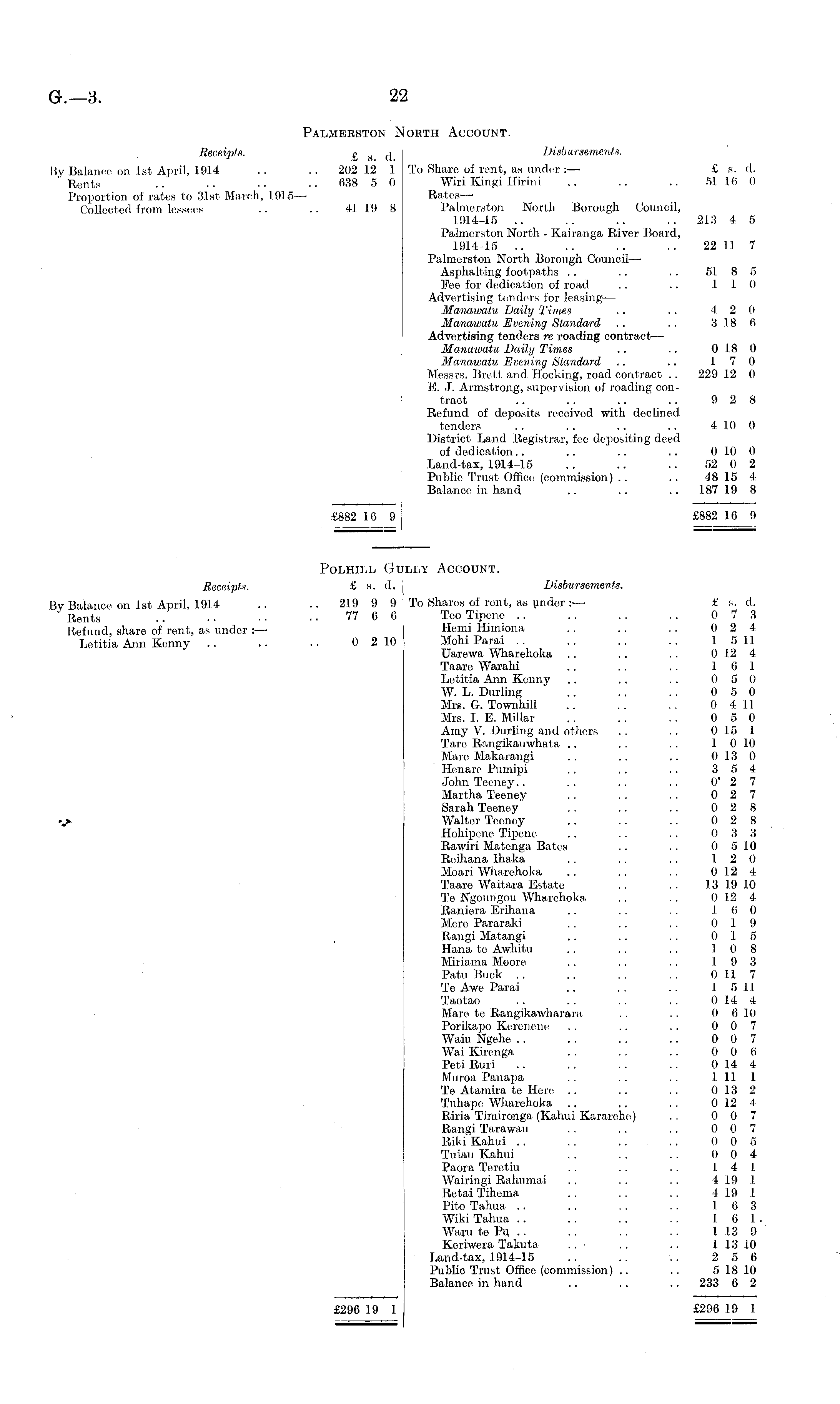 Palmerston North Account. Receipts. £ s d Disbursements. By Balance on Ist April, 1914 .. .. 202 12 1 To Share of rent, as under:— £s. d. Rents .. .. .. 638 5 0 Wiri Kingi Hirini .. .. .. 51 16 0 Proportion of rates to 31st March, 1915— RatesCollected from lessees .. .. 41 19 8 Palmerston North Borough Council, 1914-15 .. .. .. .. 213 4 5 Palmerston North - Kairanga River Board, 1914-1.5 .. .. .. .. 22 II 7 Palmerston North Borough Council — Asphalting footpaths .. .. .. 51 8 5 Fee for dedication of road .. .. 110 Advertising tenders for leasing— Manawatn Daily Times .. .. 42 0 Manawalu Evening Standard .. .. 3 18 6 Advertising tenders re roading contract — Manawatu Daily Times .. .. 0 18 0 Manawalu Evening Standard .. .. 17 0 Messrs. Brett and Hocking, road contract .. 229 12 0 E. J. Armstrong, supervision of roading contract .. .. .. .. 9 2 8 Refund of deposits recoivod with declined tenders .. .. .. .. 410 0 District Land Registrar, fee depositing deed of dedication.. .. .. .. 0 10 0 Land-tax, 1914-15 .. .. .. 52 0 2 Public Trust Office (commission) .. .. 48 15 4 Balanoe in hand .. .. .. 187 19 8 £882 16 9 £882 16 9