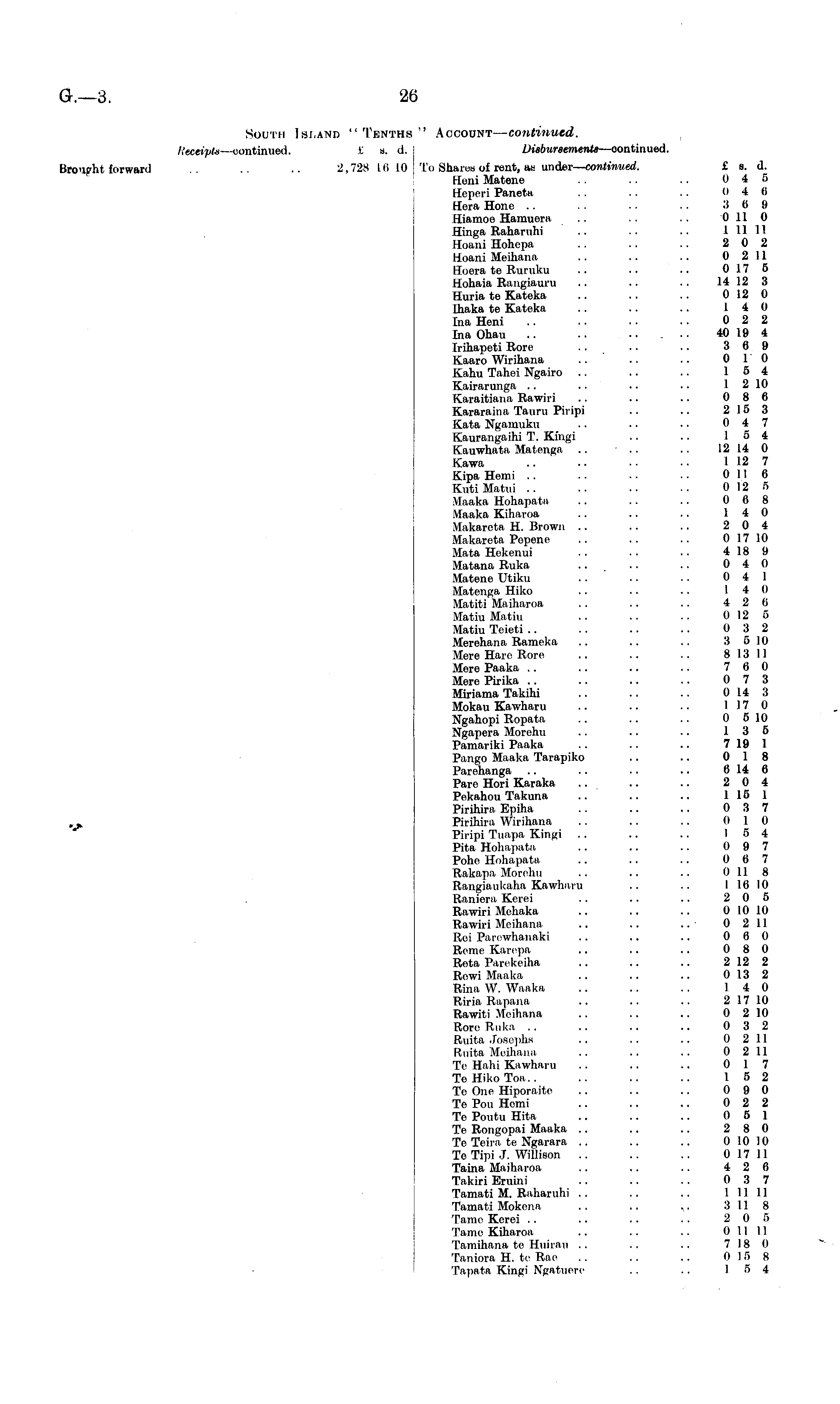 South Island "Tenths" Account — continued. ( Heceipts —continued. £ s. d. Disbursements —continued. Brought forward .. .. 2,728 16 10 To Shares of rent, as under— continued.. £ s. d. Herri Matene .. .. .. 0 4 5 Heperi Paneta . . .. 0 4 6 Hera Hone .. .. 3 6 9 Hiamoo Hamuera .. . . . . 0 110 Hinga Raharuhi .. .. .. I 11 11 Hoarri Hohepa .. .. 2 0 2 Hoard Meiharra .. .. .. 0 2 II Hoera te Ruruku .. .. .. 017 5 Hohaia Rangiauru .. .. .. 14 12 3 Huria te Kateka .. .. .. 012 0 Ihaka te Kateka .. .. .. 14 0 Ina Heni .. .. • • - • 0 2 2 Ina Ohau .. .. -. ... 40 19 4 Irihapeti Rore .. .. .. 3 6 9 Kaaro Wirihana .. .. .. 0 10 Kahu Tahei Ngairo .. .. .. 15 4 Kairarunga .. .. .. .. 1 2 10 Karaitiarra Rawiri .. .. .. 0 8 6 Kararaina Tauru Piripi .. .. 2 15 3 Kata Ngamuku .. • • ■ • 0 4 7 Kaurangaihi T. Kingi .. .. 15 4 Kauwhata Matenga .. .. .. 12 14 0 Kawa .. .. •• •• 1 12 7 Kipa Hemi .. .. 0 116 Kuti Matui .. .. • • ■ • 0 12 5 Maaka Hohapata .. .. .. 0 6 8 Maaka Kiharna .. .. .. 14 0 Makareta H. Browrr .. .. .. 2 0 4 Makareta Pepene .. .. .. 0 17 10 Mata Hekenui .. .. .. 4 18 9 Matana Ruka .. .. .. 0 4 0 Matene Utiku .. .. .. 0 4 1 Matenga Hiko .. .. .. 14 0 Matiti Maiharoa .. .. .. 4 2 6 Matiu Matiu .. .. • ■ 012 5 Matiu Teieti .. .. .. .. 0 3 2 Merehana Rameka .. .. .. 3 510 More Hare Rore .. .. .. 813 11 Mere Paaka .. .. .. .. 7 6 0 Mere Pirika .. .. .. .. 0 7 3 Miriama Takihi .. .. .. 0 14 3 Mokau Kawharu .. .. .. 117 0 Ngahopi Ropata .. .. .. 0 510 Ngapera Morehu .. .. ■. 13 5 Pamariki Paaka .. .. .. 7 19 1 Parrgo Maaka Tarapiko .. .. 0 18 Parohanga .. .. .. .. 6 14 6 Pare Hori Karaka .. .. .. 2 0 4 Pekahou Takuna .. .. .. 1 15 1 Pirihira Epiha .. .. .. 0 3 7 __, Pirihira Wirihana .. .. .. 0 10 Piripi Tuapa Kingi .. .. .. 15 4 Pita Hohapata .. .. .. 0 9 7 Pohe Hohapata .. .. .. 0 6 7 Rakapa, Morehu .. .. .. 0 U 8 Rangiaukaha Kawharu .. .. I 16 10 Raniera Kerei .. .. .. 2 0 5 Rawiri Mehaka .. .. .. 0 10 10 Rawiri Meihana. .. .. .. ■ 0 2 11 Rei Parewhanaki .. .. .. 0 6 0 Rome Karepa .. .. .. 0 8 0 Reta Parekeiha .. .. .. 212 2 Rowi Maaka .. .. .. 0 13 2 Rina W. Waaka .. .. . . 14 0 Riria Rapana .. .. .. 2 17 10 Rawiti Meihana .. .. .. 0 2 10 Rore Ruka .. .. .. .. 0 3 2 Ruita Josephs .. . . .. 0 211 Ruita Meihana .. .. .. 0 2 11 Te Hahi Kawharu .. .. .. 0 17 Te Hiko Toa.. .. .. .. 15 2 Tc One Hiporaite .. .. .. 0 9 0 Te Pou Hemi .. .. .. 0 2 2 Te Poutu Hita .. .. .. 0 5 1 Te Rongopar Maaka .. .. .. 2 8 0 Te Teira te Ngarara .. .. .. 0 10 10 TeTipi J. Willison .. .. .. 017 II Taina Maiharoa .. .. .. 4 2 6 Takiri Eruini .. .. .. 0 3 7 Tamati M. Raharuhi .. .. .. I 11 1 I Tamati Mokena . . . . v 3 118 Tame Kerei . . .. .. .. 2 0 5 Tame Kiharoa .. .. .. 011 11 Tamihana te Huirau .. .. .. 7 18 0 Taniora 11. te Rae .. .. ... 015 8 Tapata Kingi Ngatuere .. .. 15 4