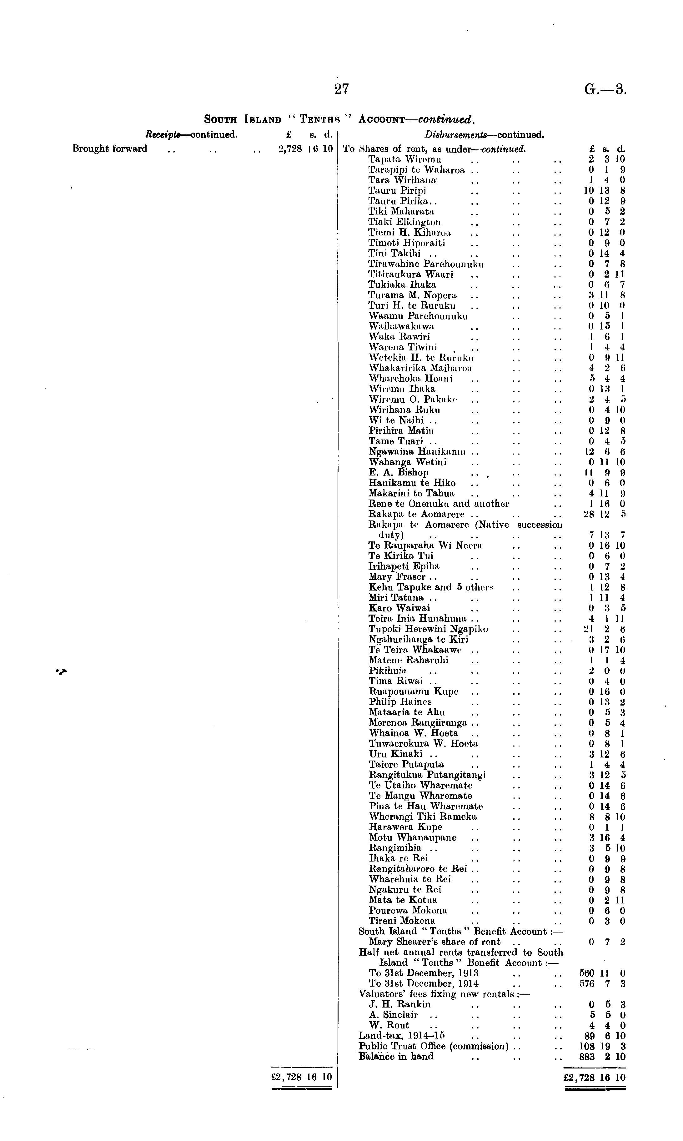 South Island "Tenths" Account— continued. Receipts —oontinued. £ s. d. Disbursements —continued. Brought forward .. .. .. 2,728 16 10 To Shares of rent, as under- continued. £a. d. Tapata Wiremu .. .. .. 2 3 10 Tarapipi te Waharoa .. .. .. 0 19 Tara Wirihana .. .. .. 14 0 Tauru Piripi .. .. .. 10 13 8 Tauru Pirika.. .. .. .. 0 12 9 Tiki Maharaja .. .. .. 0 5 2 Tiaki Elldngton .. .. .. 0 7 2 Tiemi H. Kiharoa .. .. .. 0 12 0 Timoti Hiporaiti .. .. .. 0 9 0 Tini Takihi . . . . .. .. 0 14 4 Tirawahine Parehoiniukii .. .. 0 7 8 Titiraukura Waari .. .. .. 0 2 11 Tukiaka Ihaka .. .. .. 0 (i 7 Turama M. Nopera .. .. .. 3 118 Turi H. te Ruruku .. .. 0 10 0 Waamu Pareliouuiiku . . . . 0 5 1 Waikawakawa .. .. .. 0 15 l W.i ka Rawiri .. .. . . 16 1 Warena Tiwini .. .. 14 4 Wetekia H. te Ruruku .. .. 0 9 11 Whakaririka Maiharoa .. .. 4 2 6 Wharehoka Eoani .. .. .. 5 4 4 Wiremu lliakn .. .. .. 0 13 I Wiremu O. Pakake .. .. . . 2 15 Wirihana Ruku .. .. .. 0 410 Wi te Naihi .. .. .. .. 0 9 0 Pirihira Matiu .. .. . . 0 12 8 Tame Tuari .. .. . . 0 4 5 Ngawaina Hanikanni .. .. .. 12 6 6 Wahanga Wetini .. .. .. 0 II 10 E. A. Bishop . . _ .. .. 119 9 Hanikamu te Hiko .. .. .. 0 6 0 Makarini te Tahua .. .. .. 4 119 Rene te Onenuku anil another .. I 16 0 Rakapa te Aomarere .. .. .. 28 12 5 Rakapa le Aomarere (Native succession duty) .. .. .. .. 7 13 7 Te Rauparaha Wi Neera .. .. 0 Hi 10 Te Kirika Tui .. .. .. 0 6 0 Irihapeti Epiha .. . . .. 0 7 2 Mary Eraser .. .. .. .. 0 13 4 Kehu Tapuke and 5 others .. .. I 12 8 Miri Tatana .. .. .. .. I 11 I Karo Waiwai .. .. .. 0 3 6 Teira Inia, Hunahuna . . .. .. 4 111 Tupoki lleiewini Ngapiko .. .. 21 2 6 Ngahurihanga le Kiri .. .. 3 2 6 Te Teira Whakaawe .. .. .. II 17 10 Matene Raharuhi .. . . .. 11l V Pikihuia .. .. .. . . 2 0 0 Tima Riwai .. .. .. .. 0 4 0 Ruapounamu Kupe .. .. .. 0 16 0 Philip Haines .. .. .. 0 13 2 Mataarra tc Aim .. .. .. 0 5 3 Merenoa Rangiirunga .. .. .. 0 5 4 Whainoa W. Hoeta .. .. . . 0 8 1 Tiiwaerokura W. Hoeta . . . . 0 8 1 Uru Kinaki .. .. .. . . 3 12 6 Tarere Putapul.i .. .. .. 14 4 IJangitukiia, Putangitaiigi .. .. 3 12 5 Te Utaiho Wharcma I c .. .. 0 14 6 Te Mangu Wharemate .. .. 0 14 6 Pina te Hau Wharemate .. .. 0 14 6 Wherangi Tiki Rameka .. .. 8 810 Harawera Kupe .. .. .. Oil Motu Whanaupane .. .. .. 3 16 4 Rangimihia .. .. .. .. 3 510 Ihaka re Rei .. .. .. 0 9 9 Rangitaharoro te Rei .. .. .. 0 9 8 Wharehuia to Rei .. .. .. 0 9 8 Ngakuru te Rei .. .. .. 0 9 8 Mata te Kotua .. .. .. 0 211 Pourowa Mokena .. .. .. 0 6 0 Tireni Mokena . . . . . . 0 3 0 South Island " Tenths " Benefit Account :— Mary Shearer's share of rent .. .. 0 7 2 Half net annual rents transferred to South Island " Tenths " Benefit Account:— To 31st December, 1913 .. '.. 560 11 0 To 31st December, 1914 .. .. 576 7 3 Valuators' fees lixin_ new rentals :— J. H. Rankin .. .. 0 5 3 A. Sinclair .. .. .. .. 5 5 0 W. Rout .. .. .. .. 4 4 0 Land-tax, 1914-15 .. .. .. 89 6 10 Public Trust Office (commission) . . .. 108 19 3 Balance in hand .. .. .. 883 2 10 £2,728 16 10 £2,728 16 10