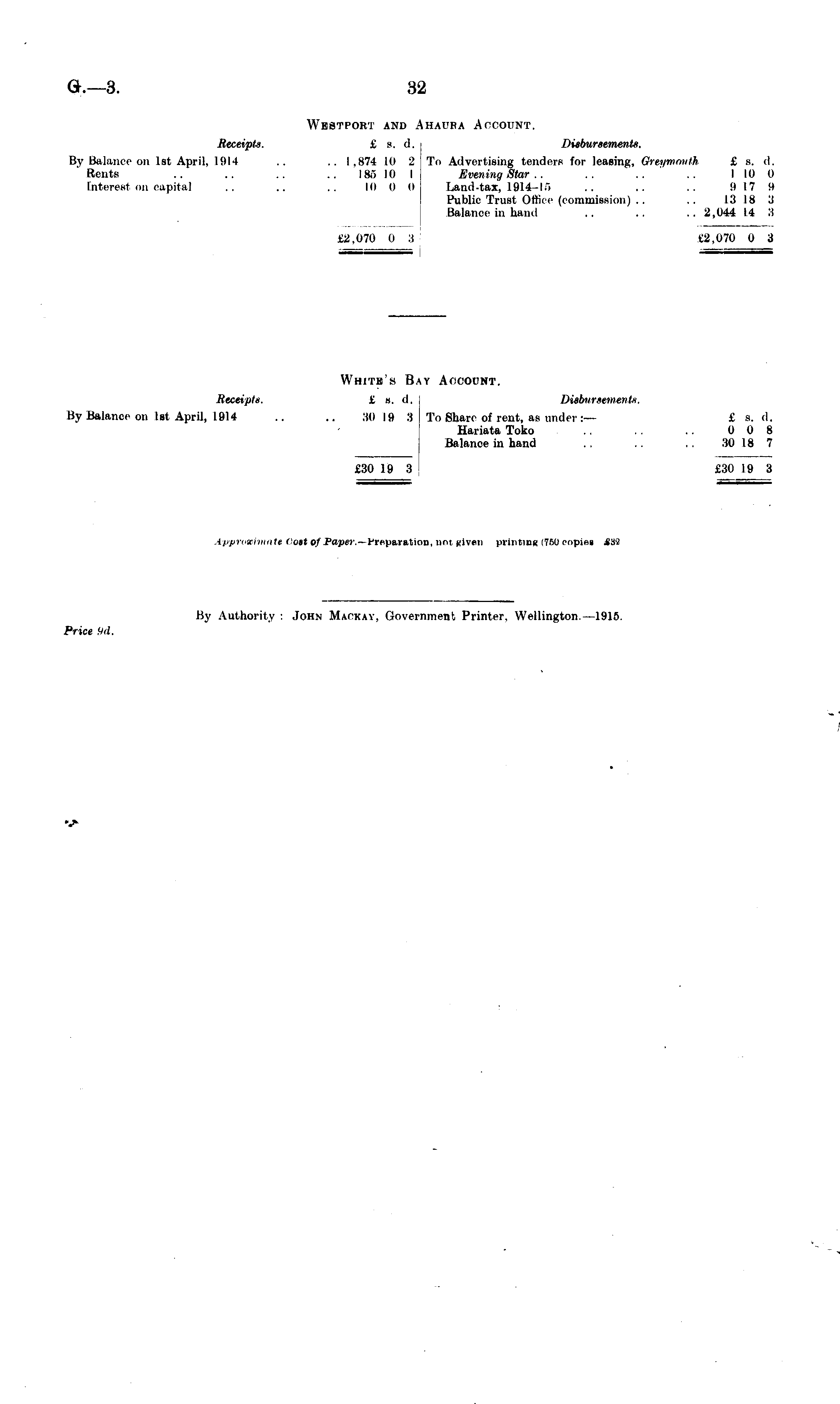 Westport and Ahaiira Account. Receipts. £ a. A. Disbursements. By Balance on Ist April, 1914 .. .. 1,874 10 2 To Advertising tenders for leasing, Greymouth £ a. A. Rents .. .. .. .. 185 10 I Evening Star .. .. .. .. I 111 n Interest on capital .. .. .. 10 0 0 Land-tax, 1914-15 .. .. .. 9 17 9 Public Trust Office (commission) .. .. 13 18 3 Balance iir hand .. .. .. 2,044 14 3 £2.070 0 3 £2,070 0 3 Whitb's Bay Account. Receipts. £ s. d. Disbursements. By Balance on Ist April, 1914 .. .. 30 19 3 To Share of rent, as under:— £ s. d. Hariata Toko .. .. 0 0 8 Balance in hand .. .. .. 30 18 7 £30 19 3 £30 19 3