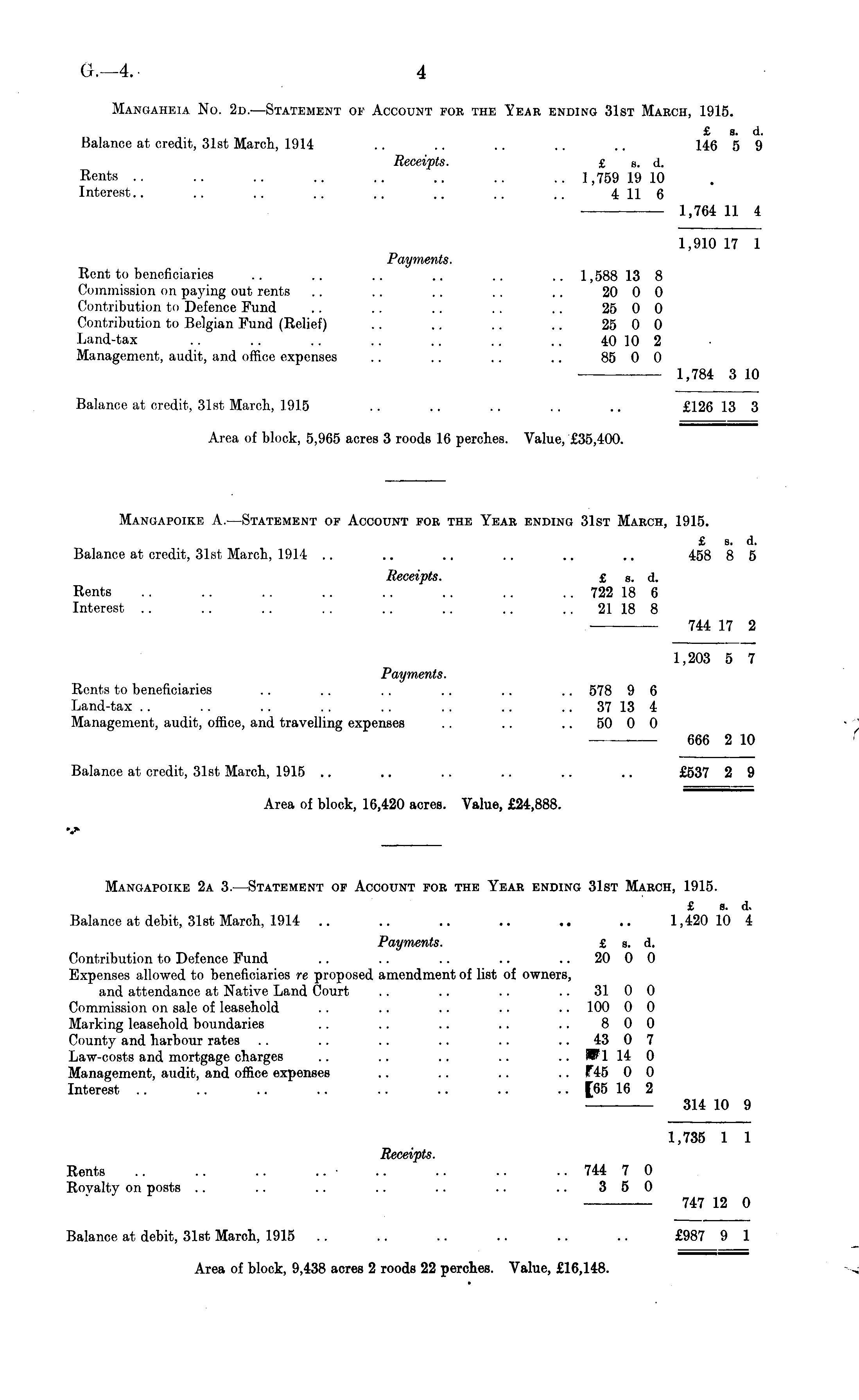 Mangapoike 2a 3.—Statement of Account for the Year ending 31st March, 1915. £ s. d. Balance at debit, 31st March, 1914 .. .. .. .. .. .. 1,420 10 4 Payments. £ s. d. Contribution to Defence Fund .. .. .. .. 20 0 0 Expenses allowed to beneficiaries re proposed amendment of list of owners, and attendance at Native Land Court .. .. .. 31 0 0 Commission on sale of leasehold .. .. .. .. .. 100 0 0 Marking leasehold boundaries .. .. .. .. .. 800 County and harbour rates .. .. .. .. .. 43 0 7 Law-costs and mortgage charges .. .. .. .. .. W\ 14 0 Management, audit, and office expenses .. .. .. .. F45 0 0 Interest .. .. .. .. .. .. .. .. [65 16 2 314 10 9 1,735 1 1 Receipts. Rents .. .. .. .. ■ .. .. .. .. 744 7 0 Royalty on posts .. .. .. .. .. .. .. 350 747 12 0 Balance at debit, 31st March, 1915 .. .. .. .. .. .. £987 9 1 Area of block, 9,438 acres 2 roods 22 perches. Value, £16,148.