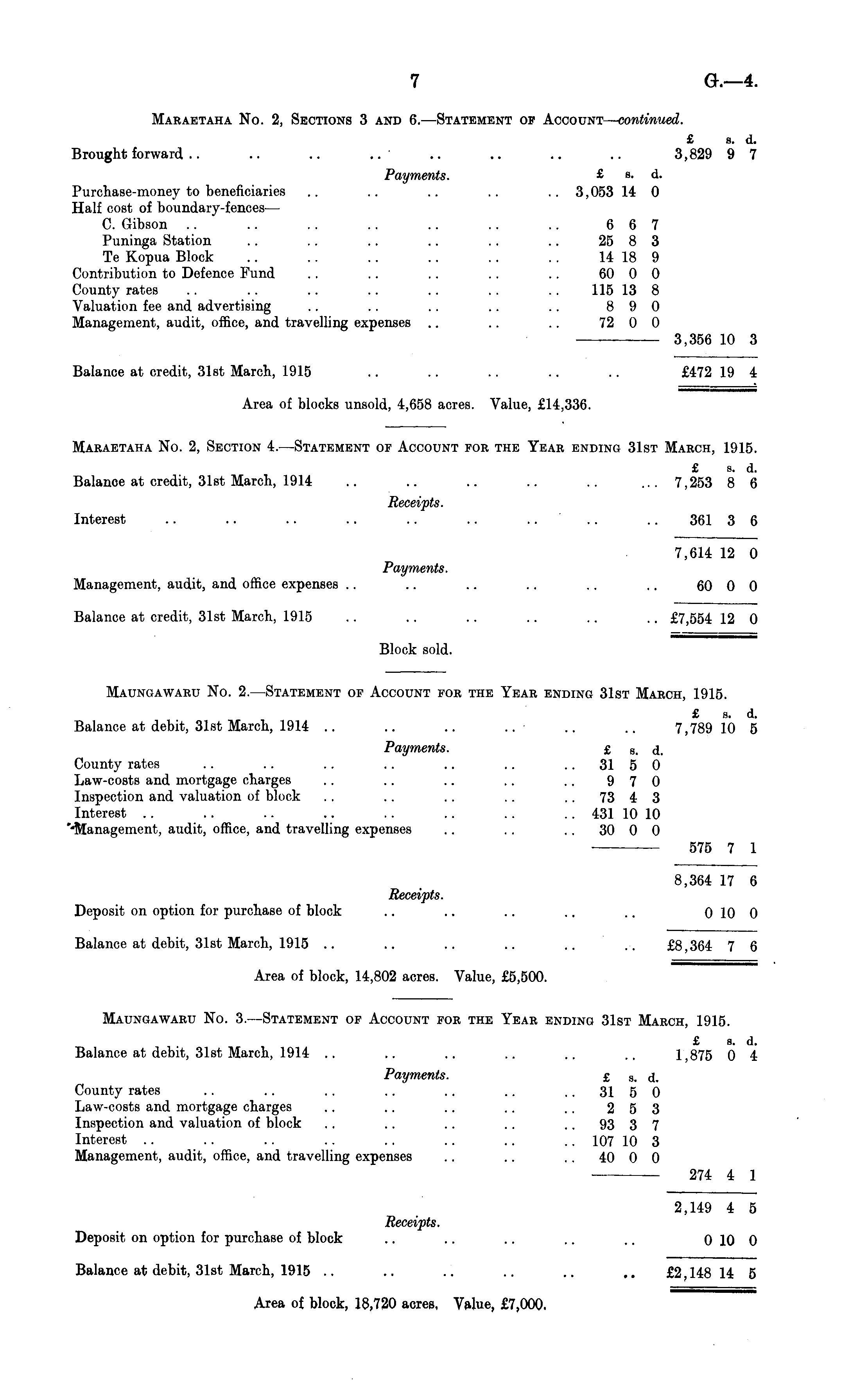Maraetaha No. 2, Section 4. —-Statement of Account for the Year ending 31st March, 1915. £ s. d. Balance at credit, 31st March, 1914 .. .. .. .. .. ... 7,253 8 6 Receipts. Interest .. .. .. .. .. .. .. .. .. 361 3 6 7,614 12 0 Payments. Management, audit, and office expenses .. .. .. .. .. .. 60 0 0 Balance at credit, 31st March, 1915 .. .. .. .. . . .. £7,554 12 0 Block sold.