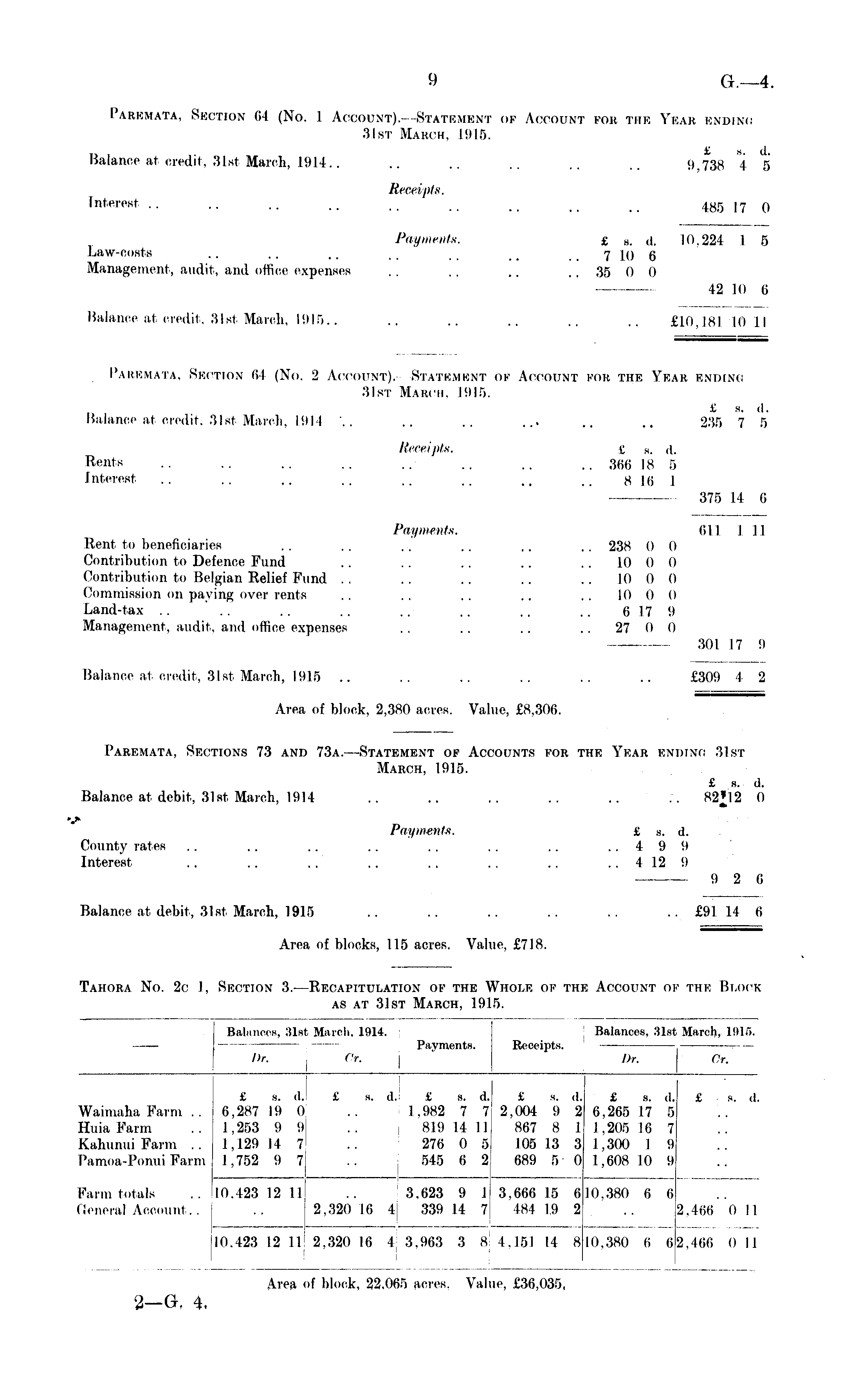Paremata, Section 64 (No. 1 Account). —Statement of Account iron the Year ending 3 Ist March, 11115. Balance at credit, 31st March, 1914.. .. .. .. .. .. 9,738 4 5 Receipts. Interest .. .. .. 485 17 0 Payments. £ s . ( |. 10.224 1 5 Law-costs .. .. .. .. 710 6 Management, audit, and office expenses . . .. 35 0 0 42 10 6 Balance at credit. 31st Maroh, 1915. . .. .. .. ~ .. £10,181 1(1 II I 'a rem ata, Section 64 (No. 2 Account). Statement ok Account for the Year ending 31st March. 1915. £ s. d. Balance at credit, 31st March, 1914 '.. .. .. ... .. .. 235 7 5 Receipts. £ B . d. Rente .. .. .. .. .. .. .. .. 366 18 5 Interest .. .. .. .. .. .. .. .. 816 1 — 375 14 6 Payments. (ill I II Rent, to beneficiaries . . . . ..' .. .. .. 238 0 0 Contribution to Defence Fund .. .. .. .. .. 10 0 0 Contribution to Belgian Relief Fund .. .. .. .. 10 0 0 Commission on paying over rents .. .. .. .. 10 0 0 Land-tax .. .. .. .. .. .. ~ .. 6 17 9 Management, audit, and office expenses . . .. .. 27 0 0 —_ 301 17 9 Balance at credit, 31st March, 1915 .. .. .. .. .. .. £309 4 2 Area of block, 2,380 acres. Value, £8,306. Paremata, Sections 73 and 73a. —Statement of Accounts for the Year ending 31st March, 1915. £ s. d. Balance at debit, 31st March, 1914 .. .. .. .. .. ;. 0 •-*■ Payments. £ s. d. County rates .. .. .. .. , . .. .. ..499 Interest .. .. .. .. .. .. .. ..4129 9 2 6 Balance .at debit, 31st March, 1915 .. .. .. .. .. £91 14 6 Area of blocks, 115 acres. Value, £718.