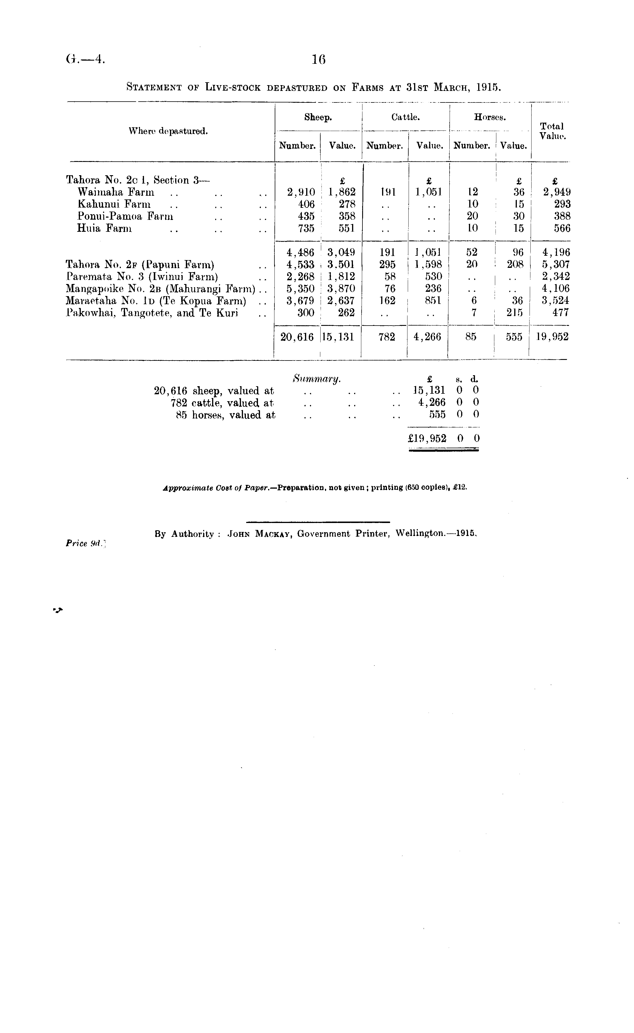 Summary. £ s. d. 20,616 sheep, valued at .. .. .. 15,131 0 0 782 cattle, valued at .. .. .. 4,266 0 0 85 horses, valued at .. .. .. 555 0 0 £19,952 0 0