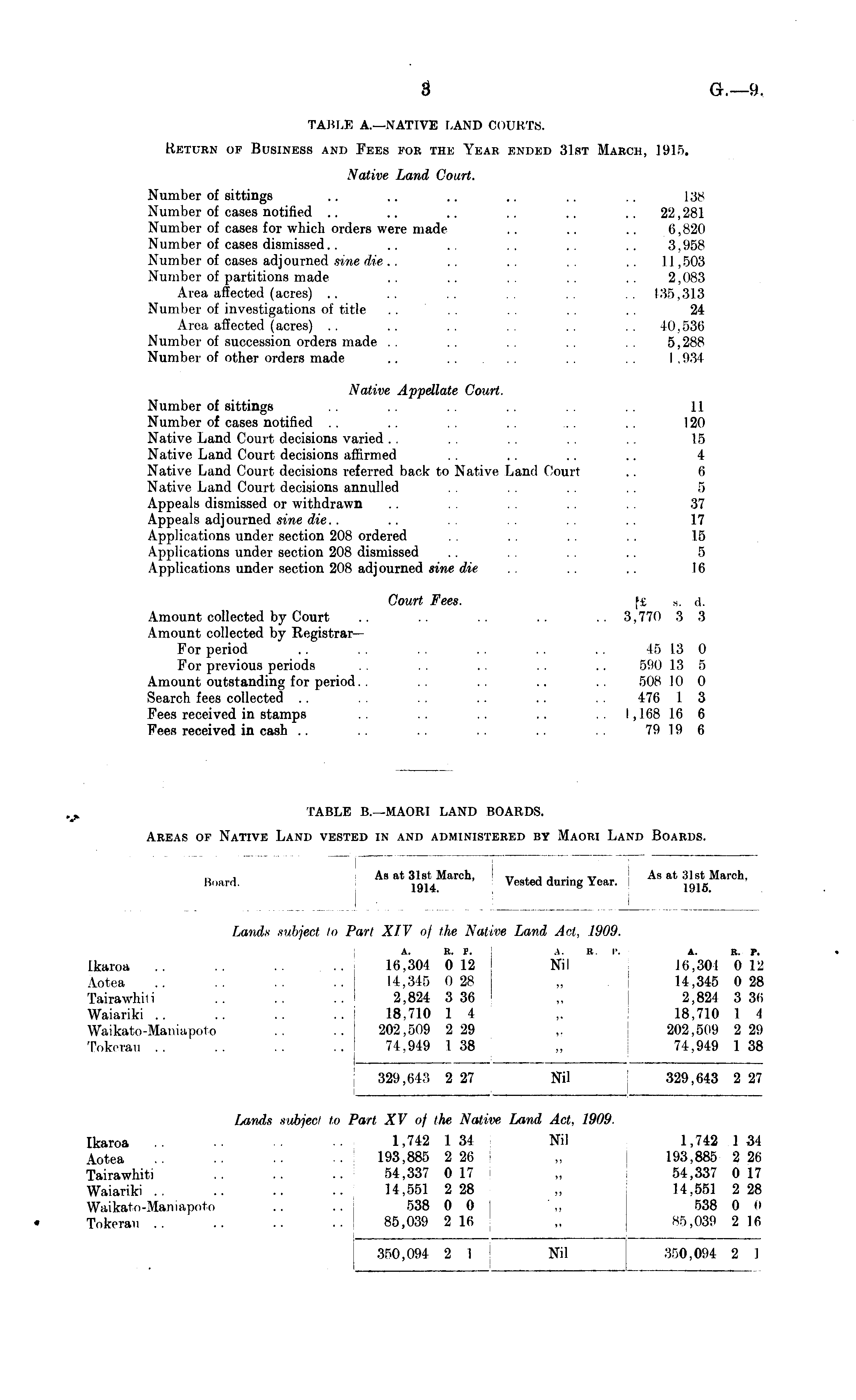 TAULE A.—NATIVE LAND COURTS. Return op Business and Fees for the Year ended 31st March, 1915. Native Land Court. Number of sittings .. .. .. .. ~ .. las Number of cases notified .. .. .. .. ~ .. 22,281 Number of cases for which orders were made .. .. .. 6,820 Number of cases dismissed.. .. .. .. .. .. 3,958 Number of cases adjourned sine die .. .. .. .. .. 11,503 Number of partitions made .. .. .. ~ .. 2,083 Area affected (acres) .. .. .. 135,313 Number of investigations of title . . .. , . .. . . 24 Area affected (acres) .. .. .. .. .. .. -10,536 Number of succession orders made .. .. .. .. 5,288 Number of other orders made .. .. I , 934 Native Appellate Court. Number of sittings .. .. .. .. .. ~ 11 Number of cases notified .. .. .. .. ... .. 120 Native Land Court decisions varied.. .. ~ 15 Native Land Court decisions affirmed .. .. .. .. 4 Native Land Court decisions referred back to Native Land Court .. 6 Native Land Court decisions annulled . . .. .. .. 5 Appeals dismissed or withdrawn .. .. .. 37 Appeals adjourned sine die.. .. .. .. 17 Applications under section 208 ordered .. .. .. .. 15 Applications under section 208 dismissed .. .. .. 5 Applications under section 208 adjourned siwe die .. .. .. 16 Court Fees. f£ «. d. Amount collected by Court .. .. .. .. 3,770 3 3 Amount collected by Registrar— For period .. .. .. .. .. 45 13 0 For previous periods . . .. .. .. 590 13 5 Amount outstanding for period. . .. .. .. 508 10 0 Search fees collected .. .. .. .. .. 476 1 3 Fees received in stamps .. .. .. .. 1,168 16 6 Fees received in cash .. .. .. 79196