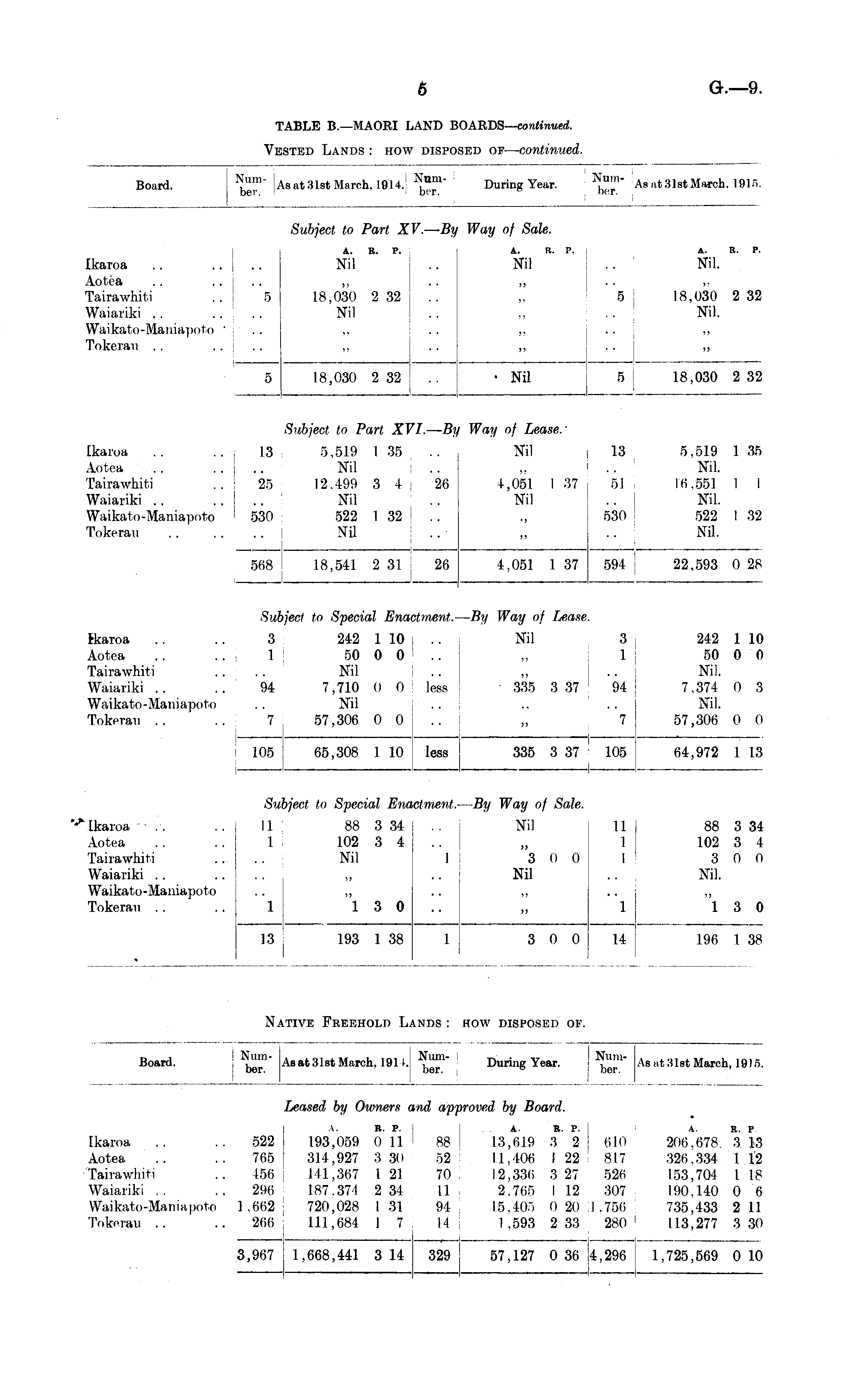 TABLE B.—MAORI LAND BOARDS-continued. Vested Lands: how disposed of-continued.