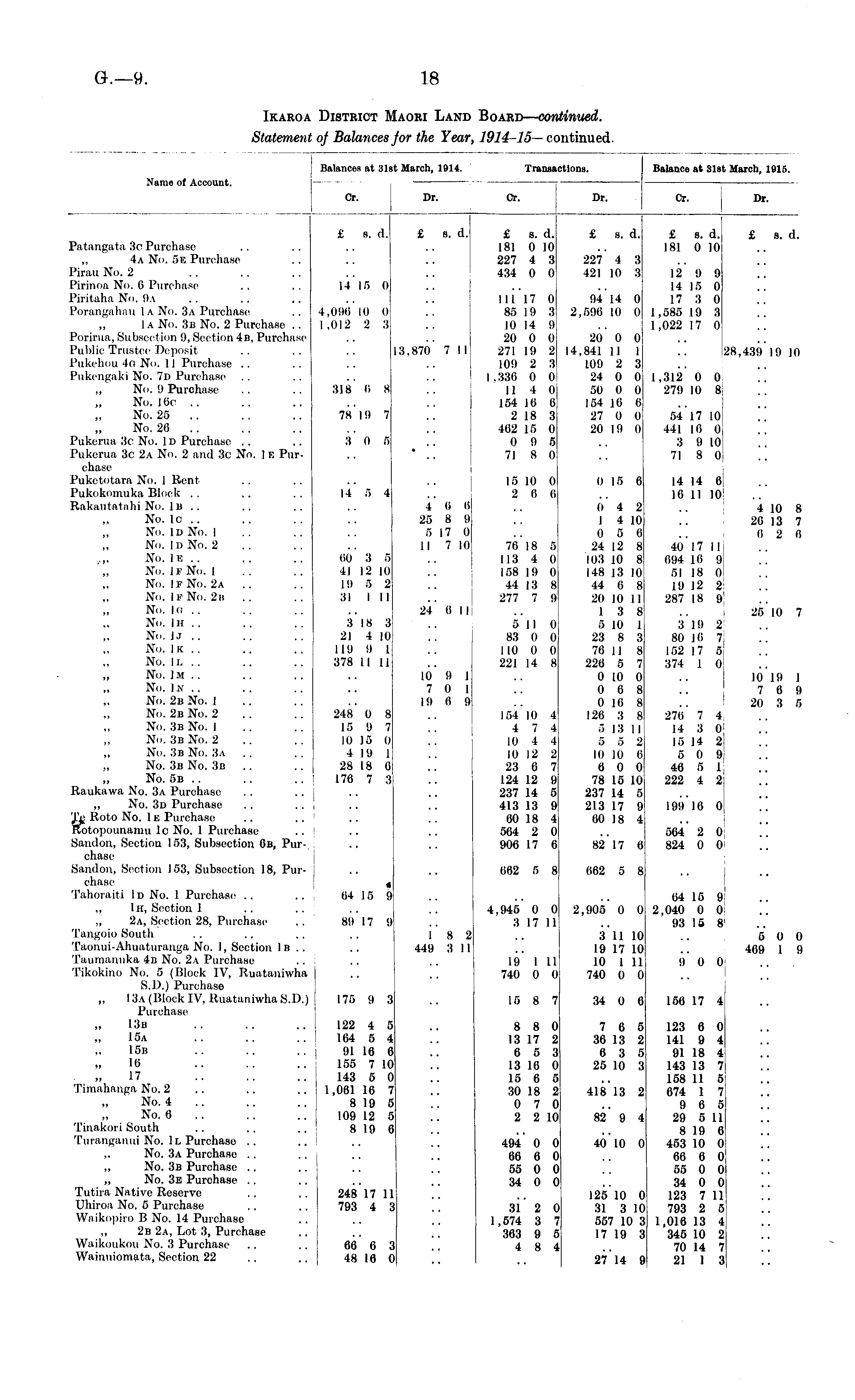 Balances at 31st March, 1914. Name of Account. — Cr. Dr. Transactions. Balance at 31st March, 1915. Dr. Or. Ilr. Cr. Or. £ s. d. £ s. el. £ s. d. £ s. d. 181 0 10 227 4 3 434 0 0 £ s. d. £ s. d. 181 0 10l £ s. d. Patangata 3c Purchase „ 4a No. 5b Purchase Pirau No. 2 Pirinoa Nei. 0 Purchase. .. .. 14 15 0 Piritaha No. 9\ Porangahau 1 a No. 3a Purchase .. 4,090 10 0 „ J a No. 3b No. 2 Purchase .. 1 ,012 2 3 Porirua, Sulise-i-tion 9, Sectiem 4b, Purchase Public Trustee' Deposit .. .. .. 13,870 7 II Pukehou 40 No. 11 Purchase Puki'iigaki No. 7d Purchase No. 9 Purchase .. .. 318 0 8 No. 16c .. No. 25 .. .. .. 78 19 7 No. 26 .. Pukerua 3c No. 1D Purchase .. .. 3 0 5 Pukerua 3c 2a No. 2 and 3c No. 1 E Pur- .. ' .. chase Puketeitara No. 1 Kent Pukokeunuka Block .. ,. .. 14 fi 4 Rakautatahi No. Ib .. .. .. .. 4 0 0 „ No. lc .. .. .. 25 8 9 No. Id No. I .. .. .. 5 17 0 No. Id No. 2 .. .. .. I I 7 10 ,„ No. 1E . . .. .. 00 3 5 No. IP No. 1 . . .. 1112 10 No. If No. 2a .. .. 19 5 2 No. IF No. 2b .. .. 31 I II Nei. lo .. .. .. .. 24 0 I I No. IH .. .. .. 3 18 3 No. U .. .. .. 21 4 10 No. Ik .. .. .. 119 9 1 No. H. .. .. .. 378 II II No. ]M .. .. .. .. 10 9 I No. In.. .. .. .. 701 „ No. 2b No. 1 .. .. .. 19 0 9 No. 2b No. 2 .. .. 248 0 8 No. 3b No. I .. .. 15 9 7 No. 3b No. 2 .. .. 10 15 0 No. 3b No. 3a .. .. 4 19 1 No. 3b No. 3b .. .. 28 18 6 „ No. 5b .. .. .. j 176 7 3 Raukawa No. 3a Purchase .. .. j „ No. 3d Purchaso . . .. I 'Dj Roto No. 1B Purchase .. Kotopounanni lc No. 1 Purchases Sandon, Section 153, Subsection 0b, Purchase Sandon, Sectiem 153, Subsection 18, Pur- j chase' Tahoraiti 1D No. 1 Purchase' .. .. | 04 I fi 9 „ 1h, Section 1 2a, Section 28, Purchase' .. 89 17 9 Tangoio South .. ,. .. .. 18 2 Taonui-Ahuaturanga No. 1, Section IB .. .. 449 3 I I Taumanuka 4n No. 2a Purchase ... Tikokino No. 5 (Block IV, Ruataniwha j S.D.) Purchase „ 1 3a (Block IV, Ruataniwha S.D.) 175 9 3 Purchase 13b .. .. .. 122 4 5 15a .. .. .. 164 5 4 I5n .. .. .. 91 16 6 Hi .. .. .. 155 7 10 17 .. .. .. 143 5 0 Timahanga No. 2 .. .. .. 1,061 16 7 No. 4 .. ., .. 8 19 5 No. 6 .. .. 109 12 5 Tinakori South .. .. .. 8 19 6 Turanganui No. Ir. Purchase .. „ No. 3a Purchaso .. „ No. 3b Purchase .. „ No. 3e Purchase Tutira Native Reserve .. ,. 248 17 11 Uhiroa No. 5 Purchase .. .. 793 4 3 Wnikopiro B No. 14 Purchase 2b 2a, Lot 3, Purchase Waikoukou No. 3 Purchase .. .. 66 6 3 Wainuiomata, Section 22 .. ,. 48 16 0 13,870 7 II 4 0 0 25 8 9 5 17 0 II 7 III 24 0 I I 10 9 1 7 0 1 19 0 9 III 17 0 85 19 3 10 14 9 20 0 0 271 19 2 109 2 3 1.330 0 0 1 11 4 0 154 10 6 2 18 3 462 15 0 0 9 5 71 8 0 15 10 0 2 6 6 76 18 5 113 4 0 158 19 0 44 13 8 277 7 9 5 11 0 83 0 0 110 0 0 221 14 8 154 10 4 4 7 4 10 4 4 10 12 2 23 6 7 124 12 9 237 14 5 413 13 9 60 18 4 504 2 0 900 17 0 227 4 3 421 10 3 94 14 0 2,590 1(1 0 20 0 0 14,841 II I 109 2 3 24 0 0 50 0 0 154 16 6 27 0 0 20 19 0 (I 15 6 0 4 2 1 4 10 0 5 6 24 12 8 103 10 8 148 13 10 44 6 8 20 10 11 1 3 8 5 10 1 23 8 3 76 II 8 226 5 7 0 10 0 0 6 8 0 10 8 126 3 8 5 13 II 5 5 2 10 10 6 0 0 0 78 15 10 237 14 5 213 17 9 00 18 4 12 9 9 14 15 0 17 3 0 1,585 19 3 1,022 17 0 1,312 0 0 279 10 8 54 17 10 441 16 0 3 9 10 71 8 0 14 14 0 10 II 10 1 40 17 II 094 10 9 51 18 0 19 12 2 287 18 9 3 19 2 80 10 7 152 17 5 374 I (I •• 270 7 4 14 3 0 ; Ifi 14 21 5 0 9! 40 5 1 222 4 2 '28,439 19 10 4 10 8 26 13 7 6 2 6 ij 25 10 7 10 19 I 7 6 9 20 3 fi 'i 199 10 0 : i 82 17 0 564 2 0 824 0 0 , I: I, 062 fi 8 662 5 8 I 4,945 0 0 3 17 11 2,905 0 0 64 15 9 2.040 0 0 93 15 8 I I I 1 8 2 449 3 I I 3 11 10 19 17 10 10 1 11 740 0 0 I 5 0 0 409 1 9 19 I 11 740 0 0 9 0 0 I ... 15 8 7 34 0 6 156 17 4 i 8 8 0 13 17 2 6 5 3 13 16 0 15 6 5 30 18 2 0 7 0 2 2 10 494 0 0 66 6 0 55 0 0 34 0 0 7 6 5 36 13 2 6 3 5 25 10 3 41813 2 82 9 4 40 10 0 123 0 0 141 9 4 91 18 4 143 13 7 158 11 5 674 1 7 9 6 5 29 5 11 8 19 6 453 10 0 66 6 0 55 0 0 34 0 0 123 7 11 793 2 5 1,016 13 4 345 10 2 70 14 7 21 1 3 I [ . ' r .. \ i ) ) 31 2 0 1,574 3 7 363 9 5 4 8 4 125 10 0 31 3 10 557 10 3 17 19 3 ) i i ) > 27 14 9 j i