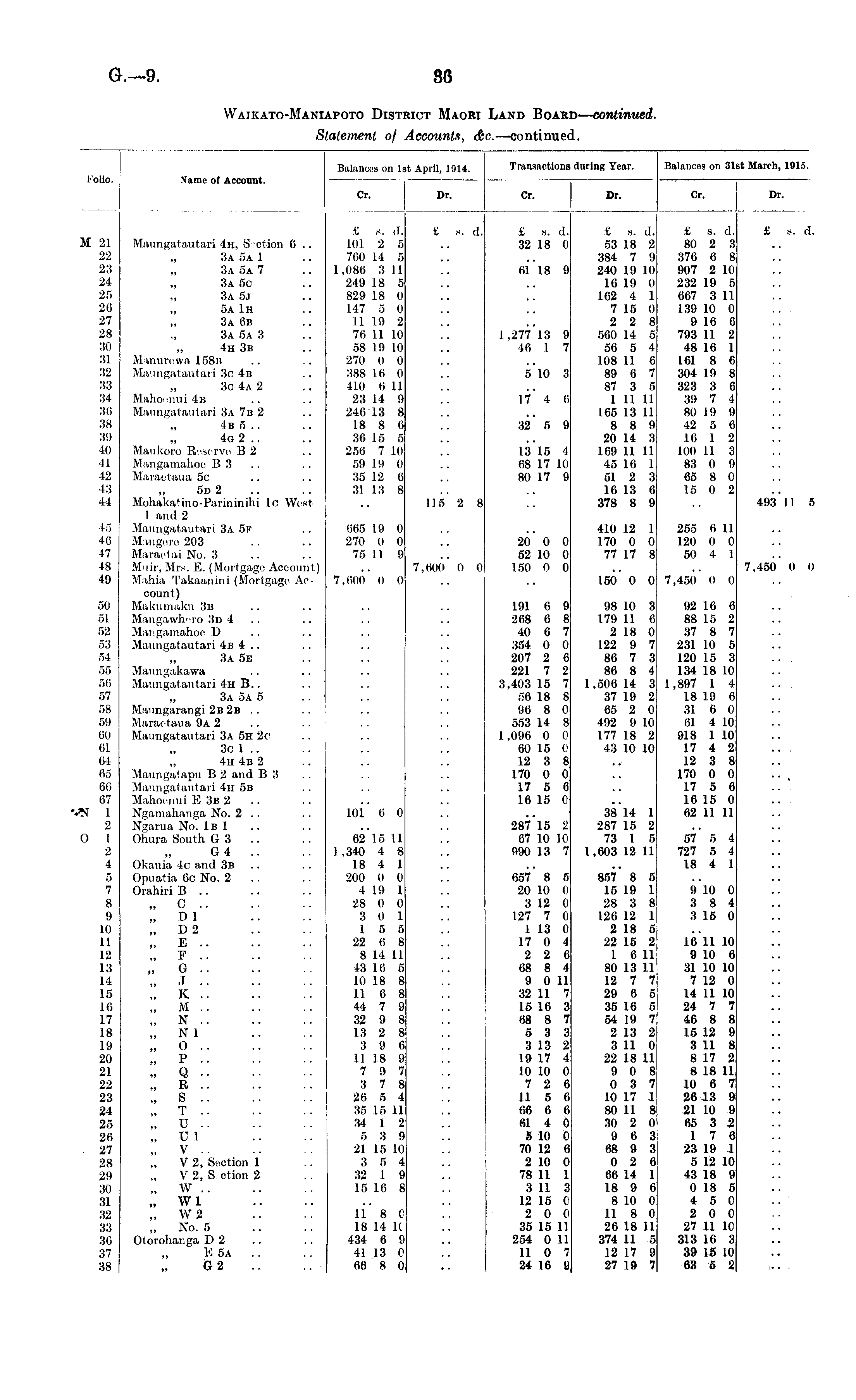 Balances on li it April, 1914. Transactions during Year. Balances on 81lt March, 1915. Kolio. N'ame of Account. Cr. Dr. Cr. Dr. Cr. Dl M 21 22 23 24 25 26 27 28 30 31 32 33 34 30 38 39 40 41 42 43 44 Maungatautari 4h, S ction 8 .. 3a 5a 1 „ 3a 5a 7 „ 3a 5c „ 3a 5j „ 5a 1h 3a 6b „ 3a 5a 3 „ 4h 3b Manurowa 158b Maungatautari 3c 4b 3c 4a 2 Mahoenui 4b Maungatautari 3a 7b 2 4b 5 .. 4o 2 .. Maukoro Reserve B2 Mangamahoe B 3 Maraetaua 5c 5d 2 Mohakatino-Parininihi lc West 1 and 2 Maungatautari 3a 5p M ingere 203 Maraetai No. 3 Muir, Mrs. E. (Mortgage Account) Mahia Takaanini (Mortgage Account) Makumaku 3b Mangawh-i'o 3d 4 Mangamahoe D Maungatautari 4b 4 .. „ 3a 5e Maungakawa Maungatautari 4h B.. „ 3a 5a 5 Maungarangi 2b 2b .. Marae taua 9a 2 Maungatautari 3a 5h 2c 3c 1 .. 4h 4b 2 Maungatapu B 2 and B 3 Maungatautari 4h 5b Mahoi-nui E 3b 2 Ngamahanga No. 2 .. Ngarua No. Ib 1 Ohura South G 3 G4 .. Okauia 4c and 3b Opuatia 6c No. 2 .. Orahiri B .. „ C „ Dl „ D2 „ E „ F .. G .. „ J .. „ K .. „ M .. „ N .. „ N 1 „ O .. „ P .. „ Q R .. „ S .. „ T .. „ U .. „ U 1 „ V .. V 2, Section 1 V2, S ction 2 „ W .. „ Wl „ W2 No. 5 Otorohanga D 2 E 5a .. G2 £ s. d. 101 2 5 760 14 5 1,086 3 11 249 18 5 829 18 0 147 0 0 II 19 2 76 11 10 58 19 10 270 0 0 388 10 0 410 8 11 23 14 9 246 13 8 18 8 6 36 15 5 256 7 10 59 19 0 35 12 6 31 13 8 £ s. d. £ s. el. 32 18 C £ s. d. 53 18 2 384 7 9 240 19 10 16 19 0 162 4 1 7 15 0 2 2 8 560 14 5 56 5 4 108 11 6 89 6 7 87 3 5 1 11 11 165 13 11 8 8 9 20 14 3 169 11 11 45 16 1 51 2 3 16 13 6 378 8 9 £ s. d. 80 2 3 376 6 8 907 2 10 232 19 6 667 3 11 139 10 0 9 16 6 793 11 2 48 16 1 161 8 6 304 19 8 323 3 6 39 7 4 80 19 9 42 5 6 16 1 2 100 11 3 83 0 9 65 8 0 15 0 2 £ s. el. 61 18 9 1,27713 9 46 1 7 .fi'10 3 17' 4 6 32 5 9 13 15 4 08 17 10 80 17 9 115 2 8 493 II 5 45 40 47 48 49 665 19 0 270 0 0 75 II 9 7,600 0 0 20 0 0 52 10 0 150 0 0 410 12 1 170 0 0 77 17 8 255 6 11 120 0 0 50 4 1 7.450 0 0 7,600 0 0 150 0 0 7,450 0 0 50 51 52 53 54 55 50 57 58 59 60 61 64 65 66 67 rN 1 2 0 I 2 4 5 7 8 9 10 11 12 13 14 15 10 17 18 19 20 21 22 23 24 25 26 27 28 29 30 31 32 33 36 37 38 101 0 0 62 15 11 1 ,340 4 8 18 4 1 200 0 0 4 19 1 28 0 0 8 0 1 1 5 5 22 0 8 8 14 11 43 16 5 10 18 8 11 6 8 44 7 9 32 9 8 13 2 8 3 9 6 11 18 9 7 9 7 3 7 8 26 5 4 35 15 11 34 1 2 5 3 9 21 15 10 3 5 4 32 1 9 15 16 8 191 6 9 208 6 8 40 6 7 354 0 0 207 2 6 221 7 2 3,403 15 7 56 18 8 96 8 0 553 14 8 1,096 0 0 60 15 0 12 3 8 170 0 0 17 5 6 16 15 0 287 15 2 67 10 10 990 13 7 657 8 5 20 10 0 3 12 C 127 7 C 1 13 0 17 0 4 2 2 6 68 8 4 9 0 11 32 11 7 15 16 3 08 8 7 5 3 3 3 13 2 19 17 4 10 10 0 7 2 6 11 5 6 66 6 6 61 4 0 5 10 0 70 12 6 2 10 0 78 11 1 3 11 3 12 15 C 2 0C 35 15 11 254 0 11 11 0 7 24 16 9 98 10 3 179 11 6 2 18 0 122 9 7 86 7 3 86 8 4 1,506 14 3 37 19 2 65 2 0 492 9 10 177 18 2 43 10 10 38 14 1 287 15 2 73 1 5 1,603 12 11 857 8 5 15 19 1 28 3 8 126 12 1 2 18 5 22 15 2 1 6 11 80 13 11 12 7 7 29 6 5 35 16 5 54 19 7 2 13 2 3 11 0 22 18 11 9 0 8 0 3 7 10 17 1 80 11 8 30 2 0 9 6 3 68 9 3 0 2 6 66 14 1 18 9 6 8 10 0 11 8 0 26 18 11 374 11 5 12 17 9 27 19 7 92 16 6 88 15 2 37 8 7 231 10 5 120 15 3 134 18 10 1,897 1 4 18 19 6 31 6 0 61 4 10 918 1 10 17 4 2 12 3 8 170 0 0 17 5 6 16 15 0 02 11 11 57 5 4 727 5 4 18 4 1 9 10 0 3 8 4 3 15 0 16 11 10 9 10 6 31 10 10 7 12 0 14 11 10 24 7 7 46 8 8 15 12 9 3 11 8 8 17 2 8 18 11 10 6 7 26 13 9 21 10 9 65 3 2 1 7 6 23 19 .1 5 12 10 43 18 9 0 18 5 4 5 0 2 0 0 27 11 10 313 16 3 39 15 10 63 5 2 11 8 C 18 14 1( 434 6 9 41 13 0 66 8 0