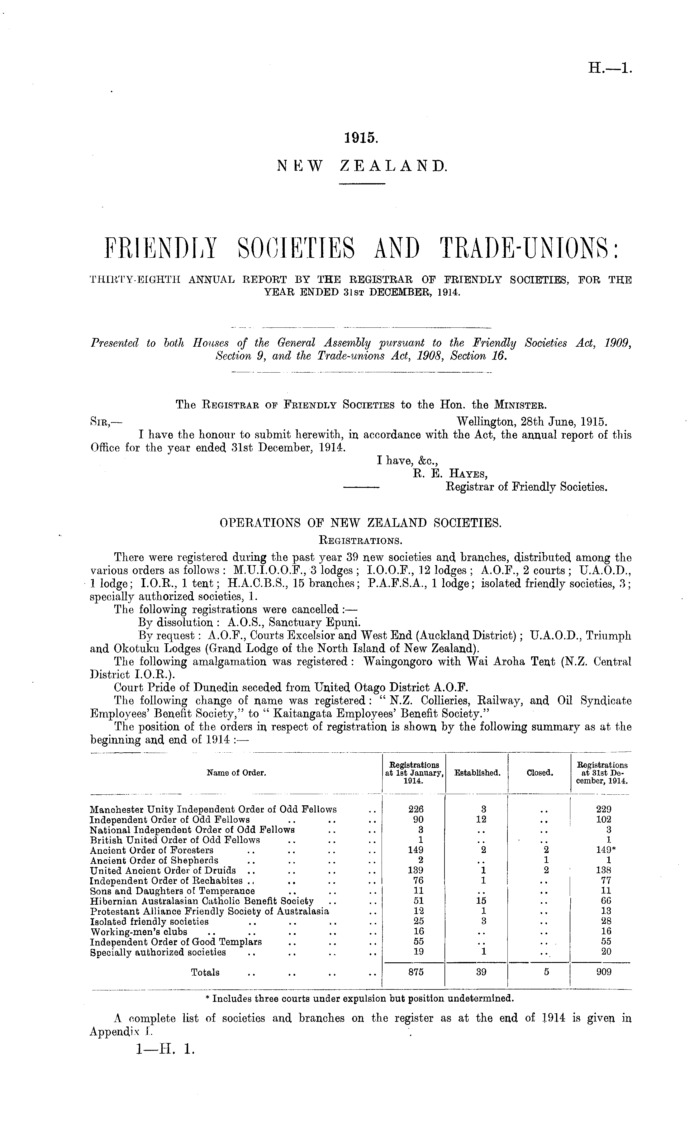 The Registrar of Friendly Societies to the Hon. the Minister. Sir— Wellington, 28th June, 1915. I have the honour to submit herewith, in accordance with the Act, the annual report of tins Office for the year ended 31st December, 1914. I have, &0., R. B. Hayes, Registrar of Friendly Societies.
