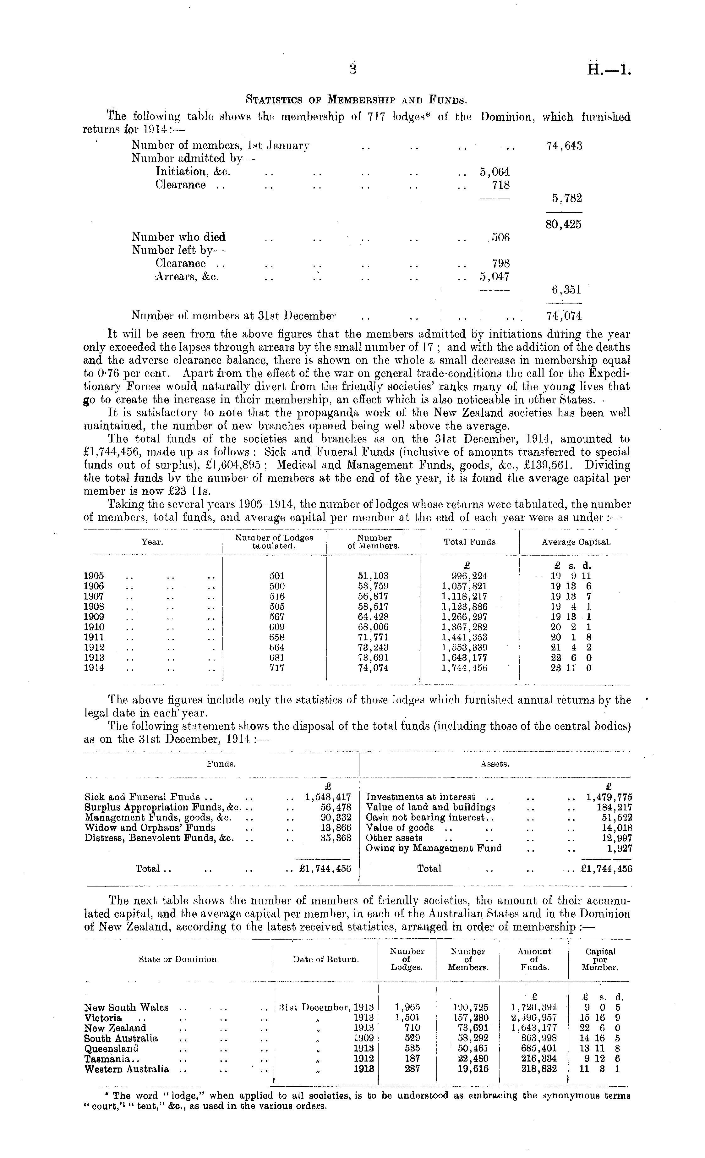 Statistics of Membership and Funds. The following table shows the. membership of 717 lodges* of the Dominion, which furnished returns for 1914: — Number of members, Ist January .. .. .. .. 74,643 Number admitted by— Initiation, &c. .. .. .. .. .. 5,064 Clearance .. .. .. .. .. .. 718 5,782 80,425 Number who died . . .. .. .. ... 500 Number left by— Clearance .. .. .. .. .. .. 798 •Arrears, &c. .. .". .. .. .. 5,047 6,351 Number of members at 31st December .. .. .. .. 74,074 It will be seen from the above figures that the members admitted by initiations during the year only exceeded the lapses through arrears by the small number of 17 ; and with the addition of the deaths and the adverse clearance balance, there is shown on the whole a small decrease in membership equal to 0'76 per cent. Apart from the effect of the war on general, trade-conditions the call for the Expeditionary Forces would naturally divert from the friendly societies' ranks many of the young lives that go to create the increase in their membership, an effect which is also noticeable in other States. It is satisfactory to note that the propaganda work of the New Zealand societies has been well maintained, the number of new branches opened being well above the average. The total funds of the societies and branches as on the 31st December, 1914, amounted to £1,744,456, made up as follows : Sick and Funeral Funds (inclusive of amounts transferred to special funds out of surplus), £1,604,895 : Medical and Management Funds, goods, &c, £139,561. Dividing the total funds by the number of members at the end of the year, it is found the average capital per member is now £23 lis. Taking the several years 1905-1914, the number of lodges whose returns were tabulated, the number of members, total funds, and average capital, per member at the end of each year were as under :