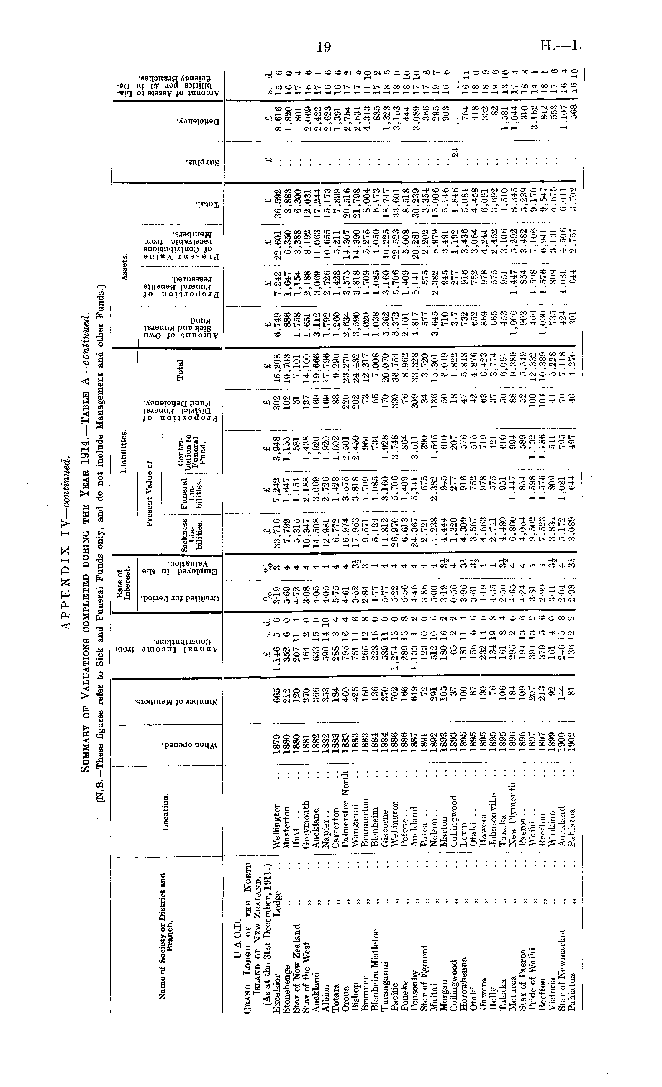 ese :res rel :er iiol am neral 'un< only, am ,o not inol Management am oti er 'unds.] 1 o Rate of Interest. Liabilities. Assets. eg » 0 a • 43— - tn 01 pi oi to a i2 y. S p, aa a. a fl 3s p{ Op o 8-* < Name of Society or District and Branch. Location. •a a to o a pe m 01 © to a! ..pi r. P^ - a a o oo © o © 5 © '" a ci -g o a Sickness Funeral 0 g|g J_ia- J_ia- lTm>iii_iii1 - bilities. bilities. F F u^ al J._§ a. Present Value of ° U cl CO Q eg op _"0 S a a &■ O cl g < ** CD CD CO |H •H tm *0 - _ rH (_ .♦3_ © -**£o _ oag : <d„§^ OR OR o SR Cl a 01 cB 01 Q Total. tc S a, s m U.A.O.D. Grand Lodge of the North Islam) of New Zealand. (As at the 31st December, 1911.) Excelsior Lodge .. Wellington Stonehenge „ .. Masterton Star of New Zealand „ .. Hutt Star of the West „ .. Greymouth Auckland ,, .. Auckland Albion „ .. Napier.. Totara „ .. Carterton Oroua „ .. Palmerston North Bishop „ .. Wanganui Brunner ,, .. Brunnerton Blenheim Mistletoe „ .. Blenheim Turanganni „ .. Gisborne Pacific „ .. Wellington Poneke ,, .. Petone.. Ponsonby „ .. Auckland Star of Egmont „ .. Patea Maitai „ .. Nelson Morgan „ .. Marton Collingwood „ .. Collingwood Horowhenua „ .. Levin Otaki „ .. Otaki .. Ha wera „ .. Ha wera Holly „ .. Johnsonville Takaka „ .. Takaka Moturoa „ .. New Plymouth .. Star of Paeroa ,, .. Paeroa Pride of Waihi „ .. Waihi Reefton „ .. Reefton Victoria ,, .. Waikino Star of Newmarket ,, .. Auckland Pahiatua „ .. Pahiatua 1879 1880 1880 1881 1882 1882 1883 1883 1883 1883 1884 1884 1886 1886 1887 1891 1892 1893 1893 1895 1895 1895 1895 1895 1896 1896 1897 1897 1899 1900 1902 665 212 120 270 366 353 184 460 425 160 136 370 702 166 649 72 291 105 37 100 87 130 76 106 184 109 207 213 92 144 81 £ s. d. 1,146 5 6 352 6 0 207 11 4 464 2 0 633 15 0 590 14 10 288 3 4 795 16 4 751 14 6 265 12 8 228 16 0 589 11 0 1,274 13 0 289 13 8 1,133 1 2 123 10 0 512 10 6 180 16 2 65 2 2 181 11 4 156 6 6 232 14 0 134 19 8 161 8 4 295 2 0 194 13 6 394 13 2 379 5 6 161 4 0 246 15 8 136 12 2 O/ O' /o /o 319 3 5-69 4 4-72 4 3-08 ' 4 4-05 4 4-05 j 4 5-75 ! 4 4-61 4 3-52 3* 2-84 3 4-77 , 4 5-77 | 4 5-22 i 4 5-56 ! 4 4-46 4 3-86 4 5-00 4 319 3£ 0-56 4 3-96 3i 3-61 3§ 4-19 4 4-35 4 2-50 3J 4-65 4 4-24 4 3-81 4 2-99 4 3-41 3£ 2-04 4 2-98 I 3J £ £ 33.716 7,242 7,799 ; 1,647 5.315 ' 1,154 10,347 I 2,188 14,508 3.069 12.981 2.726 6,772 1,428 16.974 3,575 17.953 3,818 9,571 1,709 5,124 ( 1,085 14.812 i 3,160 26.970 I 5,706 6,613 '■ 1,409 24,367 ! 5,141 2.721 575 11,238 I 2,382 4.444 i 945 1,320 277 4,309 916 3,567 752 4,663 978 2.741 575 4.480 i 951 6.860 ! 1.447 4.054 j 854 9,502 I 1.598 7.523 : 1.576 3.834 ! 809 5.172 1,081 3.089 644 £ 3,948 1,155 581 1.438 1,920 1.920 1.002 2.501 2.459 964 734 1,928 3,748 864 3,511 390 1,545 610 207 576 515 719 421 610 994 589 1,132 1.186 541 795 497 £ £ 302 45.208 102 10,703 51 7,101 127 14,100 169 19,666 169 17,796 88 9,290 220 23.270 202 24.432 73 12.317 65 7,008 170 20.070 330 36,754 76 8,962 309 33,328 34 3.720 136 15,301 50 6.049 18 1.822 47 5,848 42 4,876 63 6,423 37 3,774 50 6.091 88 9.389 52 5,549 100 12.332 104 10.389 44 5,228 70 7.118 40 4,270 £ 6.749 886 1.758 1,651 3,112 1,792 1,260 2,634 3,590 1.020 1.038 5,362 5,372 2.101 4,817 577 3,645 710 3.7 732 652 869 665 453 1,606 903 466 1,030 735 424 301 £ £ 7,242 i 22.601 1,647 6.350 1,154 3,388 2,188 8,192 3,069 11.063 2,726 i 10.655 1,428 5,211 3.575 14,307 3,818 14,390 1,709 5,275 1,085 4,050 3,160 10,225 5,706 22,523 1,409 5.008 5,141 20,281 575 2,202 2,382 8,979 945 3,491 277 1,192 916 3,436 752 3,054 978 4,244 575 2,452 951 3,106 1,447 5,292 854 3,482 1.598 7,106 1.576 6,941 809 3.131 1,081 4,506 644 ' 2,757 £ 36.592 8,883 6,300 12,031 17,244 15,173 7,899 20,516 21,798 8,004 6,173 18,747 33,601 8,518 30,239 3,354 15,006 5,146 1,846 5.084 4,458 6,091 3,692 4,510 8,345 5,239 I 9,170 9,547 4.675 6,011 ; 3.702 £ £ 8,616 1.820 801 2,069 2,422 2.623 1,391 2,754 2.634 4,313 835 1.323 3,153 444 3,089 366 295 903 s. d. 15 6 16 0 17 4 16 6 17 1 16 6 16 6 17 2 17 5 11 10 17 2 18 5 18 0 18 10 17 10 17 8 19 7 16 6 24 764 418 332 82 1,581 1,044 310 3.162 842 553 1.107 568 16 11 18 0 18 9 19 6 13 10 17 4 18 8 14 1 18 1 17 6 16 4 16 10