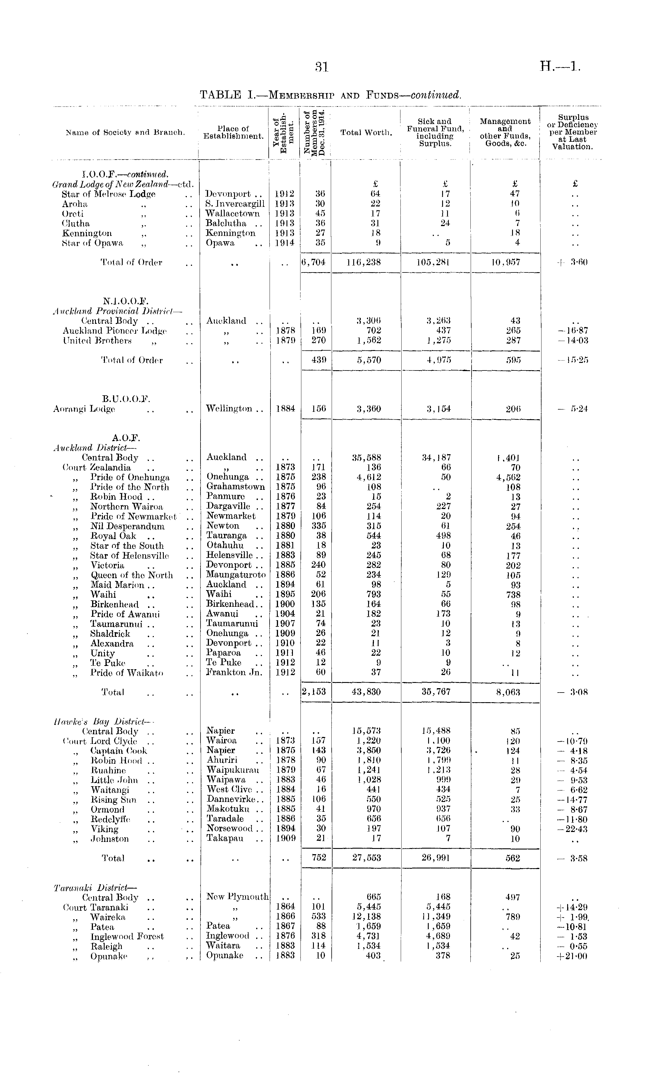 Name of Society and Branch, Place of Establishment. *,r=l o w -^ Hr\ ° H <*H fl -rji O OrH 7-rQcO gad g Q3 Q3 Total Worth. Sick and Funeral Fund, including Surplus. I Management ov g^ noy other Funds, [ ' ,e L IV f e n " 1 1 t ber Goods, fto. valuation. J I.O.O.F. — continued. Grand Lodge of New Zealan d —ctd. Star of Melrose Lodge Aroha ,, Oreti Clutha ,, Kennington „ Star of Opawa ,, Devonport .. S. Invercargill Wallacetown Balclutha .. Kennington Opawa 1.912 1913 1913 1913 1913 1914 36 30 45 36 27 35 36 30 45 36 27 35 £ 64 22 17 31 18 9 £ 17 12 I I 24 5 £ £ 47 10 6 7 18 4 Total of Order 6,704 6,704 116,238 116,238 105,281 105,281 10,957 + 3-60 10.957 N.I.O.O.F. Auckland Provincial District — Central Body Auckland Pioneer Lodge United Brothers „ Auckland .. 109 270 3.306 702 1,562 3.263 437 1,275 43 265 - 16-87 287 -14-03 1878 1879 169 270 3.306 702 1,562 3.263 437 1,275 43 265 287 Total of Order 439 439 5,570 5,570 4,975 4,975 595 - 15-25 595 B.U.O.O.F. Aorangi Lodge Wellington .. 156 3,360 3,154 200 - 5-24 206 1884 156 3,360 3,154 A.O.F. .1 uckland District — Central Body Court Zealandia „ Pride of Onehunga „ Pride of the North „ Robin Hood .. ,, Northern Wairoa „ Pride of Newmarket .. „ Nil Dcsporandum „ Royal Oak .. „ Star of the South „ Star of Hclensville „ Victoria „ Queen of the North „ Maid Marion .. „ Waihi „ Birkenhead .. ,, Pride of Awanui „ Taumarunui „ Shaldrick „ Alexandra „ Unity „ TePuke ,, Prido of Waikato Auckland .. Onehunga .. Grahamstown Panmure Dargaville .. Newmarket Newton Tauranga .. Otahuhu Hclensville .. Devonport .. Maungaturoto Auckland .. Waihi Birkenhead.. Awanui Taumarunui Onehunga .. Devonport ., Paparoa Te Puke .. Frankton .In. 1873 1875 1875 1876 1877 1879 1880 .1880 .1881 1883 .1885 .1886 1894 1895 1900 1904 1907 1909 1910 1911 1912 1912 171 238 84 335 171 238 96 23 84 106 335 38 18 89 240 52 61 206 135 21 74 26 22 46 12 60 35,588 136 4,612 .108 15 254 114 315 544 23 245 282 234 98 793 164 182 23 21 II 22 9 37 35,588 136 4,612 108 .1.5 ok_ 254 I 1 A 114 315 KA A 544 OO 34,187 66 50 O 227 on 20 01 10 34,187 66 50 2 227 20 01 498 10 08 80 129 5 55 66 173 10 12 3 10 9 26 1,401 70 4,562 108 13 27 94 254 .. 46 13 177 1,401 70 4,562 108 13 27 94 254 46 13 177 202 105 93 738 98 9 13 9 8 12 202 52 til 234 no 129 105 61 on A 5 r.r. 93 206 1 OK 793 55 (Hi 738 135 o I 98 9 ... 23 Ol 13 12 •i 9 8 i n 12 12 An 9 on II 26 II Total |2,153 2,153 43,830 43,830 35,767 35,767 8.063 - 3-08 8.063 Hawke's Bay District- — Central Body Court Lord Clyde .. ,, Captain Cook ,, Robin Hood .. ,, Ruahine „ Little John „ Waitangi „ Rising Sun „ Ormond „ Redclyffe „ Viking „ Johnston Napier Wairoa Napier Ahuriri Waipukurau Waipawa .. West Clive .. Dannevirke.. Makotuku . . Taradale Norscwood .. Takapau 1873 1875 1878 1879 1883 1884 1885 1885 1886 1894 1909 157 143 90 67 46 16 106 41 35 30 01 157 143 90 67 46 16 106 41 35 30 2] 15,573 1,220 3,850 1,810 1,241 1,028 441 550 970 656 197 i n 15,573 1,220 3,850 1,810 1,241 1,028 441 550 970 656 197 17 15,488 1.100 3,726 I ,799 1,213 999 434 525 937 656 107 -7 15,488 1,100 3,726 I ,799 1,213 999 434 525 937 656 107 7 85 120 -10-79 124 - 4-18 I 1 - 8-35 28 - 4-54 29 - 9-53 7 - 6-62 25 -14-77 33 - 8-67 -11-80 90 -22-43 85 120 124 II 28 29 7 25 33 90 10 7 10 Total 752 752 27,553 27,553 26,991 26,991 562 - 3-58 562 Taranaki District —■ Central Body Court Taranaki „ Waireka „ Patea „ Inglewood Forest „ Raleigh ,, Opunake ,, ,. Now Plymouth Patea Inglewood . . Waitara Opunake 1864 1866 1867 1876 1883 1883 101 533 88 318 114 10 101 533 88 318 114 10 665 5,445 12,138 I ,659 4,731 1.534 403 665 5,445 12,138 I ,659 4,731 1.534 403 168 5,445 11,349 I , 659 4,689 1,534 378 168 5,445 11,349 I ,659 4,689 1,534 378 497 -1-14-29 789 -|- 1-99. -10-81 42 - 1-53 - 0-55 25 +21-00 497 789 42 '' 25