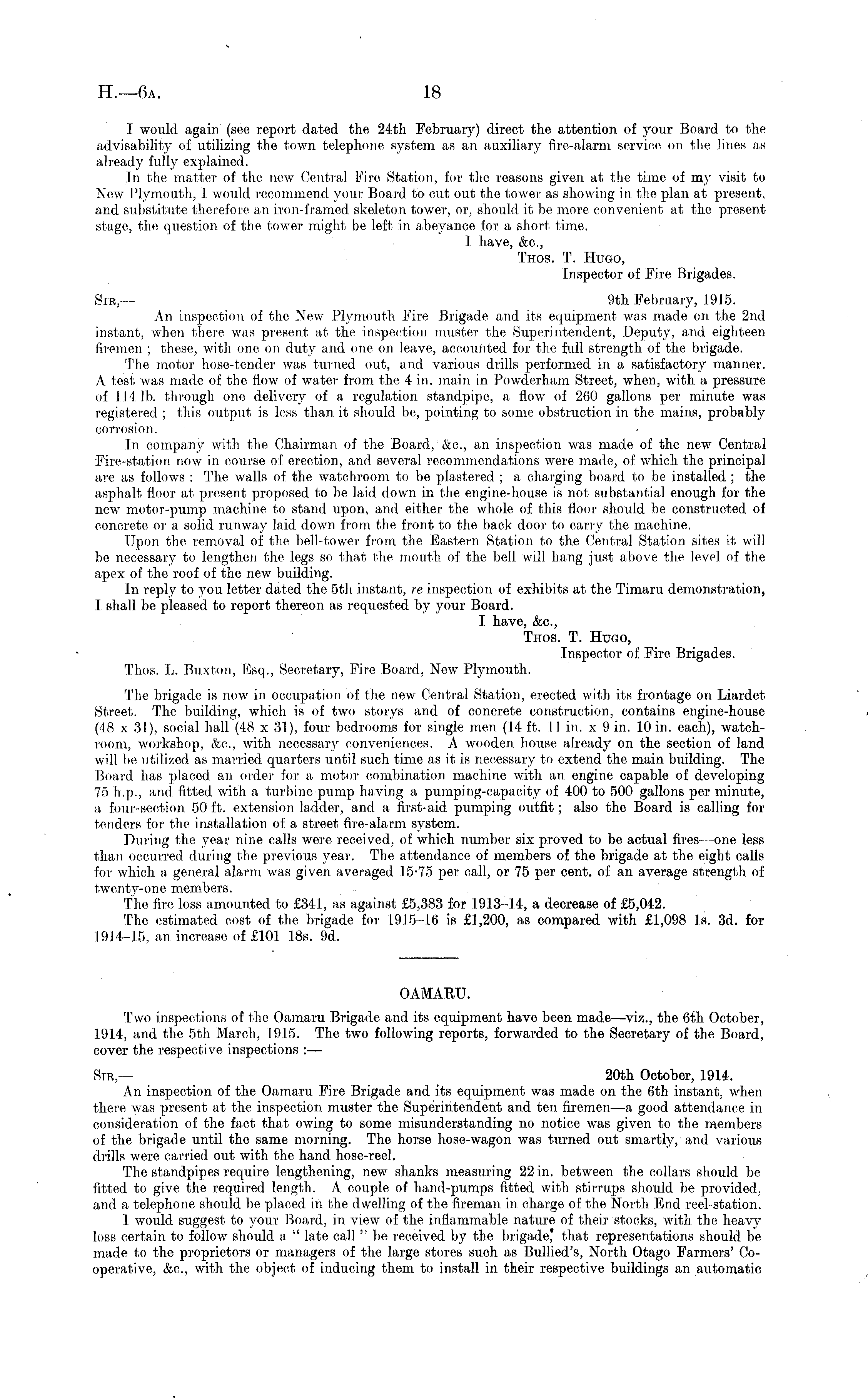 I would again (see report dated the 24th February) direct the attention of your Board to the advisability of utilizing the town telephone system as an auxiliary fire-alarm service, on the lines as already fully explained. In the matter of the new Central Fire Station, for the reasons given at the time of my visit to New Plymouth, I would recommend your Board to cut out the tower as showing in the plan at present,, and substitute therefore an iron-framed skeleton tower, or, should it be more convenient at the present stage, the question of the tower might be left in abeyance for a short time. I have, &c, Thos. T. Hugo, Inspector of Fire Brigades. Sir,— 9th February, 19.15. An inspection of the New Plymouth Fire Brigade and its equipment was made on the 2nd instant, when there was present at the inspection muster the Superintendent, Deputy, and eighteen firemen ; these, with one on duty and one on leave, accounted for the full strength of the brigade. The motor hose-tender was turned out, and various drills performed in a satisfactory manner. A test was made of the flow of water from the 4 in. main in Powderham Street, when, with a pressure of 114 lb. through one delivery of a regulation standpipe, a flow of 260 gallons per minute was registered ; this output is less than it should be, pointing to some obstruction in the mains, probably corrosion. In company with the Chairman of the Board, &c, an inspection was made of the new Central Fire-station now in course of erection, and several recommendations were made, of which the principal are as follows : The walls of the watchroom to be plastered ; a charging board to be installed ; the asphalt floor at present proposed to be laid down in the engine-house is not substantial enough for the new motor-pump machine to stand upon, and either the whole of this floor should be constructed of concrete or a solid runway laid down from the front to the back door to carry the machine. Upon the removal of the bell-tower from the Eastern Station to the Central Station sites it will be necessary to lengthen the legs so that the, mouth of the bell will hang just above the level of the apex of the roof of the new building. In reply to you letter dated the sth instant, re inspection of exhibits at the Timaru demonstration, I shall be pleased to report thereon as requested by your Board. I have, &c, Thos. T. Hugo, Inspector of Fire Brigades. Thos. L. Buxton, Esq., Secretary, Fire Board, New Plymouth. The brigade is now in occupation of the new Central Station, erected with its frontage on Liardet Street. The building, which is of two storys and of concrete construction, contains engine-house (48 x 3.1), social hall (48 x 31), four bedrooms for single men (14 ft. 11 in. x 9 in. 10 in. each), watchroom, workshop, &c, with necessary conveniences. A wooden house already on the section of land will be utilized as married, quarters until such time as it is necessary to extend the main building. The Board has placed an order for a motor combination machine with an engine capable of developing 75 h.p., and fitted with a turbine, pump having a pumping-capacity of 400 to 500 gallons per minute, a four-section 50 ft. extension ladder, and a first-aid pumping outfit; also the Board is calling for tenders for the, installation of a street fire-alarm system. During the year nine calls were received, of which number six proved to be actual fires--one less than occurred during the previous year. The attendance, of members of the brigade at the eight calls for which a general alarm was given averaged 15-75 per call, or 75 per cent, of an average strength of twenty-one members. The fire loss amounted to £341, as against £5,383 for 1913-14, a decrease of £5,042. The estimated cost, of the brigade for 1915-16 is £1,200, as compared with £1,098 Is. 3d. for 1914-15, an increase of £101 18s. 9d. OAMARU. Two inspections of the Oamaru Brigade and its equipment have been made—viz., the 6th October, 1914, and the sth March, 19.15. The two following reports, forwarded to the Secretary of the Board, cover the respective inspections :— Sir,— 20th October, 1914. An inspection of the Oamaru Fire Brigade and its equipment was made on the 6th instant, when there was present at the inspection muster the Superintendent and ten firemen—a good attendance in consideration of the fact that owing to some misunderstanding no notice was given to the members of the brigade until the same morning. The horse hose-wagon was turned out smartly, and various drills were carried out with the hand hose-reel. The standpipes require lengthening, new shanks measuring 22 in. between the collars should be fitted to give the required length. A. couple of hand-pumps fitted with stirrups should be provided, and a telephone should be placed in the dwelling of the fireman in charge of the North End reel-station. I would suggest to your Board, in view of the inflammable nature of their stocks, with, the heavy loss certain to follow should a " late call " be received by the brigade" that representations should be made to the proprietors or managers of the large stores such as Bullied's, North Otago Farmers' Cooperative, &c, with the object, of inducing them to install in their respective buildings an automatic