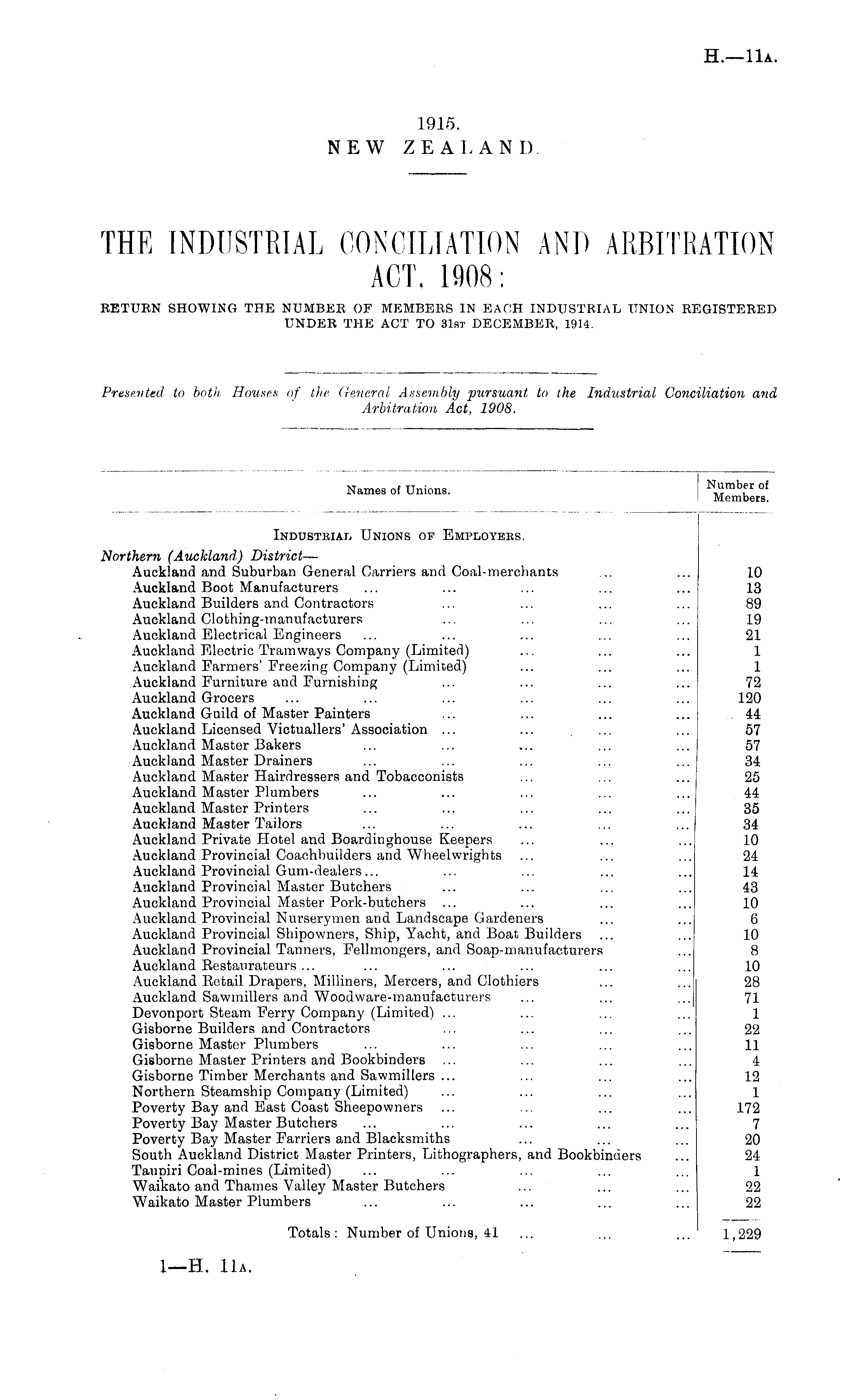 THE INDUSTRIAL CONCILIATION AND ARBITRATION ACT. 1908: RETURN SHOWING THE NUMBER OF MEMBERS IN EACH INDUSTRIAL UNION REGISTERED UNDER THE ACT TO 31st DECEMBER, 1914.