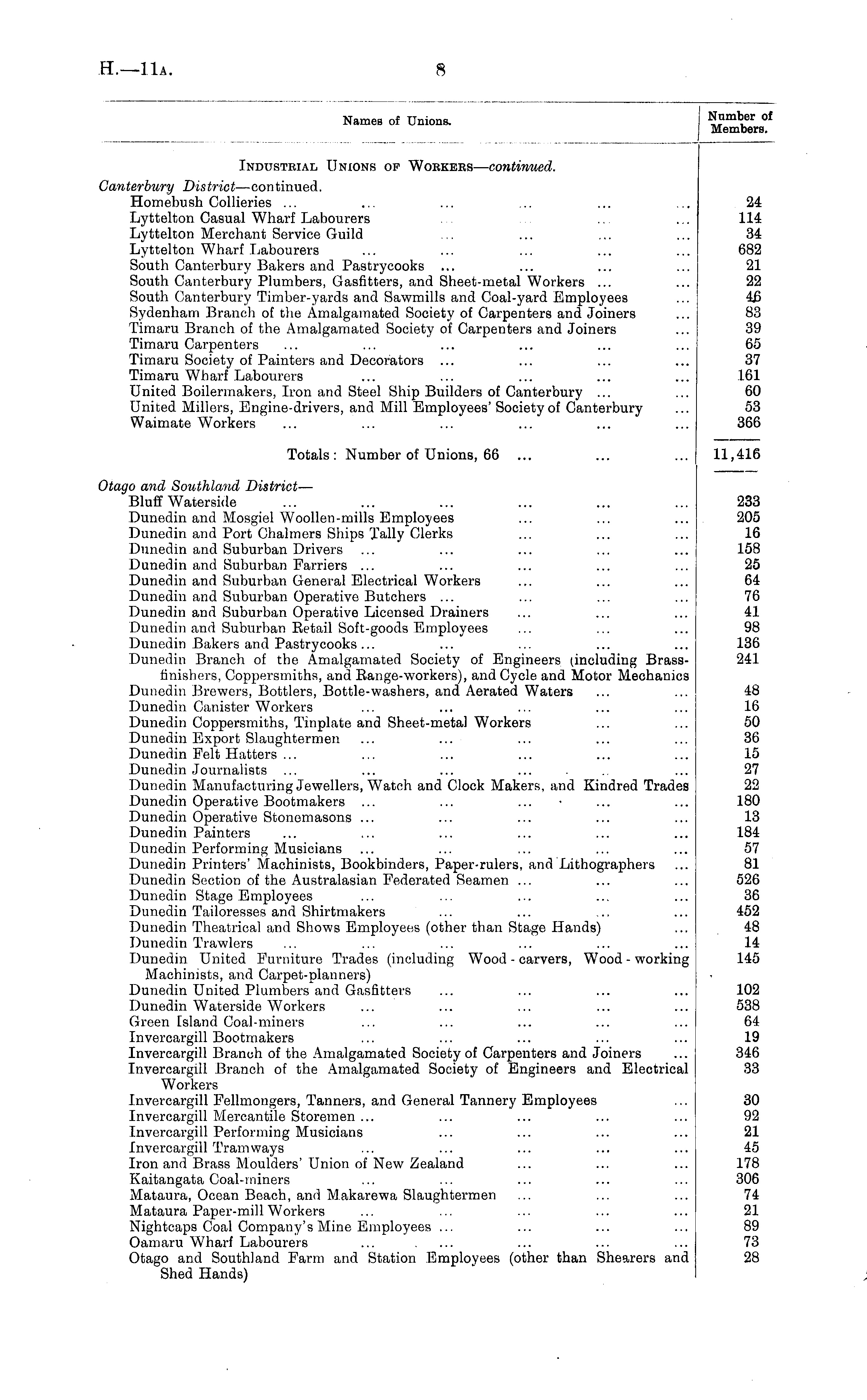 Names of Unions. Number oi Members. Industrial Unions of Workers— continued. Canterbury District —continued. Homebush Collieries ... Lyttelton Casual Wharf Labourers Lyttelton Merchant Service Guild Lyttelton Wharf Labourers South Canterbury Bakers and Pastrycooks ... South Canterbury Plumbers, Gasfitters, and Sheet-metal Workers ... South Canterbury Timber-yards and Sawmills and Coal-yard Employees Sydenham Branch of the Amalgamated Society of Carpenters and Joiners Timaru Branch of the Amalgamated Society of Carpenters and Joiners Timaru Carpenters Timaru Society of Painters and Decorators ... Timaru Wharf Labourers United Boilermakers, Iron and Steel Ship Builders of Canterbury ... United Millers, Engine-drivers, and Mill Employees' Society of Canterbury Waimate Workers 24 114 34 682 21 22 4J3 83 39 65 37 161 60 53 366 Totals: Number of Unions, 66 11,416 Itago and Southland District — Bluff Waterside Dunedin and Mosgiel Woollen-mills Employees Dunedin and Port Chalmers Ships Tally Clerks Dunedin and Suburban Drivers Dunedin and Suburban Farriers ... Dunedin and Suburban General Electrical Workers Dunedin and Suburban Operative Butchers ... Dunedin and Suburban Operative Licensed Drainers Dunedin and Suburban Retail Soft-goods Employees Dunedin Bakers and Pastrycooks ... Dunedin Branch of the Amalgamated Society of Engineers (including Brassfinishers, Coppersmiths, and Range-workers), and Cycle and Motor Mechanics Dunedin Brewers, Bottlers, Bottle-washers, and Aerated Waters Dunedin Canister Workers Dunedin Coppersmiths, Tinplate and Sheet-metal Workers Dunedin Export Slaughtermen Dunedin Felt Hatters ... Dunedin Journalists Dunedin Manufacturing Jewellers, Watch and Clock Makers, and Kindred Trades Dunedin Operative Bootmakers ... Dunedin Operative Stonemasons ... Dunedin Painters Dunedin Performing Musicians Dunedin Printers' Machinists, Bookbinders, Paper-rulers, and Lithographers Dunedin Section of the Australasian Federated Seamen ... Dunedin Stage Employees Dunedin Tailoresses and Shirtmakers Dunedin Theatrical and Shows Employees (other than Stage Hands) Dunedin Trawlers Dunedin United Furniture Trades (including Wood - carvers, Wood - working Machinists, and Carpet-planners) Dunedin United Plumbers and Gasfitters Dunedin Waterside Workers Green Island Coal-miners Invercargill Bootmakers Invercargill Branch of the Amalgamated Society of Carpenters and Joiners Invercargill Branch of the Amalgamated Society of Engineers and Electrical Workers Invercargill Fellmongers, Tanners, and General Tannery Employees Invercargill Mercantile Storemen ... Invercargill Performing Musicians Invercargill Tramways Iron and Brass Moulders' Union of New Zealand Kaitangata Coal-ininers Mataura, Ocean Beach, and Makarewa Slaughtermen Mataura Paper-mill Workers Nightcaps Coal Company's Mine Employees ... Oamaru Wharf Labourers ... .... Otago and Southland Farm and Station Employees (other than Shearers and Shed Hands) 233 205 16 158 25 64 76 41 98 136 241 48 16 50 36 15 27 22 180 13 184 57 81 526 36 452 48 14 145 102 538 64 19 346 33 30 92 21 45 178 306 74 21 89 73 28