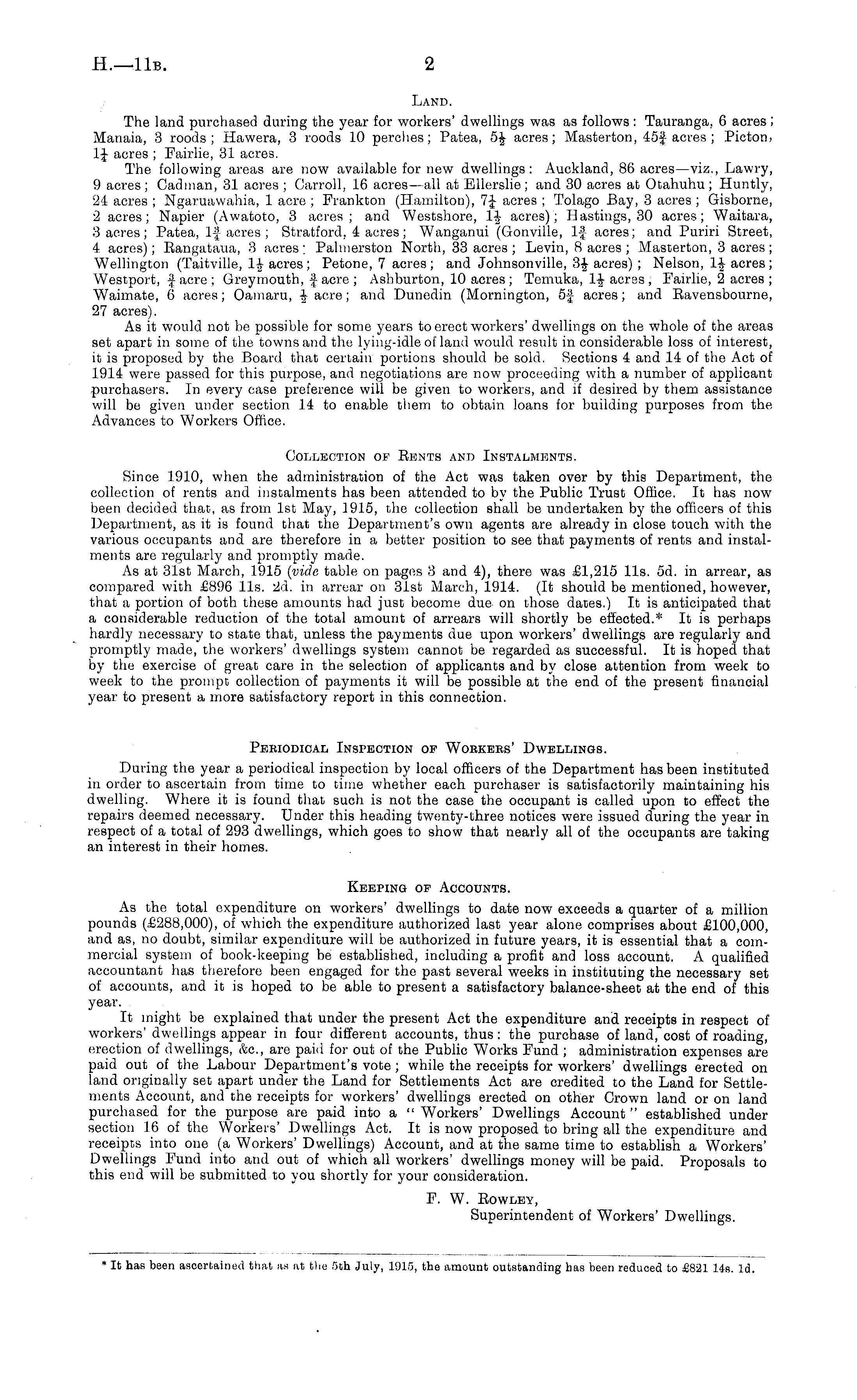 Land. The land purchased during the year for workers' dwellings was as follows : Tauranga, 6 acres ', Manaia, 3 roods; Hawera, 3 roods 10 perches; Patea, 5£ acres; Masterton, 45f acres ; Picton, 1J acres ; Fairlie, 31 acres. The following areas are now available for new dwellings: Auckland, 86 acres—viz., Lawry, 9 acres ; Cadman, 31 acres ; Carroll, 16 acres—all at Ellerslie ; and 30 acres at Otahuhu ; Huntly, 24 acres ; Ngaruawahia, 1 acre ; Frankton (Hamilton), 1\ acres ; Tolago Bay, 3 acres ; Gisborne, 2 acres; Napier (Awatoto, 3 acres; and Westshore, \\ acres); Hastings, 30 acres; Waitara, 3 acres; Patea, If acres ; Stratford. 4 acres; Wanganui (Gonville, If acres; and Puriri Street, 4 acres); Rangataua, 3 acres; Palmerston North, 33 acres ; Levin, 8 acres ; Masterton, 3 acres ; Wellington (Taitville, 1\ acres; Petone, 7 acres; and Johnsonville, 3-|- acres) ; Nelson, 1-J acres; Westport, f acre ; Greymouth, f acre ; Ashburton, 10 acres ; Tomuka, 1-J acres , Fairlie, 2 acres ; Waimate, 6 acres; Oamaru, \ acre; and Dunedin (Mornington, 5f acres; and Ravensbotirne, 27 acres). As it would not be possible for some years to erect workers' dwellings on the whole of the areas set apart in some of the towns and the lying-idle of land would result in considerable loss of interest, it is proposed by the Board that certain portions should be sold. Sections 4 and 14 of the Act of 19.14 were passed for this purpose, and negotiations are now proceeding with a number of applicant purchasers. In every case preference will be given to workers, and if desired by them assistance will be given under section 14 to enable them to obtain loans for building purposes from the Advances to Workers Office. Collection of Rents and Instalments. Since 1910, when the administration of the Act was taken over by this Department, the collection of rents and instalments has been attended to by the Public Trust Office. It has now been decided that, as from Ist May, 1915, the collection shall be undertaken by the officers of this Department, as it is found that the Department's own agents are already in close touch with the various occupants and are therefore in a better position to see that payments of rents and instalments are regularly and promptly made. As at 31st March, 1915 (vide table on pages 3 and 4), there was £1,215 lis. sd. in arrear, as compared with £896 lis. 2d. in arrear on 31st March, 1914. (It should be mentioned, however, that a portion of both these amounts had just become due on those daces.) It is anticipated that a considerable reduction of the total amount of arrears will shortly be effected.* It is perhaps hardly necessary to state that, unless the payments due upon workers' dwellings are regularly and promptly made, the workers' dwellings system cannot be regarded as successful. It is hoped that by the exercise of great care in the selection of applicants and by close attention from week to week to the prompt collection of payments it will be possible at the end of the present financial year to present a more satisfactory report in this connection. Periodical Inspection op Workers' Dwellings. During the year a periodical inspection by local officers of the Department has been instituted in order to ascertain from time to time whether each purchaser is satisfactorily maintaining his dwelling. Where it is found that such is not the case the occupant is called upon to effect the repairs deemed necessary. Under this heading twenty-three notices were issued during the year in respect of a total of 293 dwellings, which goes to show that nearly all of the occupants are taking an interest in their homes. Keeping op Accounts. As the total expenditure on workers' dwellings to date now exceeds a quarter of a million pounds (£288,000), of which the expenditure authorized last year alone comprises about £100,000, and as, no doubt, similar expenditure will be authorized in future years, it is essential that a commercial system of book-keeping be established, including a profit and loss account. A qualified accountant has therefore been engaged for the past several weeks in instituting the necessary set of accounts, and it is hoped to be able to present a satisfactory balance-sheet at the end of this year. It might be explained that under the present Act the expenditure and receipts in respect of workers' dwellings appear in four different accounts, thus: the purchase of land, cost of roading, erection of dwellings, &c, are paid for out of the Public Works Fund ; administration expenses are paid out of the Labour Department's vote ; while the receipts for workers' dwellings erected on land originally set apart under the Land for Settlements Act are credited to the Land lor Settlements Account, and the receipts for workers' dwellings erected on other Crown land or on land purchased for the purpose are paid into a " Workers' Dwellings Account " established under section 16 of the Workers' Dwellings Act. It is now proposed to bring all the expenditure and receipts into one (a Workers' Dwellings) Account, and at the same time to establish a Workers' Dwellings Fund into and out of which all workers' dwellings money will be paid. Proposals to this end will be submitted to you shortly for your consideration. F. W. Rowley, Superintendent of Workers' Dwellings.