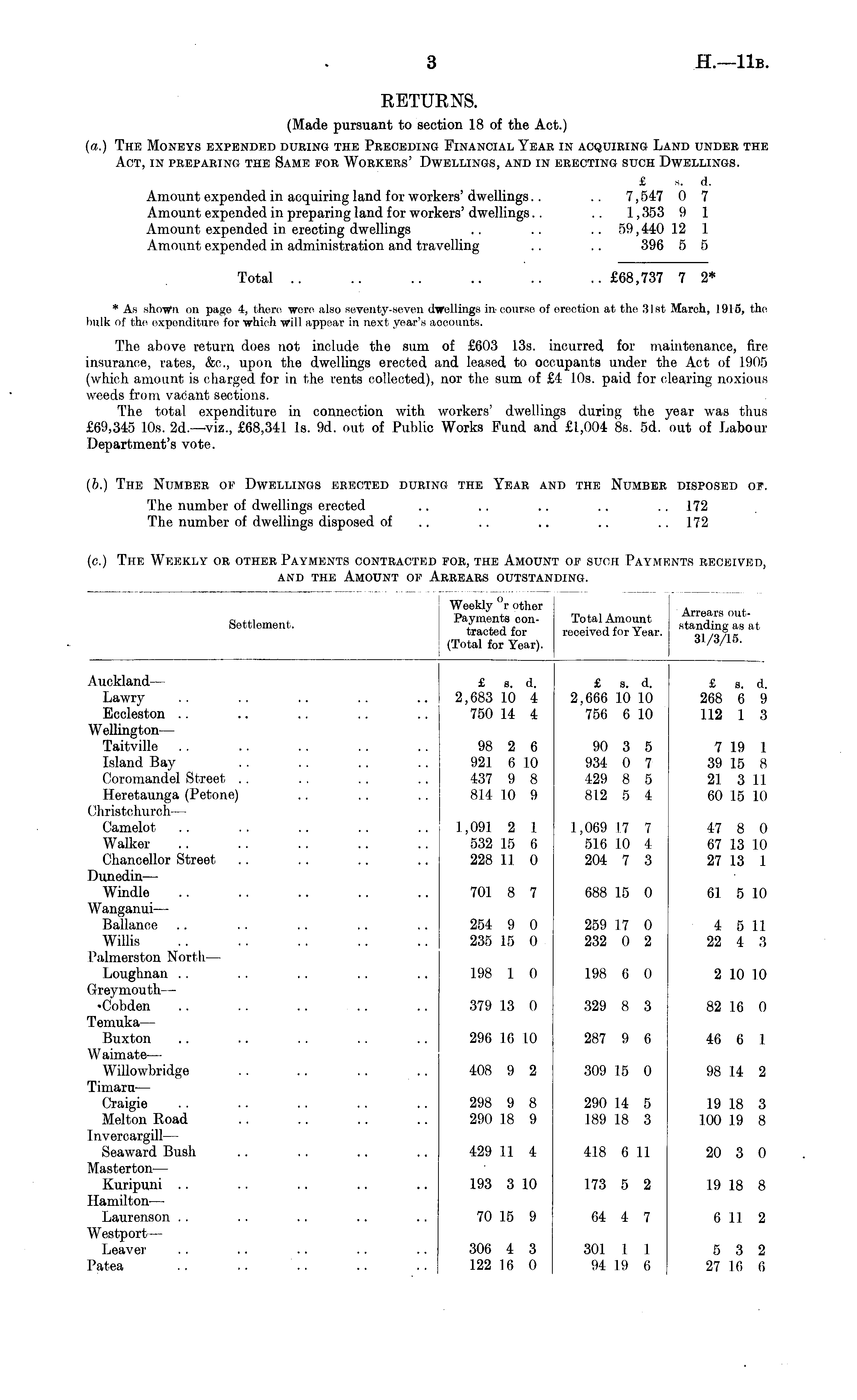 RETURNS. (Made pursuant to section 18 of the Act.) (a.) The Moneys expended during the Preceding Financial Year in acquiring Land under the Act, in preparing the Same for Workers' Dwellings, and in erecting such Dwellings. £ s. d. Amount expended in acquiring land for workers' dwellings.. .. 7,547 0 7 Amount expended in preparing land for workers' dwellings.. .. 1,353 9 1 Amount expended in erecting dwellings .. .. .. 59,440 12 1 Amount expended in administration and travelling .. .. 396 5 5 Total £68,737 7 2* * As shown, on page 4, there wore also seventy-seven dwellings in-course of erection at the 31st March, 1915, the bulk of the expenditure for which will appear in next year's aocounts. The above return does not include the sum of £603 13s. incurred for maintenance, fire insurance, rates, &c, upon the dwellings erected and leased to occupants under the Act of 1905 (which amount is charged for in the rents collected), nor the sum of £4 10s. paid for clearing noxious weeds from vacant sections. The total expenditure in connection with workers' dwellings during the year was thus £69,345 10s. 2d.—viz., £68,341 is. 9d. out of Public Works Fund and £1,004 Bs. sd. out of Labour Department's vote. (b.) The Number of Dwellings erected during the Year and the Number disposed of. The number of dwellings erected .. .. .. .. 172 The number of dwellings disposed of .. .. .. .. 172