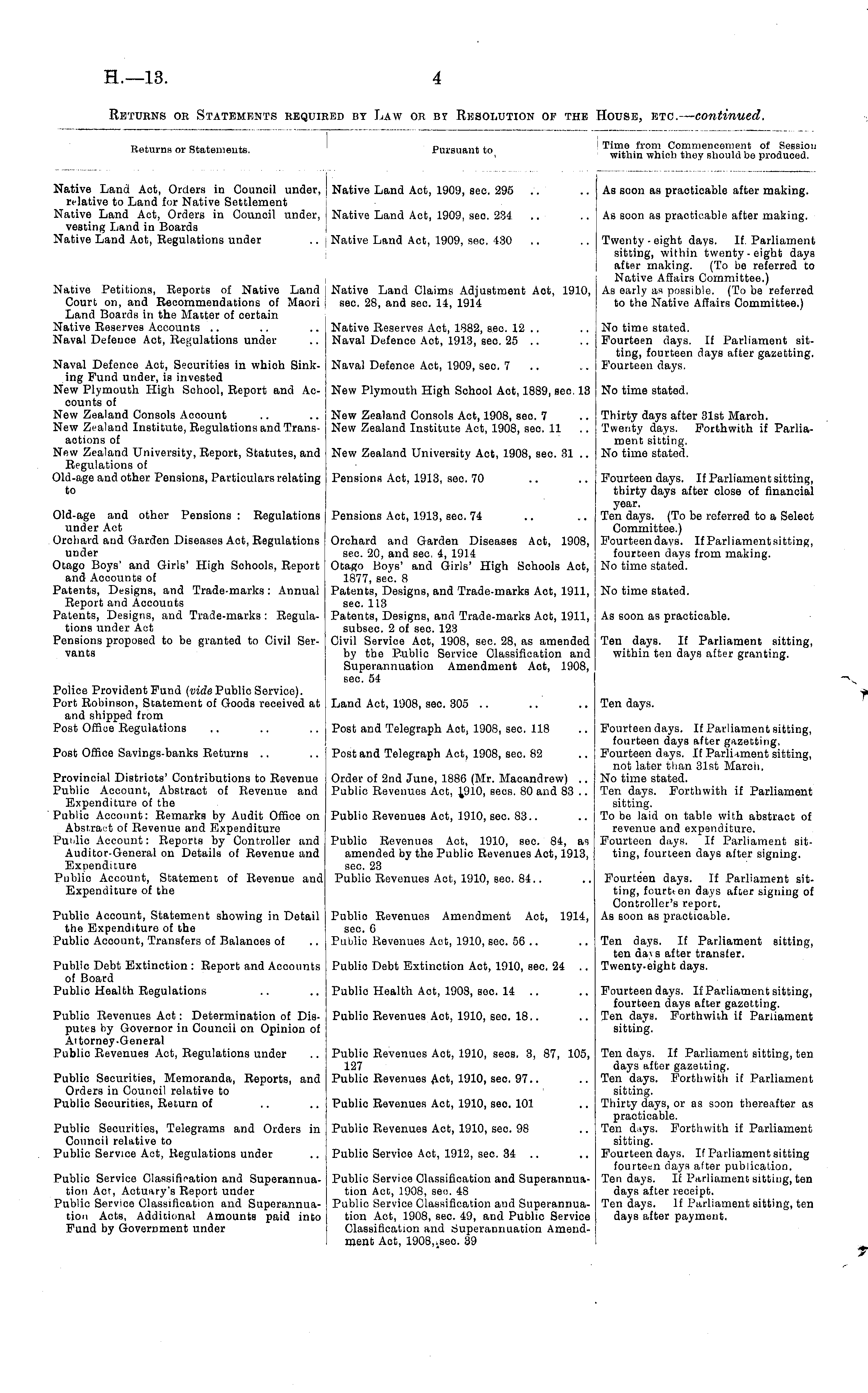 Returns or Statements. Pursuant to Time from Commencement of Session within whiob they should bo produced. Native Land Act, Orders in Council under, relative to Land for Native Settlement Native Land Act, Orders in Council under, vesting Land in Boards Native Land Aot, Regulations under Native Land Act, 1909, sec. 295 .. As soon as practicable after making. Native Land Act, 1909, see. 234 Aβ soon as practicable) after making. Native Petitions, Reports of Native Land Court on, and Recommendations of Maori Land Boards in the Matter of certain Native Reserves Accounts Naval Defence Act, Regulations under Native Land Act, 1909, sec. 430 Native Land Claims Adjustment Aot, 1910, sec. 28, and sec. 14, 1914 Twenty - eight days. If. Parliament sitting, within twenty-eight days after making. (To be referred to Native Affairs Committee.) j Aβ early as possible. (To be referred to the Native Affairs Committee.) Native Reserves Act, 1882, sec. 12 .. Naval Defence Aot, 1913, sec. 25 .. No time stated. Fourteen days. If Parliament sitting, fourteen days after gazetting. Fourteen days. Naval Defence Act, Securities in whiob Sinking Fund under, is invested New Plymouth High School, Report and Accounts of New Zealand Consols Account .. New Zealand Institute, Regulations and Transactions of New Zealand University, Report, Statutes, and Regulations of Old-age and other Pensions, Particulars relating to Naval Defence Act, 1909, sec. 7 .. New Plymouth High School Aot, 1889, sec. 13 No time stated. New Zealand Consols Act, 1908, see. 7 New Zealand Institute Act, 1908, sec 11 Thirty days after 31st March. Twenty days. Forthwith if Parliament sitting. No timo stated. New Zealand University Act, 1908, sec. 31 .. Old-age and other Pensions : Regulations I under Act Orchard and Garden Diseases Act, Regulations under Otago Boys' and Girls' High Schools, Report and Accounts of Patents, Designs, and Trade-marks : Annual j Report and Accounts Patents, Designs, and Trade-marks: Regulations under Act Pensions proposed to be granted to Civil Servants Pensions Act, 1913, sec. 70 Pensions Act, 1913, sec. 74 Fourteen days. If Parliament sitting, thirty days after close of financial year. Ten days. (To be referred to a Select Committee.) Fourteen days. If Parliament sitting, fourteen days from making. No time stated. Orchard and Garden Diseases Act, 1908, sec. 20, and sec, 4, 1914 Otago Boys' and Girls' High Schools Aot, 1877, sec. 8 Patents, Designs, and Trademarks Act, 1911, sec. 113 Patents, Designs, and Trade-marks Aot, 1911, subsec. 2 of sec. 123 Civil Service Aot, 1908, sec. 28, as amended by the Public Service Classification and Superannuation Amendment Act, 1908, sec. 54 No time stated. As soon as practicable. Ten days. If Parliament sitting, within ten days after granting. Police Provident Fund (vide Public Service). Port Robinson, Statement of Goods received at and shipped from Post Office Regulations Land Act, 1908, sec. 305 .. Ten days. Post Office Savings-banks Returns Provincial Districts' Contributions to Revenue Publio Account, Abstract of Revenue and Expenditure of the Public Account: Remarks by Audit Office on Abstract of Revenue and Expenditure Public Account: Reports by Controller and Auditor-General on Details of Revenue and Expenditure Publio Account, Statement of Revenue and Expenditure of the Post and Telegraph Act, 1908, sec. 118 Post and Telegraph Act, 1908, sec. 82 Order of 2nd June, 1886 (Mr. Macandrew) .. Public Revenues Act, sees. 80 and 83 .. Fourteen days. If Parliament sitting, fourteen days after gazetting. Fourteen days. If Parli iment sitting, not later than 31st March. No time stated. Ten days. Forthwith if Parliament sitting. To be laid on table with abstract of revenue and expenditure. Fourteen days. If Parliament sitting, fourteen days after signing. Public Revenues Act, 1910, sec. 83.. Public Revenues Aot, 1910, sec. 84, as amended by the Public Rovenues Act, 1913, sec. 23 Public Revenues Act, 1910, sec. 84.. Publio Revenues Amendment Act, 1914, sec. G Publio Revenues Act, 1910, see. 56 .. Fourteen days. If Parliament sitting, fourteen days after signing of Controller's report. As soon as practicable. Public Account, Statement showing in Detail the Expenditure of the Publio Account, Transfers of Balances of Public Debt Extinction : Report and Accounts of Board Public Health Regulations Ten days. If Parliament Bitting, ten da>s after transfer. Twenty-eight days. Publio Debt Extinction Act, 1910, sec. 24 .. Public Revenues Aot: Determination of Disputes by Governor in Council on Opinion of Attorney-General Public Revenues Aot, Regulations under Publio Health Act, 1908, soc. 14 .. Public Revenues Act, 1910, sec. 18.. Fourteen days. If Parliament sitting, fourteen days after gazetting. Ten days. Forthwith if Parliament sitting. Public Revenues Aot, 1910, seos, 3, 87, 105, 127 Public Revenues Act, 1910, sec. 97.. Ten days. If Parliament sitting, ten days after gazetting. Ten days. Forthwith if Parliament sitting. Thirty days, or as soon thereafter as practicable. Ten days. Forthwith if Parliament sitting. Fourteen days. If Parliament sitting fourteen days after publication. Ten days. If Parliament sitting, ten days after receipt. Ten days. If Parliament sitting, ten days after payment. Public Securities, Memoranda, Reports, and Orders in Counoil relative to Public Securities, Return of Public Revenues Act, 1910, sec. 101 Public Securities, Telegrams and Orders in Council relative to Public Service Act, Regulations under Public Revenues Act, 1910, sec. 98 Public Service Act, 1912, sec. 34 .. Public Service Classification and Superannuation Acr, Actuary's Report under Public Service Classification and Superannuation Acts, Additional Amounts paid into Fund by Government under Public Service Classification and Superannuation Act, 1908, se«. 48 Publio Service Classification and Superannuation Act, 1908, sec. 49, and Public Service Classification and Superannuation Amendment Act, 1908,..sec. 3